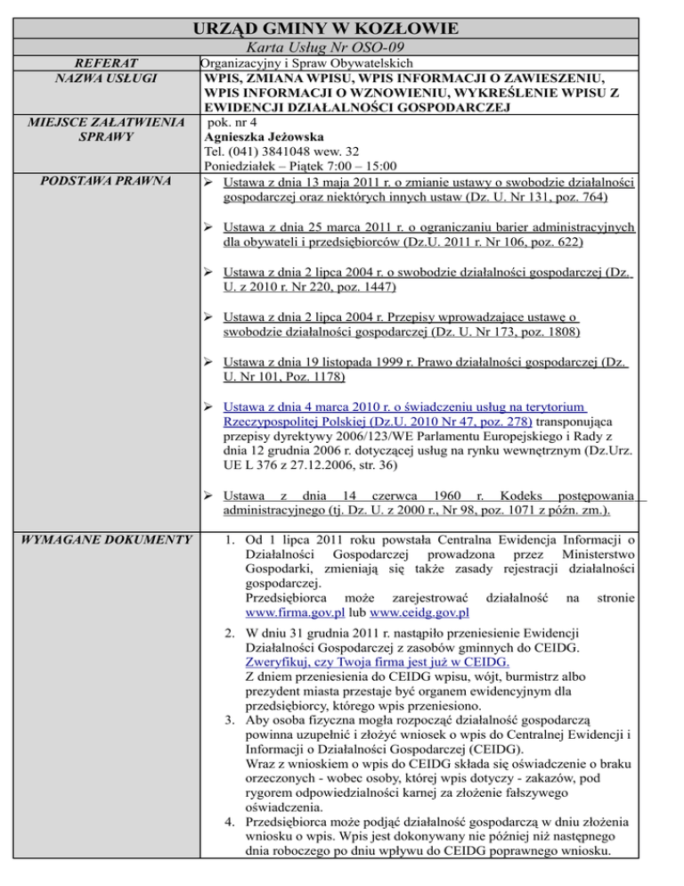 URZĄD GMINY W KOZŁOWIE Karta Usług Nr OSO-09 REFERAT NAZWA USŁUGI MIEJSCE ZAŁATWIENIA SPRAWY PODSTAWA PRAWNA Organizacyjny i Spraw Obywatelskich WPIS, ZMIANA WPISU, WPIS INFORMACJI O ZAWIESZENIU, WPIS INFORMACJI O WZNOWIENIU, WYKREŚLENIE WPISU Z EWIDENCJI DZIAŁALNOŚCI GOSPODARCZEJ pok. nr 4 Agnieszka Jeżowska Tel. (041) 3841048 wew. 32 Poniedziałek – Piątek 7:00 – 15:00 ➢ Ustawa z dnia 13 maja 2011 r. o zmianie ustawy o swobodzie działalności gospodarczej oraz niektórych innych ustaw (Dz. U. Nr 131, poz. 764) ➢ Ustawa z dnia 25 marca 2011 r. o ograniczaniu barier administracyjnych dla obywateli i przedsiębiorców (Dz.U. 2011 r. Nr 106, poz. 622) ➢ Ustawa z dnia 2 lipca 2004 r. o swobodzie działalności gospodarczej (Dz. U. z 2010 r. Nr 220, poz. 1447) ➢ Ustawa z dnia 2 lipca 2004 r. Przepisy wprowadzające ustawę o swobodzie działalności gospodarczej (Dz. U. Nr 173, poz. 1808) ➢ Ustawa z dnia 19 listopada 1999 r. Prawo działalności gospodarczej (Dz. U. Nr 101, Poz. 1178) ➢ Ustawa z dnia 4 marca 2010 r. o świadczeniu usług na terytorium Rzeczypospolitej Polskiej (Dz.U. 2010 Nr 47, poz. 278) transponująca przepisy dyrektywy 2006/123/WE Parlamentu Europejskiego i Rady z dnia 12 grudnia 2006 r. dotyczącej usług na rynku wewnętrznym (Dz.Urz. UE L 376 z 27.12.2006, str. 36) ➢ Ustawa z dnia 14 czerwca 1960 r. Kodeks postępowania administracyjnego (tj. Dz. U. z 2000 r., Nr 98, poz. 1071 z późn. zm.). WYMAGANE DOKUMENTY 1. Od 1 lipca 2011 roku powstała Centralna Ewidencja Informacji o Działalności Gospodarczej prowadzona przez Ministerstwo Gospodarki, zmieniają się także zasady rejestracji działalności gospodarczej. Przedsiębiorca może zarejestrować działalność na stronie www.firma.gov.pl lub www.ceidg.gov.pl 2. W dniu 31 grudnia 2011 r. nastąpiło przeniesienie Ewidencji Działalności Gospodarczej z zasobów gminnych do CEIDG. Zweryfikuj, czy Twoja firma jest już w CEIDG. Z dniem przeniesienia do CEIDG wpisu, wójt, burmistrz albo prezydent miasta przestaje być organem ewidencyjnym dla przedsiębiorcy, którego wpis przeniesiono. 3. Aby osoba fizyczna mogła rozpocząć działalność gospodarczą powinna uzupełnić i złożyć wniosek o wpis do Centralnej Ewidencji i Informacji o Działalności Gospodarczej (CEIDG). Wraz z wnioskiem o wpis do CEIDG składa się oświadczenie o braku orzeczonych - wobec osoby, której wpis dotyczy - zakazów, pod rygorem odpowiedzialności karnej za złożenie fałszywego oświadczenia. 4. Przedsiębiorca może podjąć działalność gospodarczą w dniu złożenia wniosku o wpis. Wpis jest dokonywany nie później niż następnego dnia roboczego po dniu wpływu do CEIDG poprawnego wniosku. Przedsiębiorca ma prawo we wniosku o wpis do CEIDG określić późniejszy dzień podjęcia działalności gospodarczej niż dzień złożenia wniosku. 5. Numerem identyfikacyjnym przedsiębiorcy w CEIDG jest numer identyfikacji podatkowej (NIP). W momencie założenie jednoosobowej działalności gospodarczej prywatny numer NIP osoby fizycznej staje się numerem firmy. Jeżeli straciliśmy potwierdzenie nadania numeru NIP, to w Urzędzie Skarbowym składamy formularz NIP-5 w celu otrzymania duplikatu. Jeżeli nie pamiętasz nr NIP należy wystąpić o duplikat. 6. Zaświadczeniem o wpisie w CEIDG jest wydruk ze strony internetowej CEIDG. Organy administracji publicznej nie mogą domagać się od przedsiębiorców okazywania, przekazywania lub załączania do wniosków zaświadczeń o wpisie w CEIDG. Nie ma obowiązku przedkładania w kontaktach z organami administracji publicznej zaświadczeń o nadaniu numeru NIP i REGON w sytuacji, gdy odpowiednie numery znalazły się we wniosku, w innych przypadkach zamieniono zaświadczenie na oświadczenie. 7. Integralną częścią wniosku o wpis do CEIDG jest żądanie: 1. wpisu albo zmiany wpisu do krajowego rejestru urzędowego podmiotów gospodarki narodowej (REGON); 2. zgłoszenia identyfikacyjnego albo aktualizacyjnego, o którym mowa w przepisach o zasadach ewidencji i identyfikacji podatników i płatników; 3. zgłoszenia płatnika składek albo jego zmiany w rozumieniu przepisów o systemie ubezpieczeń społecznych albo zgłoszenia oświadczenia o kontynuowaniu ubezpieczenia społecznego rolników w rozumieniu przepisów o ubezpieczeniu społecznym rolników, 4. przyjęcia oświadczenia o wyborze przez przedsiębiorcę formy opodatkowania podatkiem dochodowym od osób fizycznych albo wniosku o zastosowanie opodatkowania w formie karty podatkowej. Do wniosku o wpis do CEIDG przedsiębiorca może dołączyć zgłoszenie rejestracyjne lub aktualizacyjne, o których mowa w przepisach o podatku od towarów i usług. 8. Wniosek o wpis do ewidencji działalności gospodarczej wypełnia się również przy: • zmianie danych we wpisie do ewidencji działalności gospodarczej, • zawieszeniu wykonywania działalności gospodarczej, • wznowieniu wykonywania działalności gospodarczej, • zawiadomieniu o zaprzestaniu wykonywania działalności gospodarczej. OPŁATY ➢ Dowód osobisty - do wglądu. • Wniosek jest wolny od opłat. • Opłata skarbowa za złożenie dokumentu stwierdzającego udzielenie pełnomocnictwa lub prokury albo jego odpisu, wypisu lub kopii: 17 PLN. Z opłaty zwolnione są pełnomocnictwa udzielane: małżonkowi, wstępnemu, zstępnemu lub rodzeństwu albo gdy mocodawcą jest podmiot zwolniony od opłaty skarbowej. • Termin wniesienia opłaty: najpóźniej w dniu składania pełnomocnictwa. • Opłatę w wymaganej wysokości należy wpłacić na konto właściwego urzędu przelewem, przekazem pocztowym lub bezpośrednio w kasie urzędu. TERMIN ZAŁATWIENIA • • • SPOSÓB ODWOŁANIA UWAGI Wpis dokonywany jest z chwilą umieszczenia danych w CEIDG, nie później niż następnego dnia roboczego po dniu wpływu do CEIDG. Pod warunkiem, że wniosek jest złożony poprzez osobę uprawnioną i jest poprawny.Przedsiębiorca ma prawo we w