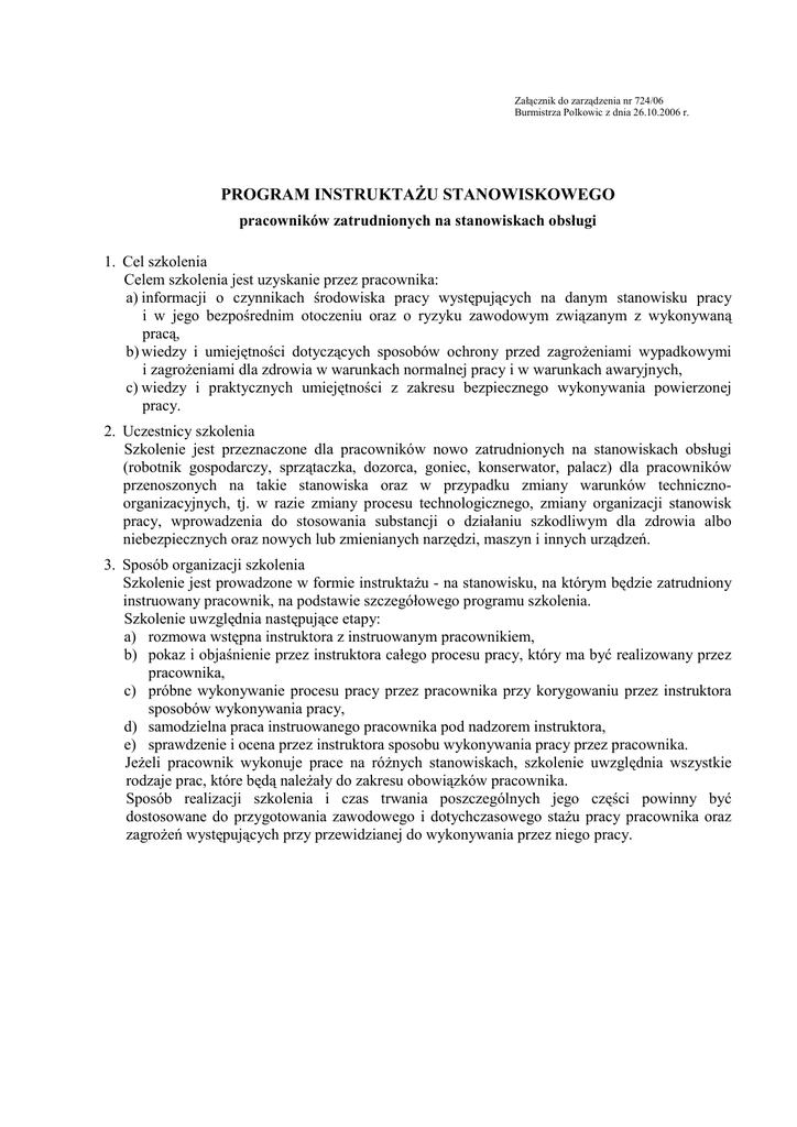 Załącznik do zarządzenia nr 724/06 Burmistrza Polkowic z dnia 26.10.2006 r. PROGRAM INSTRUKTAśU STANOWISKOWEGO pracowników zatrudnionych na stanowiskach obsługi 1. Cel szkolenia Celem szkolenia jest uzyskanie przez pracownika: a) informacji o czynnikach środowiska pracy występujących na danym stanowisku pracy i w jego bezpośrednim otoczeniu oraz o ryzyku zawodowym związanym z wykonywaną pracą, b) wiedzy i umiejętności dotyczących sposobów ochrony przed zagroŜeniami wypadkowymi i zagroŜeniami dla zdrowia w warunkach normalnej pracy i w warunkach awaryjnych, c) wiedzy i praktycznych umiejętności z zakresu bezpiecznego wykonywania powierzonej pracy. 2. Uczestnicy szkolenia Szkolenie jest przeznaczone dla pracowników nowo zatrudnionych na stanowiskach obsługi (robotnik gospodarczy, sprzątaczka, dozorca, goniec, konserwator, palacz) dla pracowników przenoszonych na takie stanowiska oraz w przypadku zmiany warunków technicznoorganizacyjnych, tj. w razie zmiany procesu technologicznego, zmiany organizacji stanowisk pracy, wprowadzenia do stosowania substancji o działaniu szkodliwym dla zdrowia albo niebezpiecznych oraz nowych lub zmienianych narzędzi, maszyn i innych urządzeń. 3. Sposób organizacji szkolenia Szkolenie jest prowadzone w formie instruktaŜu - na stanowisku, na którym będzie zatrudniony instruowany pracownik, na podstawie szczegółowego programu szkolenia. Szkolenie uwzględnia następujące etapy: a) rozmowa wstępna instruktora z instruowanym pracownikiem, b) pokaz i objaśnienie przez instruktora całego procesu pracy, który ma być realizowany przez pracownika, c) próbne wykonywanie procesu pracy przez pracownika przy korygowaniu przez instruktora sposobów wykonywania pracy, d) samodzielna praca instruowanego pracownika pod nadzorem instruktora, e) sprawdzenie i ocena przez instruktora sposobu wykonywania pracy przez pracownika. JeŜeli pracownik wykonuje prace na róŜnych stanowiskach, szkolenie uwzględnia wszystkie rodzaje prac, które będą naleŜały do zakresu obowiązków pracownika. Sposób realizacji szkolenia i czas trwania poszczególnych jego części powinny być dostosowane do przygotowania zawodowego i dotychczasowego staŜu pracy pracownika oraz zagroŜeń występujących przy przewidzianej do wykonywania przez niego pracy. 4. Ramowy program szkolenia Lp. Temat szkolenia Liczba* godzin 1. 2. 3. 1. Przygotowanie pracownika do wykonywania określonej pracy, w tym w szczególności: a) omówienie warunków pracy z uwzględnieniem: - elementów pomieszczenia pracy, w którym pracownik ma pracować, mających wpływ na warunki pracy pracownika (np. oświetlenie ogólne, ogrzewanie, wentylacja, urządzenia techniczne, urządzenia ochronne), - elementów stanowiska roboczego mających wpływ na bezpieczeństwo i higienę pracy (np. pozycja przy pracy, oświetlenie miejscowe, wentylacja miejscowa, urządzenia zabezpieczające, ostrzegawcze i sygnalizacyjne, urządzenia, narzędzia i materiały), - przebiegu procesu pracy na stanowisku pracy w nawiązaniu do działalności w całej komórce organizacyjnej i zakładzie pracy, b) omówienie czynników środowiska pracy występujących przy określonych czynnościach na stanowisku pracy oraz zagroŜeń, jakie mogą stwarzać te czynniki, wyników oceny ryzyka zawodowego związanego z wykonywaną pracą i sposobów ochrony przed zagroŜeniami, a takŜe zasad postępowania w razie wypadku lub awarii, c) przygotowanie wyposaŜenia stanowiska roboczego do wykonywania określonego zadania. 2. Pokaz przez instruktora sposobu wykonywania pracy na stanowisku pracy zgodnie z przepisami i zasadami bezpieczeństwa i higieny pracy, z uwzględnieniem metod bezpiecznego wykonywania poszczególnych czynności i ze szczególnym zwróceniem uwagi na czynności trudne i niebezpieczne. 0,5 3. Próbne wykonanie zadania przez pracownika pod kontrolą instruktora 0,5 4. Samodzielna praca pracownika pod nadzorem instruktora 4 5. Omówienie i ocena przebiegu wykonywania pracy przez pracownika 1 minimum Razem: *) 2 8 W godzinach lekcyjnych trwających 45 minut. 2 5. Szczegółowy program szkolenia Lp. Temat szkolenia Liczba* godzin 1. 2. 3. Przygotowanie pracownika do wykonywania określonej pracy, w tym w szczególności: a) omówienie warunków pracy z uwzględnieniem elementów pomieszczenia pracy, w którym pracownik ma pracować, mających wpływ na warunki pracy pracownika np.: - oświetlenie dzienne i elektryczne, - ogrzewanie, - wentylacja mechaniczna i naturalna, - drogi komunikacyjne wewnętrzne i zewnętrzne, - urządzenia techniczne, - urządzenia ochronne, b) omówienie warunków pracy z uwzględnieniem elementów stanowiska roboczego mających wpływ na bezpieczeństwo i higienę pracy w zaleŜności od zakresu i charakteru wykonywanych przez instruowanego pracownika prac tj.: - prace porządkowe wewnątrz budynku, - prace porządkowe na zewnątrz budynku, - obsługa urządzeń biurowych (kserokopiarka, bindownica, gilotyna, niszczarka) - prace związane z przygotowywaniem drobnych poczęstunków (w tym gorących napojów), - prace związane z doręczaniem przesyłek listowych i paczek oraz ich wysyłką i odbiorem, - przeglądy budynków i pomieszczeń, - przeglądy posesji, - drobne prace stolarskie i ślusarskie, - drobne prace hydrauliczne, - drobne prace murarskie i malarskie wewnętrzne, - prace transportowe, - prace przy pomocy elektronarzędzi, - prace związane z obsługą i konserwacją kotłów c.o., c) omówienie przebiegu procesu pracy na stanowisku z wyszczególnieniem kolejności wykonywania poszczególnych operacji w zaleŜności od rodzaju wykonywanych prac, d) omówienie ryzyka zawodowego związanego z wykonywaną pracą, przedstawienie czynności przy których ono występuje, wielkości oszacowanego ryzyka i działań profilaktycznych ograniczających ryzyko - na podstawie opracowanej dokumentacji. e) omówienie prac szczególnie niebezpiecznych w przypadku ich wykonywania, om