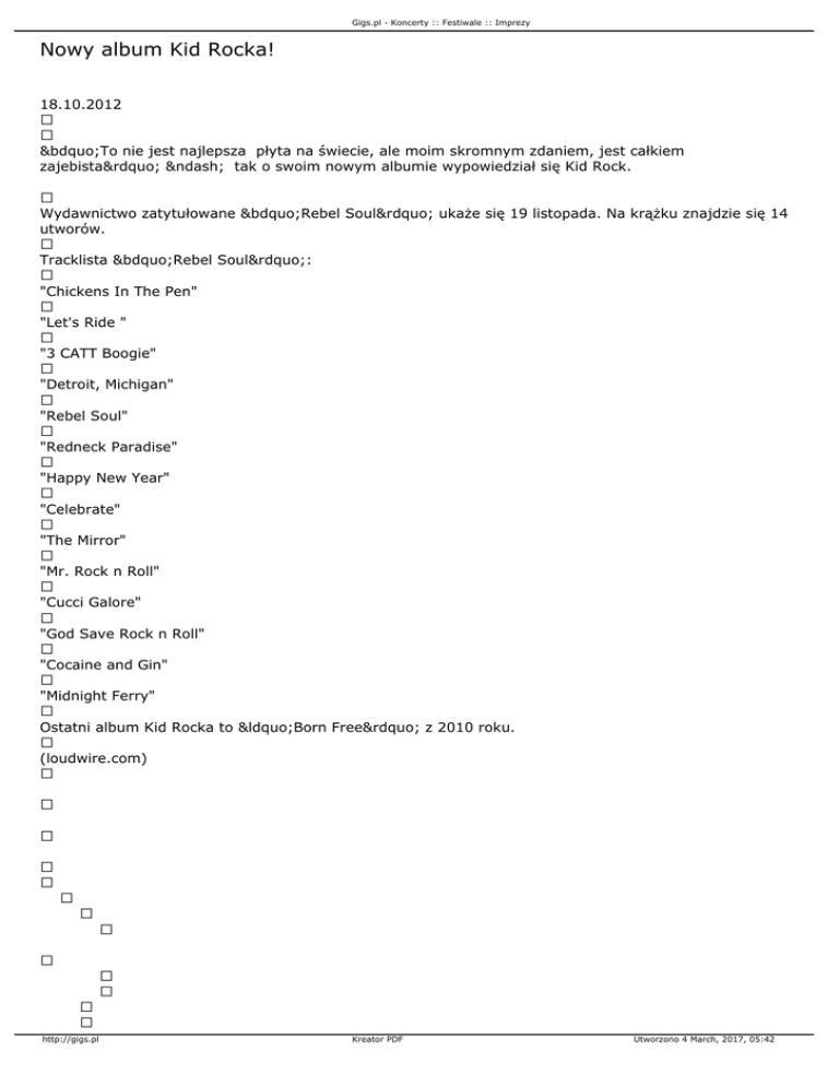 Gigs.pl - Koncerty :: Festiwale :: Imprezy Nowy album Kid Rocka! 18.10.2012 „To nie jest najlepsza płyta na świecie, ale moim skromnym zdaniem, jest całkiem zajebista” – tak o swoim nowym albumie wypowiedział się Kid Rock. Wydawnictwo zatytułowane „Rebel Soul” ukaże się 19 listopada. Na krążku znajdzie się 14 utworów. Tracklista „Rebel Soul”: "Chickens In The Pen" "Let's Ride " "3 CATT Boogie" "Detroit, Michigan" "Rebel Soul" "Redneck Paradise" "Happy New Year" "Celebrate" "The Mirror" "Mr. Rock n Roll" "Cucci Galore" "God Save Rock n Roll" "Cocaine and Gin" "Midnight Ferry" Ostatni album Kid Rocka to “Born Free” z 2010 roku. (loudwire.com) http://gigs.pl Kreator PDF Utworzono 4 March, 2017, 05:42 Gigs.pl - Koncerty :: Festiwale :: Imprezy http://gigs.pl Kreator PDF Utworzono 4 March, 2017, 05:42