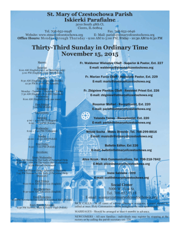 St. Mary of Czestochowa Parish Iskierki Parafialne 3010 South 48th Ct. Cicero, IL 60804 Tel. 708-652-0948 Fax. 708-652-0646 Website: www.stmaryofczestochowa.org E- Mail: [email protected] Office Hours: Mo n day thr ou gh Thu r sday - 9:00 AM to 5:00 PM; Friday - 10:30 AM to 6:30 PM Thirty-Third Sunday in Ordinary Time November 15, 2015 Masses: Saturday 8.00 AM (English every 1st Saturday only) 5:00 PM (English), 6:30 PM (Polish) Sunday 8:30 AM (English), 10:30 AM (Polish), 12:30 PM & 4:00 PM (Spanish) Fr. Waldemar Wieladek CSsR - Superior & Pastor, Ext. 227 E-mail: [email protected] Fr. Marian Furca CSsR - Associate Pastor, Ext. 229 E-mail: [email protected] Weekdays Monday - Tuesday - Thursday - Friday 7:30 AM (English), 8:15 AM (Spanish) Wednesday 8:00 AM (English) (only one mass) Fr. Zbigniew Pienkos CSsR - Resident Priest Ext. 226 E-mail: [email protected] First Fridays 7:00 PM (Polish) Rosamar Mallari - Receptionist, Ext. 220 E-mail: [email protected] Confessions: Saturday 4:00 – 4:45 PM (Trilingual) 6:00 — 6:30PM (Polish) Wednesday 6:00 – 7:40 PM (Trilingual) Sunday 10:00 – 10:30 AM (Polish) First Friday 6:30 – 7:00 PM (Polish) Devotions: Every Wednesday 8:30AM Novena to Our Lady of Perpetual Help 8:30 AM - 7:00 PM The entire day of adoration of the Blessed Sacrament 7:00 PM Prayer Group-Adoration (Spanish) 7:45 PM Novena to Our Lady of Perpetual Help (Spanish) First Fridays 8:00-8:10 AM Adoration (English) First Saturdays 8:30-9:00 AM Adoration (English) Every Saturdays 6:30PM Novena to Our Lady of Perpetual Help (Polish) Every Fourth Saturday 6:30 PM Novena, Mass & Prayer Vigil (Polish) Yolanda Torres - Receptionist, Ext. 220 E-mail: [email protected] Witold Socha - Music Director, Tel. 708-299-8816 E-mail: [email protected] Bulletin Editor, Ext 220 E-mail: [email protected] Alice Krzak - Web Communications, Tel. 708-218-7842 E-Mail: [email protected] Irene Saldaña - CCD E-mail: [email protected] Social Center 5000 W. 31st St. Tel. 708-652-7118 E-mail: [email protected] SICK CALLS - In all cases of serious illness or accidents, a priest should be called at once. Holy Communion will be brought to the sick upon request. MARRIAGES - Should be arranged at least 6 months in advance. NEWCOMERS - All new families / individuals may register by stopping at the rectory or by calling the parish secretary ext. 220. Sunday Iskierki Parafialne November 15, Thirty-Third Sunday in Ordinary Time 8:30 †Sr. M. Judith Moran, SCZ (Hennessy family) 10:00 Wypominki 10:30 †Antonina Pawlikowska †Roman Ptak, Edward Ptak (Rodzina) †Stanisław, Adolfina, Jan Krasucki w 10 rocz. śm. (Córka i Wnuczka) †Maria Warias w 7-my dzień po śmieci †Aniela Zięder (Siostrzenica z Rodziną) †Maria Ratułowska w 7-ą rocz. śm. †Zdzisław Bednarczyk w 24-tą rocz. śm. †Wiesław Turek w 12-tą rocz. śm. 12:30 †María Dolores y Francisco Arroyo, eterno descanso (familia) 4:00 Por la salud espiritual para Eloy November 16, Monday, Saint Margaret of Scotland; Saint Gertrude, Virgin 7:30 †Rose Krolak (family) 8:15 †Por todas las Almas Inscritas en el Libro de la Memoria November 17, Tuesday, Saint Elizabeth of Hungary, Religious 7:30 †Chester Kraska (Kraska family) 8:15 Feligreses November 18, Wednesday, The Dedication of the Basilicas of Saints Peter and Paul, Apostles; Saint Rose Philippine Duchesne, Virgin 8 :00 †Cecilia Kraska Spaniak (Kraska family) 8:30 Eucharistic Adoration until 7:00PM 7PM Circulo de Oracion 7:45 Novena a Nuestra Sra. Del Perpetuo Socorro November 19, Thursday, Weekday in Ordinary Time 7:30 Parishioners 8:15 Por los Feligreses November 20, Friday, Weekday in Ordinary Time 7:30 †Holy Souls in the Book of Remembrance 8:15 †Por las almas inscritas en el Libro de la Memoria November 21, Saturday, The Presentation of the Blessed Virgin Mary 11:00 Quinceañera: Cristina Cabrera 3:00 Wedding: Matthew Krezel and Nora S. Rubi 5:00 †Valvina Duarte (Isabel Jaramillo) †Yolanda Duarte (Isabel Jaramillo) 6:30 W intencjach próśb i podziękowań do M. B. Nieustającej Pomocy W intencji Radia Maryja i TV-TRWAM, wszystkich dziel powstałych przy Radiu Maryja oraz za wszystkich którzy posługują w tych dziełach Lector Schedule Saturday, November 21 5pm Gladis Trigueros Marie Jarding Sunday, November 22 8:30 John Kociolko 10:30 Jarek Szyszlak, Krzysztof Zborowski 12:30 Juan Rodriguez, Juana Salas Marisol Ortiz 4:00 Humberto Tellez, Lourdes Gonzalez, Enrique Garcia Eucharistic Minister Saturday, November 21 5:00 PM Joanne Napoletano, Larry Napoletano 6:30 PM Jan Rozanski Sunday, November 22 8:30 Ed Hennessy, Georgia Czarnecki, Michele Cison-Carlson 10:30 Krzysztof Odbierzychleb, Jan Radomyski Jan Rozanski 12:30 Javier Hernandez, Linda Hernandez Victor Ibarra, Olivia Ortiz 4:00 Rosalina Martinez, Angeles Abundis Antonio Abundis There is a promise of marriage between lll. Nora Rubi & Matthew R. Krezel We welcome in Baptism: Leslie Ruby Castillo Charlotte Sofia Jakab Frank Lukaszczyk Michael Briones Sherovski Eternal rest……………… †Jozef Kozak †Edward Borodziński May God Who called you, take you home! St. Mary of Czestochowa Sunday Collection, November 08, 2015 Nov. 07 The next CCD class is schedule for Saturday, November 21 from 8-10 A.M Please arrive on time. The students are invited to bring one can of food to share with the needy for the Thanksgiving Food Drive. Students should bring their canned goods donation to the school when they attend classes on November 21st. On December 6, 2015 we welcome “A visit from St. Nicholas” at 9:30 A.M. adults will enjoy coffee and cake while children have pictures taken with St. Nick. In addition to our special guest St. Nick a “Wigilia” buffet luncheon will be available after 11:30 along with Split the Pot & Raffle Prizes. The event will take place in Makuch Hall (school) Hall. More information coming. Christmas wafers (Oplatki) will be available beginning this weekend until December 20. Donations remain th