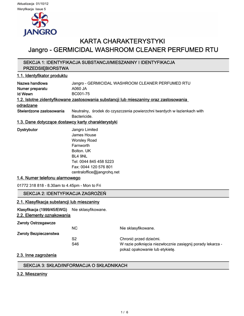 Aktualizacja 01/10/12 Weryfikacja Issue 5 KARTA CHARAKTERYSTYKI Jangro - GERMICIDAL WASHROOM CLEANER PERFUMED RTU SEKCJA 1: IDENTYFIKACJA SUBSTANCJI/MIESZANINY I IDENTYFIKACJA PRZEDSIĘBIORSTWA 1.1. Identyfikator produktu Nazwa handlowa Numer preparatu Id Wewn Jangro - GERMICIDAL WASHROOM CLEANER PERFUMED RTU A060 JA BC001-75 Stwierdzone zastosowania Neutralny, środek do czyszczenia powierzchni twardych w łazienkach with Bactericide. 1.2. Istotne zidentyfikowane zastosowania substancji lub mieszaniny oraz zastosowania odradzane 1.3. Dane dotyczące dostawcy karty charakterystyki Dystrybutor Jangro Limited James House Worsley Road Farnworth Bolton. UK BL4 9NL Tel: 0044 845 458 5223 Fax: 0044 120 576 801 [email protected] 1.4. Numer telefonu alarmowego 01772 318 818 - 8.30am to 4.45pm - Mon to Fri SEKCJA 2: IDENTYFIKACJA ZAGROŻEŃ 2.1. Klasyfikacja substancji lub mieszaniny Klasyfikacja (1999/45/EWG) 2.2. Elementy oznakowania Zwroty Ostrzegawcze Zwroty Bezpieczenstwa 2.3. Inne zagrożenia Nie sklasyfikowane. NC Nie sklasyfikowane. S2 S46 Chronić przed dziećmi. W razie połknięcia niezwłocznie zasięgnij porady lekarza pokaż opakowanie lub etykietę. SEKCJA 3: SKŁAD/INFORMACJA O SKŁADNIKACH 3.2. Mieszaniny 1/ 6 Jangro - GERMICIDAL WASHROOM CLEANER PERFUMED RTU ALKYL DIMETHYL BENZYL AMMONIUM CHLORIDE Numer CAS: 68424-85-1 0-1% Numer WE: 270-325-2 Klasyfikacja (WE 1272/2008) Acute Tox. 4 - H302 Acute Tox. 4 - H312 Skin Corr. 1B - H314 Aquatic Acute 1 - H400 Klasyfikacja (67/548/EWG) Xn;R21/22. C;R34. N;R50. Pełny tekst zwrotów wskazujących rodzaj zagrożenia (zwrotów R) i określeń zagrożeń jest przedstawiony w sekcji 16. Uwagi względem składu Zawiera składniki w stężeniach nie powodujących zagrożenia. SEKCJA 4: ŚRODKI PIERWSZEJ POMOCY 4.1. Opis środków pierwszej pomocy Wdychanie Nie dotyczy. Wdychanie mało prawdopodobne. W przypadku wdychania mgły z rozprysków: Przenieść poszkodowanego na świeże powietrze, aby odpoczął w spokoju. Spożycie NIE WYWOŁYWAĆ WYMIOTÓW! Wypić kilka szklanek wody albo mleka. W przypadku utrzymującego się dyskomfortu skontaktować się z lekarzem. Kontakt ze skórą Umyć skórę wodą z mydłem. Kontakt z oczami Niezwłocznie przemyć oczy dużą ilością wody, podnosząc powieki. 4.2. Najważniejsze ostre i opóźnione objawy oraz skutki narażenia Informacja ogólna Nasilenie opisanych objawów będzie różne, w zależności od stężenia substancji i długości okresu narażenia. Wdychanie Nie zanotowano szczególnych objawów. Spozycie Nie zanotowano szczególnych objawów. But - Może wywołać złe samopoczucie w przypadku spożycia. Kontakt ze skórą Nie zanotowano szczególnych objawów. But prolonged or excessively repeated skin contact could lead to removal of natural oils from skin. Kontakt z oczami Nie zanotowano szczególnych objawów. But prolonged eye contact may lead to the product affecting the natural lubrication provided by the mucous membranes. 4.3. Wskazania dotyczące wszelkiej natychmiastowej pomocy lekarskiej i szczególnego postępowania z poszkodowanym Leczyć objawowo. SEKCJA 5: POSTĘPOWANIE W PRZYPADKU POŻARU 5.1. Środki gaśnicze Środki gaśnicze Produkt nie jest łatwo palny. Przy doborze środków gaszenia pożaru uwzględnić ewentualną obecność innych środków chemicznych. 5.2. Szczególne zagrożenia związane z substancją lub mieszaniną Zagrożenia specyficzne Wskutek nagrzewania lub pożaru mogą wydzielać się szkodliwe pary/gazy. 2/ 6 Jangro - GERMICIDAL WASHROOM CLEANER PERFUMED RTU 5.3. Informacje dla straży pożarnej Środki ochrony personelu straży pożarnej W warunkach pożarowych stosować urządzenia oddechowe z własnym obiegiem powietrza i odzież ochronną na całe ciało. SEKCJA 6: POSTĘPOWANIE W PRZYPADKU NIEZAMIERZONEGO UWOLNIENIA DO ŚRODOWISKA 6.1. Indywidualne środki ostrożności, wyposażenie ochronne i procedury w sytuacjach awaryjnych Specjalna odzież ochronna nie jest wymagana. (Patrz pkt 8) 6.2. Środki ostrożności w zakresie ochrony środowiska O wycieku i niekontrolowanym zrzucie do cieków wodnych należy NATYCHMIAST poinformować odpowiedni organ nadzoru rzecznego albo inne właściwe władze. 6.3. Metody i materiały zapobiegające rozprzestrzenianiu się skażenia i służące do usuwania skażenia Niewielkie ilości można spłukać do kanalizacji dużą ilością wody. Duże zanieczyszczenia: Zebrać za pomocą urządzenia próżniowego albo chłonną substancją stałą, przechowywać w zamkniętym pojemniku do usunięcia. 6.4. Odniesienia do innych sekcji W sprawie indywidualnych środków ochrony - patrz pkt 8. SEKCJA 7: POSTĘPOWANIE Z SUBSTANCJAMI I MIESZANINAMI ORAZ ICH MAGAZYNOWANIE 7.1. Środki ostrożności dotyczące bezpiecznego postępowania Nie zanotowano szczególnych środków ostrożności przy stosowaniu preparatu. 7.2. Warunki bezpiecznego magazynowania, łącznie z informacjami dotyczącymi wszelkich wzajemnych niezgodności Przechowywać w umiarkowanej temperaturze, w suchym i dobrze wentylowanym miejscu. Przechowywać w oryginalnym opakowaniu. Przechowywać z dala od: Materiał utleniający. 7.3. Szczególne zastosowanie(-a) końcowe Stwierdzone zastosowania tego produktu są wyszczególnione w Sekcji 1.2. Opis Uzytkowania See Product Information Sheet & Label for detailed use of this product. SEKCJA 8: KONTROLA NARAŻENIA/ŚRODKI OCHRONY INDYWIDUALNEJ 8.1. Parametry dotyczące kontroli 8.2. Kontrola narażenia Techniczne środki ochrony Nie dotyczy Środki ochrony dróg oddechowych Ochrona dróg oddechowych nie jest wymagana. Środki ochrony rąk Nie odnotowano żadnych specyficznych środków ochronnych rąk, jednak zaleca się stosowanie ochrony skóry aby zapobiec usunięciu naturalnej powłoki skóry. Środki ochrony oczu Nie wymagane. Dodatkowe środki ochrony Nie wymagane. SEKCJA 9: WŁAŚCIWOŚCI FIZYCZNE I CHEMICZNE 3/ 6 Jangro - GERMICIDAL WASHROOM CLEANER PERFUMED RTU 9.1. Informacje na temat podstawowych 
