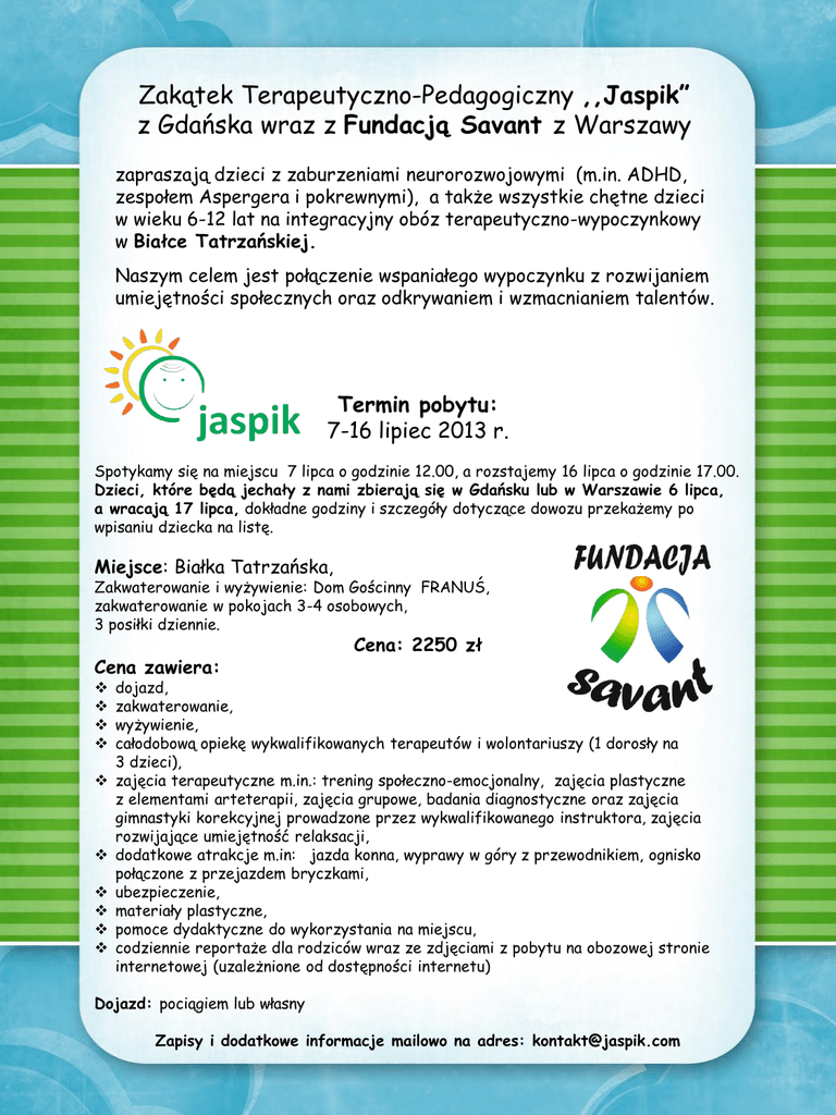 Zakątek Terapeutyczno-Pedagogiczny ,,Jaspik” z Gdańska wraz z Fundacją Savant z Warszawy zapraszają dzieci z zaburzeniami neurorozwojowymi (m.in. ADHD, zespołem Aspergera i pokrewnymi), a także wszystkie chętne dzieci w wieku 6-12 lat na integracyjny obóz terapeutyczno-wypoczynkowy w Białce Tatrzańskiej. Naszym celem jest połączenie wspaniałego wypoczynku z rozwijaniem umiejętności społecznych oraz odkrywaniem i wzmacnianiem talentów. Termin pobytu: 7-16 lipiec 2013 r. Spotykamy się na miejscu 7 lipca o godzinie 12.00, a rozstajemy 16 lipca o godzinie 17.00. Dzieci, które będą jechały z nami zbierają się w Gdańsku lub w Warszawie 6 lipca, a wracają 17 lipca, dokładne godziny i szczegóły dotyczące dowozu przekażemy po wpisaniu dziecka na listę. Miejsce: Białka Tatrzańska, Zakwaterowanie i wyżywienie: Dom Gościnny FRANUŚ, zakwaterowanie w pokojach 3-4 osobowych, 3 posiłki dziennie. Cena zawiera: Cena: 2250 zł dojazd, zakwaterowanie, wyżywienie, całodobową opiekę wykwalifikowanych terapeutów i wolontariuszy (1 dorosły na 3 dzieci), zajęcia terapeutyczne m.in.: trening społeczno-emocjonalny, zajęcia plastyczne z elementami arteterapii, zajęcia grupowe, badania diagnostyczne oraz zajęcia gimnastyki korekcyjnej prowadzone przez wykwalifikowanego instruktora, zajęcia rozwijające umiejętność relaksacji, dodatkowe atrakcje m.in: jazda konna, wyprawy w góry z przewodnikiem, ognisko połączone z przejazdem bryczkami, ubezpieczenie, materiały plastyczne, pomoce dydaktyczne do wykorzystania na miejscu, codziennie reportaże dla rodziców wraz ze zdjęciami z pobytu na obozowej stronie internetowej (uzależnione od dostępności internetu) Dojazd: pociągiem lub własny Zapisy i dodatkowe informacje mailowo na adres: [email protected] Zakątek Terapeutyczno-Pedagogiczny ,,Jaspik” z Gdańska wraz z Fundacją Savant z Warszawy zapraszają dzieci z zaburzeniami neurorozwojowymi (m.in. ADHD, zespołem Aspergera i pokrewnymi), a także wszystkie chętne dzieci w wieku 6-12 lat na integracyjny obóz terapeutyczno-wypoczynkowy w Grabowie koło Sulęczyna. Naszym celem jest połączenie wspaniałego wypoczynku z rozwijaniem umiejętności społecznych oraz odkrywaniem i wzmacnianiem talentów. Termin pobytu: 20-30 lipiec 2013 r. Spotykamy się na miejscu 20 lipca o godzinie 15. Pierwszy posiłek - kolacja, o godzinie 19, kończymy 30 lipca po obiedzie około godziny 14. Miejsce: Grabowo koło Sulęczyna, nad jeziorem Mausz, Zakwaterowanie i wyżywienie: Ośrodek wypoczynkowy “SKIERKA”, zakwaterowanie w domkach parterowych 5-cio osobowych, 4 posiłki dziennie - podwieczorek podawany do obiadu. Cena zawiera: Cena: 2250 zł zakwaterowanie, wyżywienie, opiekę wykwalifikowanych terapeutów i wolontariuszy (1 dorosły na 3 dzieci), zajęcia terapeutyczne m.in.: trening społeczno-emocjonalny, zajęcia plastyczne z elementami arteterapii, zajęcia sportowe, inne atrakcje m.in: jazda konna, wycieczka do Aquaparku w Kościerzynie, wycieczki piesze po okolicy, ognisko, ubezpieczenie, materiały plastyczne, pomoce dydaktyczne do wykorzystania na miejscu, dostęp do jeziora i możliwość korzystania z kajaków i łódek wiosłowych, wydzielone kąpielisko dla dzieci pod opieką ratownika, codziennie informacje dla rodziców wraz ze zdjęciami z pobytu na obozowej stronie internetowej (uzależnione od dostępności interentu). Dojazd: własny. Istnieje możliwość dowozu dzieci z Warszawy po indywidualnym uzgodnieniu. Zapisy i dodatkowe informacje mailowo na adres: [email protected]