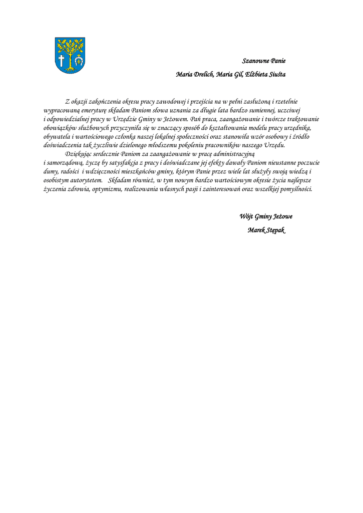Szanowne Panie Maria Drelich, Maria Gil, Elżbieta Siuśta Z okazji zakończenia okresu pracy zawodowej i przejścia na w pełni zasłużoną i rzetelnie wypracowaną emeryturę składam Paniom słowa uznania za długie lata bardzo sumiennej, uczciwej i odpowiedzialnej pracy w Urzędzie Gminy w Jeżowem. Pań praca, zaangażowanie i twórcze traktowanie obowiązków służbowych przyczyniła się w znaczący sposób do kształtowania modelu pracy urzędnika, obywatela i wartościowego członka naszej lokalnej społeczności oraz stanowiła wzór osobowy i źródło doświadczenia tak życzliwie dzielonego młodszemu pokoleniu pracowników naszego Urzędu. Dziękując serdecznie Paniom za zaangażowanie w pracę administracyjną i samorządową, życzę by satysfakcja z pracy i doświadczane jej efekty dawały Paniom nieustanne poczucie dumy, radości i wdzięczności mieszkańców gminy, którym Panie przez wiele lat służyły swoją wiedzą i osobistym autorytetem. Składam również, w tym nowym bardzo wartościowym okresie życia najlepsze życzenia zdrowia, optymizmu, realizowania własnych pasji i zainteresowań oraz wszelkiej pomyślności. Wójt Gminy Jeżowe Marek Stępak