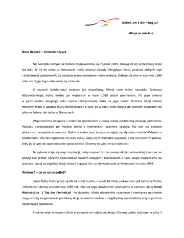 dzień.de | der-tag.pl Akcja w mieście Nasz deptak – historia ożywa Na początku lutego na historii zajmowaliśmy się rokiem 1989. Okazją do tej szczególnej lekcji był fakt, że 25 lat temu w Warszawie miały miejsce obrady Okrągłego Stołu, podczas których rząd i Solidarność postanowili, że zostaną przeprowadzone nowe wybory. Odbyły się one w czerwcu 1989 roku i w ciągu tego roku wiele się zmieniło. O czasach Solidarności wszyscy już słyszeliśmy. Wiele nam mówi nazwisko Tadeusza Mazowieckiego, który krótko po wyborach w lecie 1989 został premierem. Po jego śmierci w październiku ubiegłego roku media relacjonowały dużo na jego temat. Podczas lekcji historii mówimy także o upadku muru berlińskiego i o tym, że w roku 1989 doszło do licznych wydarzeń nie tylko w Polsce, ale także w Niemczech. Wspomnienia związane z ostatnim spotkaniem z naszą szkołą partnerską ożywają ponownie. Podczas oprowadzania po mieście jedna z niemieckich uczennic spytała, kto jest na plakacie widocznym wszędzie w centrum. Byliśmy zaskoczeni, że jeszcze nigdy nie słyszała o Lechu Wałęsie i o Solidarności. Ale tak naprawdę nie było czasu, żeby jej to wszystko wyjaśnić, a my nie byliśmy gotowi, żeby jej o tym tak spontanicznie opowiedzieć. Chcemy to więc teraz nadrobić! To pytanie staje się więc inspiracją, żeby napisać list do naszej szkoły partnerskiej i jeszcze raz podjąć ten temat. Chcemy opowiedzieć naszym kolegom i koleżankom o tym, czego nauczyliśmy się podczas naszej szczególnej lekcji historii i spytać ich, co się wydarzyło w Niemczech w roku 1989. Wolność – co to oznacza(ło)? Same fakty historyczne są dla nas zbyt nudne, o wiele bardziej ciekawi nas, jak ludzie w Polsce i Niemczech dzisiaj wspominają 1989 rok. Aby się tego dowiedzieć, planujemy w czerwcu akcję Dzień Wolności.de | Tag der Freiheit.pl na deptaku. Może niemieckie uczennice i niemieccy uczniowie mają ochotę zorganizować podobną akcję w swoim mieście - moglibyśmy opowiedzieć o tym podczas najbliższego spotkania. Piszemy więc w naszym liście o pomyśle na najbliższą akcję: Chcemy zadać ludziom na ulicy 3 pytania: Co oznacza dla Państwa wolność? Co kojarzy Pani/Pan z rokiem 1989? Co oznacza dla Pani/Pana możliwość wzięcia udziału w politycznych wyborach? Odpowiedzi na te pytania uczestnicy ankiety powinni zanotować na przygotowanych przez nas arkuszach. Arkusze powinny zostać uzupełnione zdjęciem odpowiedniej osoby, które wykonamy za jej zgodą. Na deptaku zawiesimy sznur do bielizny, na którym powiesimy wszystkie wypełnione ankiety. W ten sposób powstanie podczas jednego dnia kolorowa wystawa z okazji Dnia Wolności.de | Tag der Freiheit.pl. Karoline Hoffmann, 13.02.2014 Fundacja Krzyżowa dla Porozumienia Europejskiego