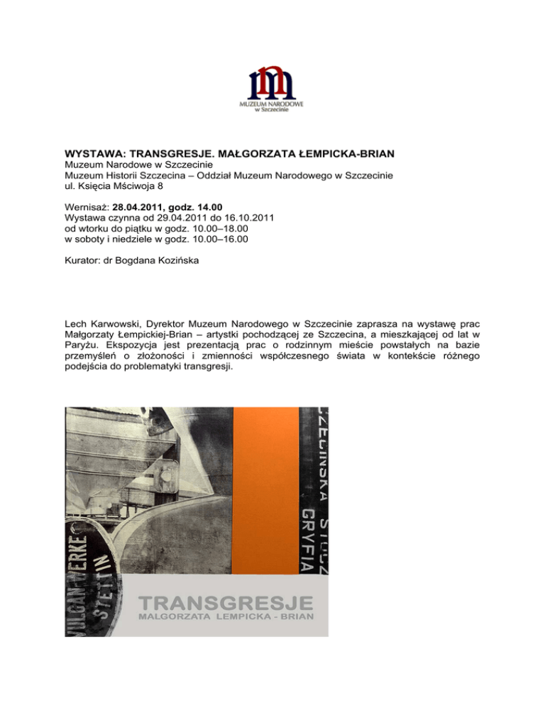 WYSTAWA: TRANSGRESJE. MAŁGORZATA ŁEMPICKA-BRIAN Muzeum Narodowe w Szczecinie Muzeum Historii Szczecina – Oddział Muzeum Narodowego w Szczecinie ul. Księcia Mściwoja 8 Wernisaż: 28.04.2011, godz. 14.00 Wystawa czynna od 29.04.2011 do 16.10.2011 od wtorku do piątku w godz. 10.00–18.00 w soboty i niedziele w godz. 10.00–16.00 Kurator: dr Bogdana Kozińska Lech Karwowski, Dyrektor Muzeum Narodowego w Szczecinie zaprasza na wystawę prac Małgorzaty Łempickiej-Brian – artystki pochodzącej ze Szczecina, a mieszkającej od lat w Paryżu. Ekspozycja jest prezentacją prac o rodzinnym mieście powstałych na bazie przemyśleń o złożoności i zmienności współczesnego świata w kontekście różnego podejścia do problematyki transgresji. Małgorzata Łempicka-Brian, artystka fotografik i historyk sztuki urodzona w Szczecinie, a od 1990 r. zamieszkała w Paryżu, gdzie tworzy fotograficzne obrazy i instalacje przestrzenne komponowane z elementów statycznych i audiowizualnych. Jej prace, wystawiane na licznych wystawach indywidualnych i zbiorowych, oscylują między projektami artystycznymi o silnych konotacjach socjalnych, a realizacjami o intymnym spojrzeniu na indywiduum i jego życie wewnętrzne. Wystawa „Transgresje” przygotowana została specjalnie na ekspozycję w rodzinnym mieście autorki – mieście pogranicza o pogmatwanej historii, wielowarstwowej kulturze i społeczności dotkniętej piętnem tytułowej transgresji. Stanowi artystyczny zapis przemyśleń dotyczących aktu i stanu transgresji – przekraczania reguł, zwyczajów, tabu. Koncepcja wystawy odnosi się do zmian w kontekście psychicznym, społecznym, estetycznym, do przewartościowań związanych z pogmatwaną historią miasta, wielowarstwowością kulturową, wciąż nowymi realiami. Tych relacji poszukuje autorka w historycznym i współczesnym pejzażu miasta. Łączy dokumentalny zapis fotografii z ekspresją obserwatora, transformując rzeczywistość w kontekście emocji i artystycznych wrażeń, wynikających z własnych doświadczeń, przeżyć i przemyśleń. Prezentowane kompozycje fotograficzne kompilują zróżnicowane postrzeganie tych samych miejsc, obserwowanych z transgresyjnych punktów widzenia, zmieniane w konsekwencji nakładających się na siebie przeobrażeń historycznych, politycznych, społecznych. Autorka zadaje sobie i odbiorcom pytanie o doświadczenie aktu transgresji, o świadomość zmiany realiów, w jakich funkcjonujemy oraz o ich wpływ na indywidualną i społeczną percepcję. Użycie przez autorkę różnorodnych środków wyrazu ze swoistą techniką fotograficznomalarską, wykorzystującą działanie emulsji światłoczułej, jest samo w sobie transgresją w fotografii, stanowiąc przekroczenie granicy medium i kolejny aspekt odwołujący się do tytułu wystawy. Jednym z elementów ekspozycji jest instalacja nawiązująca do odrodzonego ostatnio w mentalności współczesnych Szczecinian, zaginionego pomnika Ludwiga Manzela z alegoryczną postacią Sediny, personifikującą miasto Szczecin. Działając audiowizualną projekcją z nakładającymi się obrazami i dźwiękami z różnych okresów, artystka zadaje pytanie o tożsamość dzisiejszych mieszkańców Szczecina. Ekspozycji towarzyszy polsko-niemiecki katalog, zawierający prezentowane na wystawie dzieła, eseje podejmujące problematykę wystawy oraz wywiad z autorką ekspozycji. www.lempicka.net www.muzeum.szczecin.pl