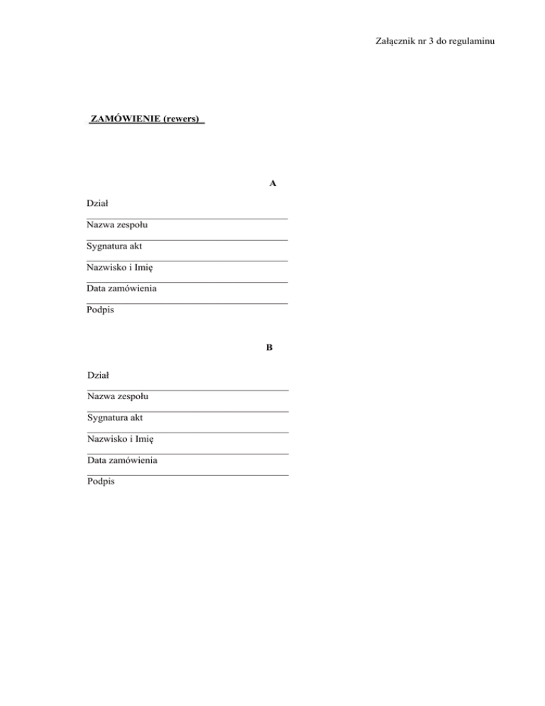 Załącznik nr 3 do regulaminu ZAMÓWIENIE (rewers) A Dział ________________________________________ Nazwa zespołu ________________________________________ Sygnatura akt ________________________________________ Nazwisko i Imię ________________________________________ Data zamówienia ________________________________________ Podpis B Dział ________________________________________ Nazwa zespołu ________________________________________ Sygnatura akt ________________________________________ Nazwisko i Imię ________________________________________ Data zamówienia ________________________________________ Podpis