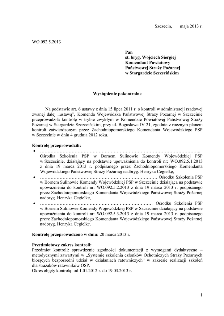 Szczecin, maja 2013 r. WO.092.5.2013 Pan st. bryg. Wojciech Siergiej Komendant Powiatowy Państwowej Straży Pożarnej w Stargardzie Szczecińskim Wystąpienie pokontrolne Na podstawie art. 6 ustawy z dnia 15 lipca 2011 r. o kontroli w administracji rządowej zwanej dalej „ustawą”, Komenda Wojewódzka Państwowej Straży Pożarnej w Szczecinie przeprowadziła kontrolę w trybie zwykłym w Komendzie Powiatowej Państwowej Straży Pożarnej w Stargardzie Szczecińskim, przy ul. Bogusława IV 21, zgodnie z rocznym planem kontroli zatwierdzonym przez Zachodniopomorskiego Komendanta Wojewódzkiego PSP w Szczecinie w dniu 4 grudnia 2012 roku. Kontrolę przeprowadzili: …………………………………………………………………………………………….. Ośrodka Szkolenia PSP w Bornem Sulinowie Komendy Wojewódzkiej PSP w Szczecinie, działający na podstawie upoważnienia do kontroli nr: WO.092.5.1.2013 z dnia 19 marca 2013 r. podpisanego przez Zachodniopomorskiego Komendanta Wojewódzkiego Państwowej Straży Pożarnej nadbryg. Henryka Cegiełkę, …………………………………………………………………… Ośrodku Szkolenia PSP w Bornem Sulinowie Komendy Wojewódzkiej PSP w Szczecinie działająca na podstawie upoważnienia do kontroli nr: WO.092.5.2.2013 z dnia 19 marca 2013 r. podpisanego przez Zachodniopomorskiego Komendanta Wojewódzkiego Państwowej Straży Pożarnej nadbryg. Henryka Cegiełkę, ………………………………………………………………… Ośrodku Szkolenia PSP w Bornem Sulinowie Komendy Wojewódzkiej PSP w Szczecinie działający na podstawie upoważnienia do kontroli nr: WO.092.5.3.2013 z dnia 19 marca 2013 r. podpisanego przez Zachodniopomorskiego Komendanta Wojewódzkiego Państwowej Straży Pożarnej nadbryg. Henryka Cegiełkę. Kontrolę przeprowadzono w dniu: 20 marca 2013 r. Przedmiotowy zakres kontroli: Przedmiot kontroli: sprawdzenie zgodności dokumentacji z wymogami dydaktyczno – metodycznymi zawartymi w „Systemie szkolenia członków Ochotniczych Straży Pożarnych biorących bezpośredni udział w działaniach ratowniczych” w zakresie realizacji szkoleń dla strażaków ratowników OSP. Okres objęty kontrolą: od 1.01.2012 r. do 19.03.2013 r. 1 W toku kontroli ustalono, co następuje: I. Podsumowanie i ocena działalności Komendanta Powiatowego PSP w Stargardzie Szczecińskim. Podstawy prawne regulujące zasady szkoleń dla jednostek Ochotniczych Straży Pożarnych. Komendant Powiatowy PSP w Stargardzie Szczecińskim realizuje szkolenia na podstawie „Systemu szkolenia członków Ochotniczych Straży Pożarnych biorących bezpośredni udział w działaniach ratowniczych” z 2006 roku, zaakceptowanego przez Prezesa Zarządu Głównego ZOSP RP – Waldemara Pawlaka i zatwierdzonego przez Komendanta Głównego Państwowej Straży Pożarnej – st. bryg. mgr inż. Kazimierza Krzowskiego oraz w przypadku szkoleń objętych kontrolą, a mianowicie: - szkolenia podstawowego strażaków ratowników OSP część I, przeprowadzonego w terminie od 27.10.2012 do 04.11.2012 r. na podstawie Decyzji nr 200/PJRG/2012 Komendanta Powiatowego PSP w Stargardzie Szczecińskim z dnia 17 października 2012 r. w sprawie uruchomienia i przeprowadzenia szkolenia podstawowego strażaków ratowników OSP część I członków Ochotniczych Straży Pożarnych, biorących bezpośredni udział w działaniach ratowniczych, w tym powołania Rady Pedagogicznej i Komisji Egzaminacyjnej, - szkolenia z zakresu ratownictwa technicznego, przeprowadzonego w terminie od 14.10.2012 do 21.10.2012 r. na podstawie Decyzji nr 196/PJRG/2012 Komendanta Powiatowego PSP w Stargardzie Szczecińskim z dnia 24 września 2012 r. w sprawie uruchomienia i przeprowadzenia szkolenia z zakresu ratownictwa technicznego dla strażaków ratowników członków Ochotniczych Straży Pożarnych, biorących bezpośredni udział w działaniach ratowniczych, w tym powołania Rady Pedagogicznej i Komisji Egzaminacyjnej. 1. Kontrolowane zagadnienie ocenione zostało pozytywnie. 2. Realizacja szkoleń OSP w zakresie rodzaju przeprowadzonych szkoleń, miejsca ich prowadzenia i jednostek podlegających szkoleniu. Forma szkolenia OSP E-learning/ Tradycyjne E-learning/ Tradycyjne E-learning/ Tradycyjne E-learning/ Tradycyjne Rodzaj kwalifikacji Szkolenie podstawowe strażaków ratowników OSP część I Szkolenie z zakresu ratownictwa technicznego dla strażaków ratowników OSP Szkolenie podstawowe strażaków ratowników OSP część I Szkolenie kierowców – konserwatorów sprzętu ratowniczego OSP Nr szkolenia Data rozpoczęcia szkolenia Data zakończeni a szkolenia Liczba absolwentó w szkolenia Rodzaj szkolenia OSPI/16/201 2/03 29.09.2012 13.10.2012 33 Teoria za pomocą metody e-learning, praktyka w Komendzie Powiatowej PSP OSPRT/16/20 12/05 14.10.2012 21.10.2012 21 Teoria za pomocą metody e-learning, praktyka w Komendzie Powiatowej PSP 26 Teoria za pomocą metody e-learning, praktyka w Komendzie Powiatowej PSP 10 Teoria za pomocą metody e-learning, praktyka w Komendzie Powiatowej PSP OSPI/16/201 2/04 OSPKK/16/2 012/03 27.10.2012 10.11.2012 04.11.2012 18.11.2012 2 E-learning/ Tradycyjne Szkolenie podstawowe strażaków ratowników OSP część I OSPI/16/201 2/05 E-learning/ Tradycyjne Szkolenie dowódców OSP OSPD/16/201 2/02 24.11.2012 08.12.2012 02.12.2012 16.12.2012 17 Teoria za pomocą metody e-learning, praktyka w Komendzie Powiatowej PSP 24 Teoria za pomocą metody e-learning, praktyka w Komendzie Powiatowej PSP Kontrolowane zagadnienie ocenione zostało pozytywnie Sprawdzenie zgodności nadawania numeracji szkoleń przez Ośrodek z numerami wystawianych zaświadczeń. Numery szkoleń i kody wydanych zaświadczeń są zgodne z zasadą określoną przez Komendę Główną Państwowej Straży Pożarnej. 3. Kontrolowane zagadnienie ocenione zostało pozytywnie. Baza dydaktyczno - sprzętowa. Sprzęt techniczny i pojazdy używane do szkoleń. Komenda 