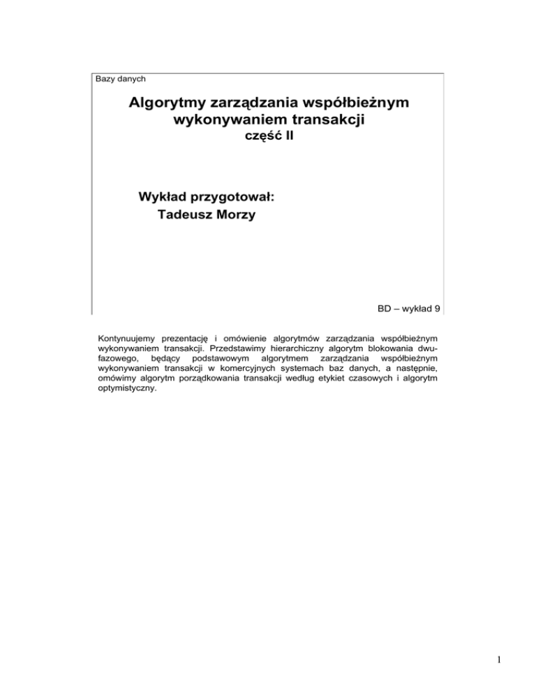 Bazy danych Algorytmy zarządzania współbieżnym wykonywaniem transakcji część II Wykład przygotował: Tadeusz Morzy BD – wykład 9 Kontynuujemy prezentację i omówienie algorytmów zarządzania współbieżnym wykonywaniem transakcji. Przedstawimy hierarchiczny algorytm blokowania dwufazowego, będący podstawowym algorytmem zarządzania współbieżnym wykonywaniem transakcji w komercyjnych systemach baz danych, a następnie, omówimy algorytm porządkowania transakcji według etykiet czasowych i algorytm optymistyczny. 1 Bazy danych Ziarnistość blokad • Hierarchia ziarnistości danych database Relation A Relation B Relation C BD – wykład 9 (2) Jak już wspomnieliśmy na zakończenie poprzedniego wykładu, nie istnieje żaden mechanizm blokowania, realizowany na poziomie blokad rekordów, który gwarantowałby rozwiązanie problemu rekordów „duchów”. Rozwiązanie tego problemu wymaga wprowadzenia mechanizmu, który pozwalałby zakładać blokady na różnych poziomach organizacji danych – innymi słowy, pozwalałby zakładać blokady o różnej ziarnistości (baza danych, relacja, strona, rekord). Z drugiej strony może to rodzić pewien problem. Załóżmy, że dana jest relacja Pracownicy i że założyliśmy blokadę dla odczytu rekordu opisującego pracownika o nazwisku „Dziandziak”. Z drugiej strony, inny użytkownik postanowił założyć blokadę do zapisu całej relacji Pracownicy, gdyż zamierza uaktualnić adres zamieszkania pracownika o nazwisku „Nowak”. Czy te dwie blokady są kompatybilne czy tez nie? Rozwiązaniem tego problemu jest połączenie mechanizmu blokad fizycznych, zakładanych na poziomie rekordów (krotek) bazy danych, z blokadami intencyjnymi, nazywanymi również blokadami predykatowymi, zakładanymi na poziomie bazy danych i relacji. Algorytm, który łączy te dwa typy blokad nazywamy hierarchicznym algorytmem blokowania dwufazowego. Wykorzystuje on immanentną cechę organizacji bazy danych jaką jest hierarchia ziarnistości danych. Zauważmy, że baza danych posiada strukturę drzewa. Korzeniem tej struktury jest baza danych, która składa się ze zbioru relacji, które, z kolei, składają się ze zbioru krotek. Hierarchiczna struktura bazy danych pozwala na implementację hierarchicznego algorytmu blokowania. stosunkowo efektywną 2 Bazy danych Jednostka blokowania • Wybór jednostki blokowania jest kompromisem między stopniem współbieżności systemu, a narzutem systemowym – Współbieżność pracy systemu rośnie wraz ze zwiększaniem precyzji blokowania (zmniejszaniem liczby zablokowanych danych i zwiększaniem liczby blokad) – Precyzyjne blokowanie jest kosztowne dla złożonych transakcji, które wymagają długiego czasu utrzymywania dużej liczby blokad – Blokowanie dużych jednostek danych wspiera złożone transakcje o dużej liczbie operacji, kosztem prostych transakcji o niewielkiej liczbie operacji • Konkluzja: potrzebny jest protokół, który będzie wspierał obydwa rodzaje transakcji, to znaczy taki, który będzie umożliwiał równoczesne zakładanie blokad na różnych jednostkach danych BD – wykład 9 (3) Jeszcze innym problemem związanym z wyborem jednostki blokowania jest problemem efektywności działania systemu. Podstawową miarą oceny działania systemu bazy danych jest przepustowość systemu mierzona liczbą transakcji na sekundę. Rozważmy dwa przykładowe scenariusze wykonywania transakcji na relacji Pracownicy. Załóżmy, że relacja Pracownicy zawiera 50 tys. krotek. Dana jest transakcja, która aktualizuje zarobki wszystkich pracowników o 1%. Ta transakcja odczytuje wszystkie krotki relacji Pracownicy, a następnie, aktualizuje wartość atrybutu zarobki dla każdej krotki. Oznacza to konieczność założenia 50 tys. blokad do odczytu, które, następnie, są konwertowane do blokad do zapisu (50tys. konwersji blokad). Po wykonaniu transakcji, system wykonuje 50 tys. operacji odblokowania. Gdyby jednostką blokowania była cała relacja, wówczas wykonanie transakcji wymagałoby założenia jednej blokady na całej relacji, jednej operacji konwersji blokady, i jednej operacji zdjęcia blokady. Z drugiej strony, rozważmy współbieżne wykonanie dwóch transakcji, z których pierwsza odczytuje krotkę r1 relacji Pracownicy, natomiast druga aktualizuje krotkę r2 tej relacji. Gdyby obie transakcje zakładały blokady na poziomie całej relacji, to, oczywiście, wystąpiłby konflikt blokad pomiędzy transakcjami, co pociągnęłoby konieczność zawieszenia wykonywania jednej transakcji do czasu zdjęcia blokady przez drugą transakcję. Z punktu widzenia tego scenariusza, lepszym rozwiązaniem byłoby, przyjęcie jako jednostki blokowania, pojedynczej krotki bazy danych. Wybór jednostki blokowania jest zatem kompromisem między stopniem współbieżności systemu, a narzutem systemowym związanym z implementacją algorytmu blokowania: – przepustowość systemu rośnie wraz ze zwiększaniem precyzji blokowania (zmniejszaniem liczby zablokowanych danych i zwiększaniem liczby blokad), – precyzyjne blokowanie jest kosztowne dla złożonych transakcji, które wymagają długiego czasu utrzymywania dużej liczby blokad, – blokowanie dużych jednostek danych wspiera złożone transakcje o dużej liczbie operacji, kosztem prostych transakcji o niewielkiej liczbie operacji. Reasumując, potrzebny jest protokół, który będzie wspierał obydwa typy transakcji, to znaczy taki, który będzie umożliwiał równoczesne zakładanie blokad na różnych jednostkach danych. 3 Bazy danych Blokady intencyjne (1) • Idea hierarchicznego protokołu blokowania: Zablokowanie pośredniego węzła w hierarchii ziarnistości danych jest równoznaczne z pośrednim zablokowaniem wszystkich węzłów potomnych Wymaga ono jednak wcześniejszego uzyskania blokad na wszystkich węzłach rodzicielskich BD – wykład 9 (4) Idea hierarchicznego algorytmu blokowania dwufazowego jest nastę