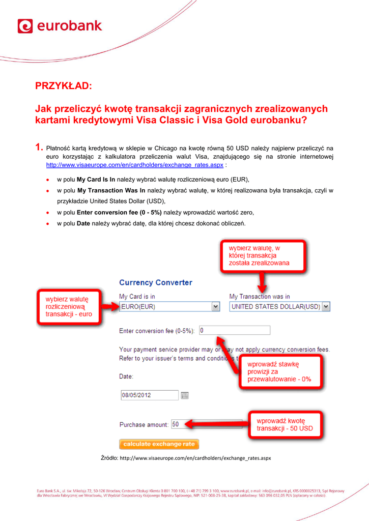 PRZYKŁAD: Jak przeliczyć kwotę transakcji zagranicznych zrealizowanych kartami kredytowymi Visa Classic i Visa Gold eurobanku? 1. Płatność kartą kredytową w sklepie w Chicago na kwotę równą 50 USD należy najpierw przeliczyć na euro korzystając z kalkulatora przeliczenia walut Visa, znajdującego się na stronie internetowej http://www.visaeurope.com/en/cardholders/exchange_rates.aspx : w polu My Card Is In należy wybrać walutę rozliczeniową euro (EUR), w polu My Transaction Was In należy wybrać walutę, w której realizowana była transakcja, czyli w przykładzie United States Dollar (USD), w polu Enter conversion fee (0 - 5%) należy wprowadzić wartość zero, w polu Date należy wybrać datę, dla której chcesz dokonać obliczeń. Źródło: http://www.visaeurope.com/en/cardholders/exchange_rates.aspx Po naciśnięciu Calculate Exchange Rate prezentowany jest kurs waluty i kwota transakcji w przeliczeniu na euro. Źródło: http://www.visaeurope.com/en/cardholders/exchange_rates.aspx 2. Następnie kwotę transakcji w walucie przeliczeniowej euro (zaokrągloną do dwóch miejsc po przecinku) należy przeliczyć na PLN uwzględniając kurs sprzedaży waluty euro obowiązujący w Banku dostępny na stronie internetowej Societe Generale. W przykładzie 38,58 EUR należy przeliczyć na PLN: 38,58 EUR x 4,3265 166,92 PLN 3. Podsumowując: Kwota transakcji zagranicznej równa 50 USD zostanie zaksięgowana na rachunku karty kredytowej w kwocie 166,92 PLN zakładając, że przewalutowanie transakcji i jej rozliczenie na rachunku karty odbyło się dnia 08.05.2012. 4. Oprócz zaksięgowania na rachunku karty kredytowej obciążenia kwotą 166,92 PLN naliczona zostanie prowizja za przewalutowanie transakcji bezgotówkowej zrealizowanej za granicą poza krajami członkowskimi UE i EFTA w wysokości 1,5% czyli 2,50 PLN.