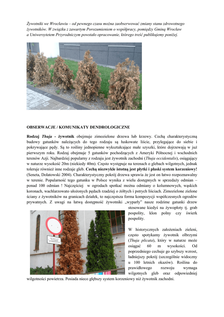 Żywotniki we Wrocławiu – od pewnego czasu można zaobserwować zmiany stanu zdrowotnego żywotników. W związku z zawartym Porozumieniem o współpracy, pomiędzy Gminą Wrocław a Uniwersytetem Przyrodniczym powstało opracowanie, którego treść publikujemy poniżej. OBSERWACJE / KOMUNIKATY DENDROLOGICZNE Rodzaj Thuja - żywotnik obejmuje zimozielone drzewa lub krzewy. Cechą charakterystyczną budowy gatunków należących do tego rodzaju są łuskowate liście, przylegające do siebie i pokrywające pędy. Są to rośliny jednopienne wykształcające małe szyszki, które dojrzewają w już pierwszym roku. Rodzaj obejmuje 5 gatunków pochodzących z Ameryki Północnej i wschodnich terenów Azji. Najbardziej popularny z rodzaju jest żywotnik zachodni (Thuja occidentalis), osiągający w naturze wysokość 20m (niekiedy 40m). Często występuje na terenach o glebach wilgotnych, jednak toleruje również inne rodzaje gleb. Cechą niezwykle istotną jest płytki i płaski system korzeniowy! (Seneta, Dolatowski 2004). Charakterystyczny pokrój drzewa sprawia że jest on łatwo rozpoznawalny w terenie. Popularność tego gatunku w Polsce wynika z wielu dostępnych w sprzedaży odmian – ponad 100 odmian ! Najczęściej w ogrodach spotkać można odmiany o kolumnowych, wąskich koronach, wachlarzowato ułożonych pędach rzadziej o żółtych i pstrych liściach. Zimozielone zielone ściany z żywotników na granicach działek, to najczęstsza forma kompozycji współczesnych ogrodów prywatnych. Z uwagi na łatwą dostępność żywotniki „wyparły” nasze rodzime gatunki drzew stosowane kiedyś na żywopłoty tj. grab pospolity, klon polny czy świerk pospolity. W historycznych założeniach zieleni, często spotykamy żywotnik olbrzymi (Thuja plicata), który w naturze może osiągać 60 m wysokości. Od poprzedniego cechuje go szybszy wzrost, ładniejszy pokrój (szczególnie widoczny u 100 letnich okazów). Roślina do prawidłowego rozwoju wymaga wilgotnych gleb oraz odpowiedniej wilgotności powietrza. Posiada nieco głębszy system korzeniowy niż żywotnik zachodni. Od wiosny 2016 w niespotykanej skali obserwujemy zjawisko zamierania żywotników (Thuja). Bez względu na to czy rośliny te rosną samodzielnie jako solitery, czy w nasadzeniach żywopłotowych najbardziej rzucającym się w oczy zjawiskiem jest mozaikowy charakter zamierających roślin. Nieregularność w procesie zamierania żywotników mogłaby wskazywać na czynnik infekcyjny w postaci porażenia przez grzyby, bądź zaatakowania przez owady, jednak wyjaśnienie tego zjawiska jest dużo bardziej prozaiczne. To wyjątkowa susza jaka miała miejsce w roku 2015 przyczyniła się w zasadniczy sposób do procesu zasychania roślin. Żywotniki, które charakteryzuje płytki system korzeniowy korzystają przede wszystkim z zasobów wodnych jakie dostarczają wody opadowe. Brak opadów dzięki którym woda grawitacyjnie przenika w głąb systemu korzeniowego po pewnym czasie wpływa na usychanie głębiej położonych korzeni i tym samym przyczynia się do zjawiska zasychania roślin. Należy pamiętać, że często żywotniki czy to w zieleni miejskiej, czy nawet w ogrodach przydomowych sadzone są zbyt płytko. Dodatkowym czynnikiem, który ogranicza dostępność wody jest brak próchnicy. W miastach dodatkowo ubicie wierzchniej warstwy gleby pod koronami drzew sprawia, że woda opadowa nie ma możliwości przesiąkania do korzeni i spływa poza zasięg systemu korzeniowego. Częstym zjawiskiem jest masowe zasychanie roślin obserwowane wiosną wraz z ruszaniem wegetacji roślin. Także nieregularny sposób zamierania roślin da się wyjaśnić. Nawet w nasadzeniach żywopłotowych spotykamy się przecież z podłożem o różnym stopniu przepuszczalności. Istotny jest również materiał wyjściowy, czyli sposób w jaki poszczególne rośliny były szkółkowane. W roku 2015 zasoby wodne były niezwykle ograniczone. Te rośliny, które miały nawet nieco lepiej wykształcony system korzeniowy i jednocześnie rosły w bardziej przepuszczalnym podłożu mogły lepiej przetrwać niekorzystne warunki wodne. Dotyczy to również oddziaływania suszy na poszczególne odmiany żywotników, które także w różnym stopniu zareagowały na niedostatek wody. W tym momencie należy pamiętać, że nawet te osobniki, którym udało się przeżyć, są osłabione i narażone na atakowanie przez choroby. W tych nasadzeniach, które występują w pobliżu parków, lasów miejskich itd. należy zwracać szczególna uwagę na możliwość zaatakowania roślin przez opieńkę miodową, która już sieje spustoszenie na innych roślinach ozdobnych. Obserwowane zmiany choć nie wykluczają podejmowania działań związanych z utrzymaniem i pielęgnowaniem żywotników, wskazują na konieczność weryfikacji popularnych i powszechnie stosowanych doborów roślin. dr Elżbieta Szopińska specjalista dendrolog Instytut Architektury Krajobrazu Uniwersytetu Przyrodniczego we Wrocławiu dr inż. Janusz Mazurek specjalista w zakresie ochrony roślin