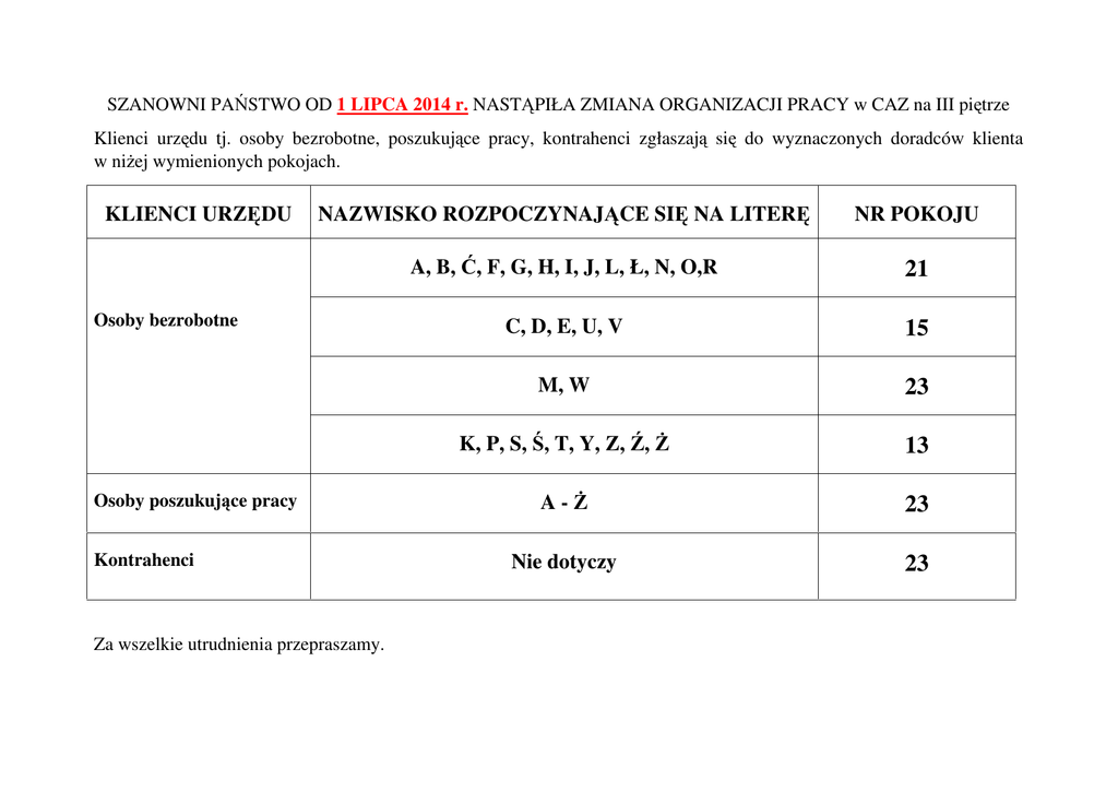 SZANOWNI PAŃSTWO OD 1 LIPCA 2014 r. NASTĄPIŁA ZMIANA ORGANIZACJI PRACY w CAZ na III piętrze Klienci urzędu tj. osoby bezrobotne, poszukujące pracy, kontrahenci zgłaszają się do wyznaczonych doradców klienta w niżej wymienionych pokojach. KLIENCI URZĘDU NAZWISKO ROZPOCZYNAJĄCE SIĘ NA LITERĘ NR POKOJU A, B, Ć, F, G, H, I, J, L, Ł, N, O,R 21 C, D, E, U, V 15 M, W 23 K, P, S, Ś, T, Y, Z, Ź, Ż 13 A-Ż 23 Nie dotyczy 23 Osoby bezrobotne Osoby poszukujące pracy Kontrahenci Za wszelkie utrudnienia przepraszamy.