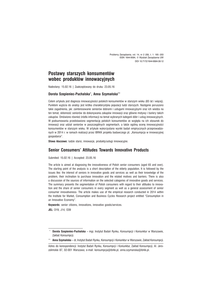 Problemy ZarzÈdzania, vol. 14, nr 2 (59), t. 1: 185 – 203 ISSN 1644-9584, © Wydziaï ZarzÈdzania UW DOI 10.7172/1644-9584.59.12 Postawy starszych konsumentów wobec produktów innowacyjnych Nadesïany: 15.02.16 | Zaakceptowany do druku: 23.05.16 Dorota Szepieniec-Puchalska*, Anna Szymañska** Celem artykuïu jest diagnoza innowacyjnoĂci polskich konsumentów wbstarszym wieku (65 lat ibwiÚcej). Punktem wyjĂcia do analizy jest krótka charakterystyka populacji ludzi starszych. NastÚpnie poruszono takie zagadnienia, jak: zainteresowanie seniorów dobrami ib usïugami innowacyjnymi oraz ich wiedza na ten temat, skïonnoĂÊ seniorów do dokonywania zakupów innowacji oraz gïówne motywy ibbariery takich zakupów. Omówiono równieĝ ěródïa informacji na temat wybranych kategorii dóbr ibusïug innowacyjnych. W podsumowaniu przedstawiono segmentacjÚ polskich konsumentów ze wzglÚdu na ich stosunek do innowacji oraz udziaï seniorów wb poszczególnych segmentach, ab takĝe ogólnÈ ocenÚ innowacyjnoĂci konsumentów wb starszym wieku. W artykule wykorzystano wyniki badañ empirycznych przeprowadzonych w 2014 r. w ramach realizacji przez IBRKK projektu badawczego pt. „Konsumpcja w innowacyjnej gospodarce”. Sïowa kluczowe: ludzie starsi, innowacje, produkty/usïugi innowacyjne. Senior Consumers’ Attitudes Towards Innovative Products Submited: 15.02.16 | Accepted: 23.05.16 The article is aimed at diagnosing the innovativeness of Polish senior consumers (aged 65 and over). The starting point of the analysis is ab short description of the elderly population. It is followed by the issues like: the interest of seniors in innovative goods and services as well as their knowledge of the problem, their inclination to purchase innovation and the related motives and barriers. There is also abdiscussion of the sources of information on the selected categories of innovative goods and services. The summary presents the segmentation of Polish consumers with regard to their attitudes to innovation and the share of senior consumers in every segment as well as ab general assessment of senior consumer innovativeness. The article makes use of the empirical research conducted in 2014 within the Institute for Market, Consumption and Business Cycles Research project entitled “Consumption in an Innovative Economy”. Keywords: senior citizens, innovations, innovative goods/services. JEL: D19, J14, O39 * Dorota Szepieniec-Puchalska – mgr, Instytut Badañ Rynku, Konsumpcji ib Koniunktur wb Warszawie, Zakïad Konsumpcji. ** Anna Szymañska – dr, Instytut Badañ Rynku, Konsumpcji ibKoniunktur wbWarszawie, Zakïad Konsumpcji. Adres do korespondencji: Instytut Badañ Rynku, Konsumpcji ib Koniunktur, Zakïad Konsumpcji, Al. Jerozolimskie 87, 02-001 Warszawa; e-mail: [email protected], [email protected]. Dorota Szepieniec-Puchalska, Anna Szymañska 1. Wprowadzenie Juĝ od kilku dziesiÚcioleci wbkrajach rozwiniÚtych obserwuje siÚ zjawisko starzenia siÚ spoïeczeñstwa – wzrost udziaïu osób starszych (w wieku 65 lat ib wiÚcej) wb spoïeczeñstwie. Powoduje to powstawanie nowych problemów spoïeczno-ekonomicznych ibzarazem skïania badaczy zbwielu dziedzin nauki do zainteresowania siÚ zagadnieniem starzenia siÚ spoïeczeñstwa ib wieloaspektowÈ charakterystykÈ ludzi starszych. Starzenie siÚ populacji wpïywa na praktycznie wszystkie obszary funkcjonowania spoïeczeñstwa, dlatego tak waĝne jest badanie tego zjawiska ibjego skutków. Istotnym nastÚpstwem zwiÚkszania siÚ segmentu ludzi starszych jest m.in. wzrost ich znaczenia jako konsumentów (BïÚdowski, Szatur-Jaworska, Szweda-Lewandowska ibKubicki, 2012). Starsi konsumenci stajÈ siÚ coraz waĝniejszÈ grupÈ, która dziÚki rosnÈcej sile nabywczej jest coraz bardziej doceniana ib zauwaĝana przez producentów (Bylok, 2013). W Ăwietle globalizacji konsumpcji ib wzrostu poziomu jej nowoczesnoĂci, ab takĝe wb epoce technologizacji ĝycia codziennego interesujÈce bÚdzie rozpoznanie, na ile populacja seniorów jest otwarta na nowoĂci ib skïonna do korzystania zbinnowacji pojawiajÈcych siÚ na rynku. Sporo informacji na ten temat dostarczyïy badania empiryczne przeprowadzone przez IBRKK wb ramach realizacji projektu badawczego pt. Konsumpcja wb innowacyjnej gospodarce, finansowanego ze Ărodków NCN (nr 2012/05/B/HS4/04006). Wyniki badañ przedstawione wb niniejszym artykule, na których oparta zostaïa dalsza czÚĂÊ wywodu, uzyskano zb iloĂciowych badañ empirycznych prowadzonych wb poïowie 2014 r. Ich celem byïo dostarczenie przekrojowych informacji obpostawach ibopiniach Polaków wzglÚdem innowacyjnoĂci we wszystkich obszarach ĝycia, ze szczególnym uwzglÚdnieniem konsumpcji innowacyjnych dóbr ib usïug. Badanie przeprowadzono metodÈ bezpoĂrednich wywiadów indywidualnych (metoda CAPI) na reprezentatywnej, ogólnopolskiej próbie 1002 osób wb wieku 18 lat ib wiÚcej. Badanie zostaïo zrealizowane na próbie losowo-kwotowej, dobranej ze wzglÚdu na pïeÊ, wiek, wyksztaïcenie ibklasÚ wielkoĂci miejscowoĂci. W badaniach iloĂciowych osoby wb wieku 65 lat ib wiÚcej stanowiïy 17% próby. Uzyskane wyniki wskazujÈ na duĝe zróĝnicowanie stopnia zainteresowania innowacjami rynkowymi, postaw ib zachowañ polskich konsumentów wbstosunku do produktów innowacyjnych gïównie ze wzglÚdu na takie cechy demograficzne ib spoïeczne, jak: wiek, wyksztaïcenie ib poziom zamoĝnoĂci. Wbpewnym stopniu potwierdziïy siÚ obiegowe opinie, ĝe innowacyjnoĂÊ moĝna przypisaÊ przede wszystkim ludziom mïodym, wyksztaïconym ib bogatym. 2. Ludzie starsi jako segment rynku W literaturze przedmiotu moĝna siÚ spotkaÊ zbróĝnymi definicjami wieku, od którego osobÚ moĝna zaliczyÊ do populacji ludzi starszych, seniorów. 186 DOI 10.7172/1644-9584.59.12 Postawy starszych konsumentów wobec produktów innowacyjnych Definicje starzenia siÚ odnoszÈ siÚ do trzech pïaszczyzn ludzkiej egzystencji: biologicznej, psyc