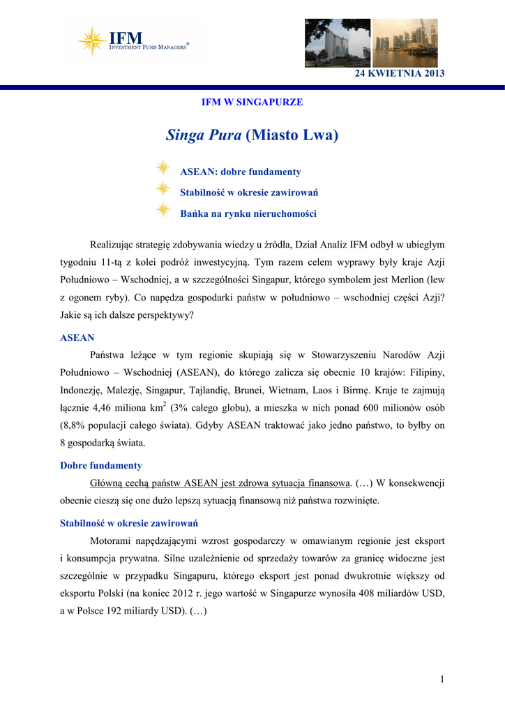 24 KWIETNIA 2013 IFM W SINGAPURZE Singa Pura (Miasto Lwa) ASEAN: dobre fundamenty Stabilność w okresie zawirowań Bańka na rynku nieruchomości Realizując strategię zdobywania wiedzy u źródła, Dział Analiz IFM odbył w ubiegłym tygodniu 11-tą z kolei podróż inwestycyjną. Tym razem celem wyprawy były kraje Azji Południowo – Wschodniej, a w szczególności Singapur, którego symbolem jest Merlion (lew z ogonem ryby). Co napędza gospodarki państw w południowo – wschodniej części Azji? Jakie są ich dalsze perspektywy? ASEAN Państwa leżące w tym regionie skupiają się w Stowarzyszeniu Narodów Azji Południowo – Wschodniej (ASEAN), do którego zalicza się obecnie 10 krajów: Filipiny, Indonezję, Malezję, Singapur, Tajlandię, Brunei, Wietnam, Laos i Birmę. Kraje te zajmują łącznie 4,46 miliona km2 (3% całego globu), a mieszka w nich ponad 600 milionów osób (8,8% populacji całego świata). Gdyby ASEAN traktować jako jedno państwo, to byłby on 8 gospodarką świata. Dobre fundamenty Główną cechą państw ASEAN jest zdrowa sytuacja finansowa. (…) W konsekwencji obecnie cieszą się one dużo lepszą sytuacją finansową niż państwa rozwinięte. Stabilność w okresie zawirowań Motorami napędzającymi wzrost gospodarczy w omawianym regionie jest eksport i konsumpcja prywatna. Silne uzależnienie od sprzedaży towarów za granicę widoczne jest szczególnie w przypadku Singapuru, którego eksport jest ponad dwukrotnie większy od eksportu Polski (na koniec 2012 r. jego wartość w Singapurze wynosiła 408 miliardów USD, a w Polsce 192 miliardy USD). (…) 1 24 KWIETNIA 2013 Łyżka dziegciu Niestety kraje ASEAN mają również swoje problemy. Jednym z nich są bardzo wysokie i ciągle rosnące ceny nieruchomości. (…) Co prawda duża liczba transakcji zawierana jest za gotówkę, jednakże lokalni zarządzający jednogłośnie wyrażają swoje obawy, związane z nadmiernym wzrostem cen w tym segmencie gospodarki. (…) Podsumowanie Kraje wchodzące w skład grupy ASEAN cieszą się stabilną sytuacją finansową, czego dowodem może być ostatnie podwyższenie ratingu Filipin do poziomu BBB- (rating inwestycyjny) przez agencję Fitch. Dodatkowo ich atutem jest rosnąca konsumpcja prywatna i uzależnienie eksportu głównie od wymiany wewnątrzregionalnej. To pozwala im uzyskać swoistą odporność na wahania globalnej koniunktury. (…) Więcej o: Aktualnej sytuacji gospodarczej regionu; Rynku nieruchomości; Wnioskach z Podróży Inwestycyjnej. w materiale dla klientów: IFM Flash: „Miasto Lwa”. Dział Analiz IFM Katowice, tel. (32) 602 79 00 Poznań, tel. (61) 818 28 67 Warszawa, tel. (22) 319 57 60 Wrocław, tel. (71) 787 75 49 www.ifmpl.com 2 24 KWIETNIA 2013 Zapraszamy do śledzenia komentarzy dr Marka Mobiusa nt. rynków wschodzących na stronie Investment Fund Managers S.A.: „Podróże po rynkach wschodzących”, http://komentarzemobiusa.ifmpl.com/. Ostatnio ukazały się: Koreańska niepewność; Podążanie za instynktem i tłumami; Unikając piłki nożnej i rekinów w Recife, Brazylia. Źródło: Franklin Templeton Investments, BlackRock, Fidelity Worldwide Invetments, Investment Fund Managers S.A. Nota prawna: Niniejszy dokument sporządzono wyłącznie dla celów informacyjnych i nie stanowi on: 1) oferty kupna lub sprzedaży ani zachęty do kupna lub sprzedaży jakichkolwiek papierów wartościowych bądź instrumentów finansowych, o których mowa w niniejszym dokumencie, ani też nie ma charakteru: 2) doradztwa inwestycyjnego. Wszelkie decyzje o inwestycji w papiery wartościowe omówione w niniejszym dokumencie należy podejmować po zapoznaniu się z najbardziej aktualną wersją prospektu emisyjnego. Ponadto potencjalni inwestorzy powinni przeprowadzić stosowne analizy, jakie uznają za niezbędne oraz powinni skorzystać z usług doradztwa w kwestiach prawnych, księgowych i podatkowych w celu samodzielnego i świadomego ustalenia stosowności oraz konsekwencji i skutków inwestycji w papiery wartościowe. Opinie zawarte w niniejszym dokumencie mogą ulec zmianie bez uprzedniego powiadomienia. Osiągnięte w przeszłości przez zaprezentowane fundusze stopy zwrotu nie są gwarancją uzyskania podobnych stóp zwrotu w przyszłości. 3