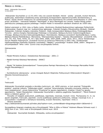 Nieco o mnie... Autor: Aleksander Szumanski 11.02.2010. Aleksander Szumański ur.12.XI.1931 roku we Lwowie – literat - poeta - prozaik, krytyk literacki, publicysta, dziennikarz światowej prasy polonijnej korespondent zagraniczny(USA) akredytowany w Polsce. Ojciec docent medycyny na uniwersytecie Jana Kazimierza we Lwowie zamordowany w 1941 roku przez ukraińsko - niemiecki batalion "Nachtigall" w akcji Nachtigall we Lwowie, matka filolog polski patriotyczny pedagog języka polskiego i historii Polski w lwowskich szkołach średnich do 1939 roku. Debiut wierszem w 1941 roku w Radiu Lwów. Ukończony Wydział Budownictwa Lądowego Politechniki Krakowskiej. Dyplom mgr inż. budownictwa lądowego. Członek Związku Piłsudczyków – Oddział Małopolski, Członek Związku Literatów Polskich. Stały korespondent „Głosu Polskiego” Toronto - pisma Związku Narodowego Polskiego w Kanadzie, „Kuriera Codziennego” Chicago, „Kuriera Galicyjskiego” Stanisławów, „Lwowskich Spotkań” Lwów, „Naszej Polski” Warszawa, "Warszawskiej Gazety", "Gazety Obywatelskiej". Uczestnik XIII, XIV, XV, XVI, XVII, XVIII, IX, XX / lata 2005, 2006, 2007,2008, 2009, 2010, 2011, 2012/ Światowego Forum Mediów Polonijnych. Uczestnik tourne po Ameryce Północnej w 2001 roku. Konferansjer Ogólnopolskiego Festiwalu Piosenki Lwowskiej i "Bałaku" Lwowskiego" Kraków 2008, 2009 r. Biogram w encyklopediach "Who i who" Zurich oraz encyklopedia Oxford. Odznaczenia - Medal Ministra Kultury i Dziedzictwa Narodowego - 2001. - Medal Komisji Edukacji Narodowej - 2006 - Medal "W Hołdzie Komendantowi" Towarzystwa Pamięci Narodowej im. Pierwszego Marszałka Polski Józefa Piłsudskiego, - Symbolicznie odznaczony - przez Związek Byłych Więźniów Politycznych Hitlerowskich Więzień i Obozów Koncentracyjnych. Twórczość Aleksander Szumański posiada w dorobku twórczym: ok. 4000 wierszy, w tym poemat "Fotografie polskie", poemat miłosny "Odlatujące ptaki", poemat "Amerykańsko lwowskie wyznania miłosne, oraz inne niespełnienia", proza historyczna "Przeżycie"(w języku japońskim), Kraków i Żydzi"(w języku japońskim), "Adam Macedoński i Aleksander Szumański z siedmiu pagórków fiesolskich", "Mord Polskich dzieci w łódzkim getcie". Ponadto 14 książek poetyckich, publikacje, reportaże, recenzje, krytyki i inne. Tłumaczony m. in. na języki angielski, francuski, japoński. Liczne publikacje społeczno polityczne, relacje i recenzje m.in. z uroczystości i wydarzeń o tematyce lwowskiej, krytyki literackie, reportaże i inne. Strona autorska http://aleksanderszumanski.pl/index.php?option=com_content&task=blogcategory&id=1&Itemid=2 Szczegółowy biogram znajduje się w Encyklopedii "Who is Who w Polsce" Hubners Blaues Schweiz wyd. I 2002 tom II str. 1931 oraz w Encyklopedii Oxford wyd. 2015 Aleksander Szumański – Wikipedia, wolna encyklopedia http://aleksanderszumanski.pl Kreator PDF Utworzono 4 March, 2017, 04:42