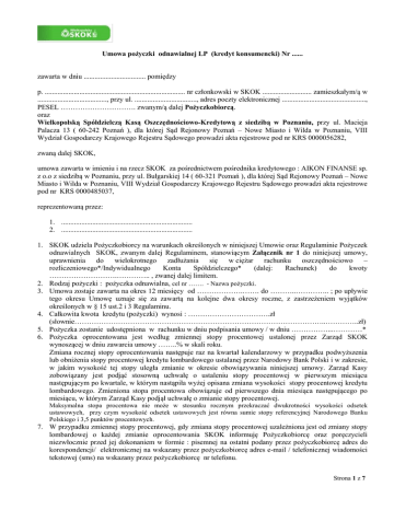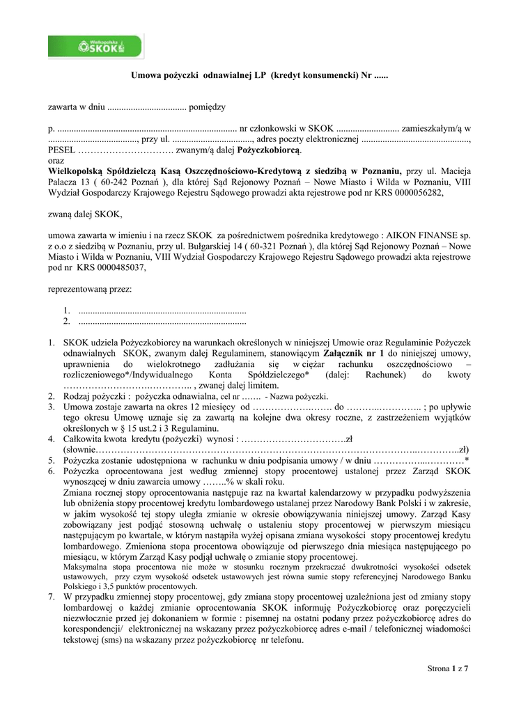 Umowa pożyczki odnawialnej LP (kredyt konsumencki) Nr ...... zawarta w dniu .................................. pomiędzy p. ............................................................................. nr członkowski w SKOK ........................... zamieszkałym/ą w ......................................, przy ul. .................................., adres poczty elektronicznej .............................................., PESEL …………………………. zwanym/ą dalej Pożyczkobiorcą. oraz Wielkopolską Spółdzielczą Kasą Oszczędnościowo-Kredytową z siedzibą w Poznaniu, przy ul. Macieja Palacza 13 ( 60-242 Poznań ), dla której Sąd Rejonowy Poznań – Nowe Miasto i Wilda w Poznaniu, VIII Wydział Gospodarczy Krajowego Rejestru Sądowego prowadzi akta rejestrowe pod nr KRS 0000056282, zwaną dalej SKOK, umowa zawarta w imieniu i na rzecz SKOK za pośrednictwem pośrednika kredytowego : AIKON FINANSE sp. z o.o z siedzibą w Poznaniu, przy ul. Bułgarskiej 14 ( 60-321 Poznań ), dla której Sąd Rejonowy Poznań – Nowe Miasto i Wilda w Poznaniu, VIII Wydział Gospodarczy Krajowego Rejestru Sądowego prowadzi akta rejestrowe pod nr KRS 0000485037, reprezentowaną przez: 1. ........................................................................ 2. ........................................................................ 1. SKOK udziela Pożyczkobiorcy na warunkach określonych w niniejszej Umowie oraz Regulaminie Pożyczek odnawialnych SKOK, zwanym dalej Regulaminem, stanowiącym Załącznik nr 1 do niniejszej umowy, uprawnienia do wielokrotnego zadłużania się w ciężar rachunku oszczędnościowo – rozliczeniowego*/Indywidualnego Konta Spółdzielczego* (dalej: Rachunek) do kwoty ……………………….………….. , zwanej dalej limitem. 2. Rodzaj pożyczki : pożyczka odnawialna, cel nr ……. - Nazwa pożyczki. 3. Umowa zostaje zawarta na okres 12 miesięcy od ……………….……. do ………..………….. ; po upływie tego okresu Umowę uznaje się za zawartą na kolejne dwa okresy roczne, z zastrzeżeniem wyjątków określonych w § 15 ust.2 i 3 Regulaminu. 4. Całkowita kwota kredytu (pożyczki) wynosi : …………………………….zł (słownie…………………………………………………………………………………………..…………..zł) 5. Pożyczka zostanie udostępniona w rachunku w dniu podpisania umowy / w dniu ……………...…………* 6. Pożyczka oprocentowana jest według zmiennej stopy procentowej ustalonej przez Zarząd SKOK wynoszącej w dniu zawarcia umowy ……..% w skali roku. Zmiana rocznej stopy oprocentowania następuje raz na kwartał kalendarzowy w przypadku podwyższenia lub obniżenia stopy procentowej kredytu lombardowego ustalanej przez Narodowy Bank Polski i w zakresie, w jakim wysokość tej stopy uległa zmianie w okresie obowiązywania niniejszej umowy. Zarząd Kasy zobowiązany jest podjąć stosowną uchwałę o ustaleniu stopy procentowej w pierwszym miesiącu następującym po kwartale, w którym nastąpiła wyżej opisana zmiana wysokości stopy procentowej kredytu lombardowego. Zmieniona stopa procentowa obowiązuje od pierwszego dnia miesiąca następującego po miesiącu, w którym Zarząd Kasy podjął uchwałę o zmianie stopy procentowej. Maksymalna stopa procentowa nie może w stosunku rocznym przekraczać dwukrotności wysokości odsetek ustawowych, przy czym wysokość odsetek ustawowych jest równa sumie stopy referencyjnej Narodowego Banku Polskiego i 3,5 punktów procentowych. 7. W przypadku zmiennej stopy procentowej, gdy zmiana stopy procentowej uzależniona jest od zmiany stopy lombardowej o każdej zmianie oprocentowania SKOK informuję Pożyczkobiorcę oraz poręczycieli niezwłocznie przed jej dokonaniem w formie : pisemnej na ostatni podany przez pożyczkobiorcę adres do korespondencji/ elektronicznej na wskazany przez pożyczkobiorcę adres e-mail / telefonicznej wiadomości tekstowej (sms) na wskazany przez pożyczkobiorcę nr telefonu. Strona 1 z 7 Rzeczywista roczna stopa oprocentowania (RRSO) wynosi …...... %, a szacunkowa całkowita kwota do zapłaty w dniu zawarcia niniejszej umowy wynosi …………….….... zł. Do obliczenia RRSO i szacunkowej całkowitej kwoty do zapłaty przyjęto następujące założenia : a) umowa pożyczki będzie obowiązywać na czas, na jaki została zawarta, a SKOK oraz Pożyczkobiorca wypełnią zobowiązania wynikające z umowy pożyczki w terminach określonych w umowie, b) całkowita kwota pożyczki została wypłacona od razu, w całości i na cały okres obowiązywania umowy o pożyczkę (12 miesięcy), c) odsetki podlegają zapłacie wraz ze spłatą kapitału, d) opłata inna niż odsetki wyrażona w pojedynczej kwocie podlega zapłacie w dniu zawarcia umowy o pożyczkę, e) opłaty inne niż odsetki wyrażone jako szereg płatności podlegają zapłacie w regularnych odstępach czasu, począwszy od dnia pierwszej spłaty kapitału, przy czym w przypadku gdy kwoty takich płatności nie są znane, zakłada się, że kwoty te są jednakowe, f) datą początkową będzie data postawienia pożyczki do dyspozycji pożyczkobiorcy, g) wynik podaje się z dokładnością do co najmniej jednego miejsca po przecinku, przy czym jeżeli cyfra występująca po wybranym przez obliczającego miejscu po przecinku jest mniejsza niż 5, cyfrę te pomija się, gdy zaś jest większa albo równa5, cyfrę poprzedzającą zwiększa się o 1. 9. Pożyczkobiorca obowiązany jest do spłaty pożyczki w postaci comiesięcznych wpłat na Rachunek w wysokości nie mniejszej niż ….…% wykorzystanej kwoty pożyczki w ramach limitu, o którym mowa w pkt 1 powiększonej o należne odsetki; wpłata powinna zostać dokonana najpóźniej w ostatnim dniu roboczym każdego miesiąca. Każda spłata części lub całości zadłużenia w ramach limitu powoduje odpowiednie podwyższenie kwoty, jaką Pożyczkobiorca w ramach lim