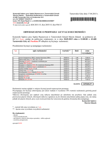 Tarnowskie Góry dnia 17.04.2015 r. Komornik Sądowy przy Sądzie Rejonowym w Tarnowskich Górach Marcin Zdunek - Kancelaria Komornicza w Tarnowskich Górach 42-600 Tarnowskie Góry ul. Krakowska 16/1 tel. (32) 7690825 7336225-27 konto: ING Bank Śląski S. A. 63105013861000002225250857 www.komornik.slask.pl W odpowiedzi podać sygn.akt: KM *0015041700773* 2831/15, Km 2855/15, Km 956/15 OBWIESZCZENIE O PIERWSZEJ LICYTACJI RUCHOMOŚCI Komornik Sądowy przy Sądzie Rejonowym w Tarnowskich Górach Marcin Zdunek na podstawie art. 867 § 1 k.p.c. podaje do publicznej wiadomości, że w dniu 20.05.2015 roku o 12:00:00 w 42-600 Tarnowskie Góry ul. Puszkina 57 odbędzie się licytacja ruchomości. Przedmiotem licytacji są następujące ruchomości: opis ruchomości l.p. 1. 2. 3. 4. 5. 6. 7. 8. 9. 10. 11. 12. 13. zestaw komputerowy DELL monitor klawiatura 2006 r. laptop marki Sony Vio 2011 rok -15 cali Samsung SCX4623 - urządzenie wielofunkcyjne Laptop IBM Thinkpad komputer w obudowie FEEL II z monitorem Samsung 2010 komputer w obudowie Digital z monitorem LG Laptop Toshiba Satelite 15 cali Laptop Sony Vio 17 cali kserokopiarka Konica Minolta Bizhup 252 urządzenie wielofunkcyjne HP 6310 All in One monitor IIVAMA Laptop HP 17 cali Drukarka HP LJP1006 wartość * ilość cena wywołania * 100,00 zł 800,00 zł 650,00 zł 150,00 zł 400,00 zł 350,00 zł 150,00 zł 300,00 zł 500,00 zł 250,00 zł 100,00 zł 250,00 zł 100,00 zł 1,00 1,00 1,00 1,00 1,00 1,00 1,00 1,00 1,00 1,00 1,00 1,00 1,00 75,00 zł 600,00 zł 487,50 zł 112,50 zł 300,00 zł 262,50 zł 112,50 zł 225,00 zł 375,00 zł 187,50 zł 75,00 zł 187,50 zł 75,00 zł RAZEM: 3.075,00 zł** Ruchomości można oglądać w miejscu licytacji przed rozpoczęciem przetargu. Przystępujący do licytacji zobowiązany jest uiścić wadium w wysokości 10% wartości ruchomości gotówką przed rozpoczęciem przetargu. Nabywca obowiązany jest zapłacić cenę nabycia natychmiast po udzieleniu mu przybicia. Gdy jednak cena przewyższa pięćset złotych, obowiązek nabywcy ogranicza się do złożenia natychmiast jednej piątej ceny, nie mniej jednak niż pięćset złotych, przy czym reszta powinna być uiszczona do godziny dwunastej dnia następnego. Komornik Sądowy Marcin Zdunek * - wartość lub cena wywołania za 1 szt. ** - łączna cena wywołania wszystkich ruchomości Do wiadomości: - dłużnik - wierzyciel/pełnomocnik - sąd rejonowy właściwy dla miejsca sprzedaży - tablica ogłoszeń - uczestnicy postępowania sporządził MDS