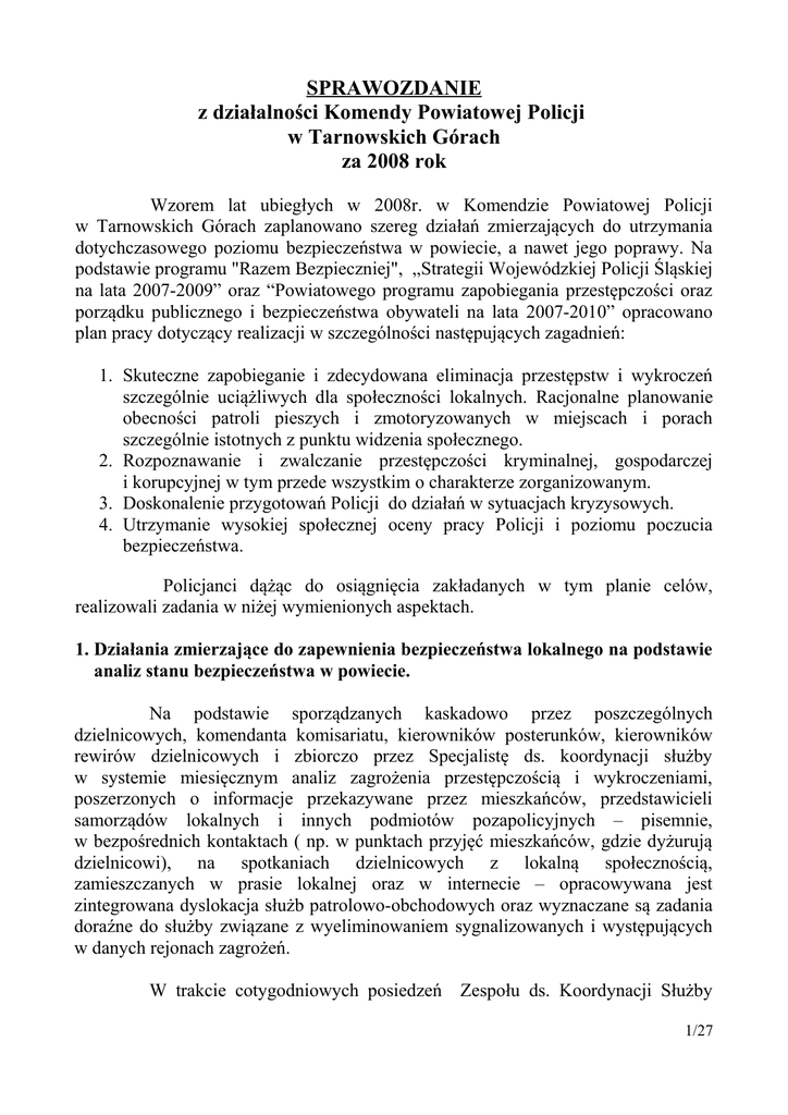 SPRAWOZDANIE z działalności Komendy Powiatowej Policji w Tarnowskich Górach za 2008 rok Wzorem lat ubiegłych w 2008r. w Komendzie Powiatowej Policji w Tarnowskich Górach zaplanowano szereg działań zmierzających do utrzymania dotychczasowego poziomu bezpieczeństwa w powiecie, a nawet jego poprawy. Na podstawie programu "Razem Bezpieczniej", „Strategii Wojewódzkiej Policji Śląskiej na lata 2007-2009” oraz “Powiatowego programu zapobiegania przestępczości oraz porządku publicznego i bezpieczeństwa obywateli na lata 2007-2010” opracowano plan pracy dotyczący realizacji w szczególności następujących zagadnień: 1. Skuteczne zapobieganie i zdecydowana eliminacja przestępstw i wykroczeń szczególnie uciążliwych dla społeczności lokalnych. Racjonalne planowanie obecności patroli pieszych i zmotoryzowanych w miejscach i porach szczególnie istotnych z punktu widzenia społecznego. 2. Rozpoznawanie i zwalczanie przestępczości kryminalnej, gospodarczej i korupcyjnej w tym przede wszystkim o charakterze zorganizowanym. 3. Doskonalenie przygotowań Policji do działań w sytuacjach kryzysowych. 4. Utrzymanie wysokiej społecznej oceny pracy Policji i poziomu poczucia bezpieczeństwa. Policjanci dążąc do osiągnięcia zakładanych w tym planie celów, realizowali zadania w niżej wymienionych aspektach. 1. Działania zmierzające do zapewnienia bezpieczeństwa lokalnego na podstawie analiz stanu bezpieczeństwa w powiecie. Na podstawie sporządzanych kaskadowo przez poszczególnych dzielnicowych, komendanta komisariatu, kierowników posterunków, kierowników rewirów dzielnicowych i zbiorczo przez Specjalistę ds. koordynacji służby w systemie miesięcznym analiz zagrożenia przestępczością i wykroczeniami, poszerzonych o informacje przekazywane przez mieszkańców, przedstawicieli samorządów lokalnych i innych podmiotów pozapolicyjnych – pisemnie, w bezpośrednich kontaktach ( np. w punktach przyjęć mieszkańców, gdzie dyżurują dzielnicowi), na spotkaniach dzielnicowych z lokalną społecznością, zamieszczanych w prasie lokalnej oraz w internecie – opracowywana jest zintegrowana dyslokacja służb patrolowo-obchodowych oraz wyznaczane są zadania doraźne do służby związane z wyeliminowaniem sygnalizowanych i występujących w danych rejonach zagrożeń. W trakcie cotygodniowych posiedzeń Zespołu ds. Koordynacji Służby 1/27 przedstawiane są i analizowane zaistniałe zdarzenia i podejmowane decyzje mające na celu ograniczenie zagrożeń w poszczególnych rejonach. Kierownicy pionów lub jednostek organizacyjnych KPP informują ponadto o mogących wystąpić zagrożeniach i przedstawiają propozycje planowanych w związku z tym działań. Koordynator określa zadania do realizacji w nadchodzącym tygodniu i wydaje polecenia z tym związane poszczególnym kierownikom komórek i jednostki organizacyjnej. Po przeprowadzonej analizie podejmuje też decyzje odnośnie potrzeb sił i środków wykorzystanych w działaniach (w zależności od rodzaju i zakresu działań, także co do uzgodnień udziału podmiotów pozapolicyjnych np. Straży Miejskiej w Tarnowskich Górach, SOK-u, Straży Leśnej, Straży Rybackiej, itp.) koordynując udział i współpracę policjantów poszczególnych pionów, komórek i jednostki organizacyjnej KPP oraz przedstawicieli podmiotów pozapolicyjnych. W trakcie posiedzeń zespołu co tydzień przedstawiane są i analizowane wyniki osiągane przez policjantów służby patrolowo-obchodowej, jak również całokształt spójności i skuteczności dyslokacji tych służb. Wnioski wynikające z tych ocen wykorzystywane są podczas planowania dyslokacji służb na kolejne czasookresy. ➢ ➢ ➢ ➢ Otrzymywaliśmy także siły wsparcia z Oddziałów Prewencji Komendy Wojewódzkiej Policji w Katowicach do wsparcia zabezpieczenia: imprez masowych odbywających się na terenie powiatu, ruchu turystyczno – wypoczynkowego w sezonie letnim nad zalewem Nakło – Chechło, przejazdów kibiców i zabezpieczenia przylotów i odlotów VIP- ów. działań Sekcji Ruchu Drogowego i Sekcji Prewencji. Uzupełnieniem sił do zabezpieczenia miasta Tarnowskie Góry były także 153 patrole mieszane policjantów i strażników miejskich, skierowanych do służby. Realizując zadania związane z bezpieczeństwem i porządkiem na obszarach wodnych, znajdujących się na terenie całego powiatu, 33- krotnie pełniono służbę wspólnie ze strażnikami Społecznej Straży Rybackiej Okręgu Polskiego Związku Wędkarskiego w Katowicach. oraz 31– krotnie z przedstawicielami tarnogórskiego Wodnego Ochotniczego Pogotowia Rarunkowego. W rejonach leśnych powiatu wykonano 21 służb wspólnie ze strażnikami Straży Leśnej Nadleśnictw w Świerklańcu i w Brynku. W ramach realizacji “Powiatowego programu zapobiegania przestępczości oraz porządku publicznego i bezpieczeństwa obywateli na lata 2007-2010” w dniu 13 czerwca 2008r. zostało podpisane porozumienie pomiędzy Starostą Powiatu a Komendantem Powiatowym Policji w Tarnowskich Górach o przydzielenie środków pieniężnych w wysokości 13 600 złotych na sfinansowanie tzw. służb kontraktowych, pełnionych przez policjantów dodatkowo w czasie wolnym od służby. Podobne porozumienie zawarto w dniu 23 lipca 2008r. pomiędzy Wójtem 2/27 Gminy Świerklaniec i Komendantem Powiatowym Policji w Tarnowskich Górach o przydzielenie środków pieniężnych w wysokości 20 000 złotych. Służby te były pełnione w dni ustawowo wolne od pracy w lipcu i sierpniu 2008r. w rejonie szczególnego natężenia ruchu turystyczno-wypoczynkowego, tj. zalewu NakłoChechło. W ramach 204 wykonanych służb policjanci m. in. zatrzymali w 6 przypadkach 13 sprawców przestępstw, przeprowadzili 110 interwencji, ujawnili 176 wykroczeń, za które nałożyli 104 mandaty karne oraz udzielili 58 pouczeń. Na podobnych zasadach zawarte zostały porozumienia z Burmistrzem Miasta Radzionków na kwo