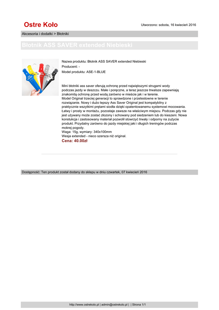 Ostre Koło Utworzono: sobota, 16 kwiecień 2016 Akcesoria i dodatki > Błotniki Błotnik ASS SAVER extended Niebieski Nazwa produktu: Błotnik ASS SAVER extended Niebieski Producent: Model produktu: ASE-1-BLUE Mini błotniki ass saver oferują ochronę przed największymi strugami wody podczas jazdy w deszczu. Małe i poręczne, a teraz jeszcze trwalsze zapewniają znakomitą ochronę przed wodą zarówno w mieście jak i w terenie. Model Original trzeciej generacji to sprawdzone i przetestowne w terenie rozwiązanie. Nowy i dużo lepszy Ass Saver Original jest kompatybilny z praktycznie wszytkimi prętami siodła dzięki opatentowanemu systemowi mocowania. Łatwy i prosty w montażu, pozostaje zawsze na właściwym miejscu. Podczas gdy nie jest używany może zostać złozony i schowany pod siedzeniem lub do kieszeni. Nowa konstukcja i zastosowany materiał pozwolił stowrzyć trwały i odporny na zużycie produkt. Przydatny zarówno do jazdy miejskiej jaki i długich treningów podczas mokrej pogody. Waga: 15g, wymiary: 340x100mm Wesja extended - nieco szersza niż original. Cena: 40.00zł Dostępność: Ten produkt został dodany do sklepu w dniu czwartek, 07 kwiecień 2016 http://www.ostrekolo.pl | [email protected] | | Strona 1/1