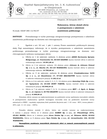 A Szpital Specjalistyczny im. J. K. Łukowicza w Chojnicach 89-600 Chojnice, ul. Leśna 10 tel. centrala (0 52) 39 56 500 tel. sekr. dyr. (0 52) 39 56 769; fax (0 52) 39 56 569 e-mail: [email protected] www.szpital.chojnice.pl Chojnice, 26 listopada 2007 r. Wykonawcy, którzy złożyli oferty w postępowaniu o udzielenie N/znak: DZAP-380-12/48/07 DOTYCZY: zamówienia publicznego Prowadzonego w trybie przetargu nieograniczonego postępowania o udzielenie zamówienia publicznego na dostawę nici chirurgicznych. I. Zgodnie z art. 92 ust. 1 pkt 1 ustawy Prawo zamówień publicznych (zwanej dalej Pzp) zamawiający informuje, że w wyniku postępowania o udzielenie zamówienia publicznego prowadzonego w trybie przetargu nieograniczonego na dostawę nici chirurgicznych wybrano następujące oferty: a. Oferta nr 1 (w zakresie: zadania 1) złożona przez AKSIS Hurtownia Sprzętu Medycznego, ul. Uczniowska 33, 80-530 GDAŃSK; łączna wartość oferty w zakresie wskazanego zadania: 18.591,68 zł. b. Oferta nr 3 (w zakresie: zadania 10) złożona przez Johnson & Johnson Poland Sp. z o. o., ul. Iłżecka 24, 02-135 WARSZAWA; łączna wartość oferty w zakresie wskazanego zadania: 10.785,60 zł. c. Oferta nr 5 (w zakresie: zadania 6) złożona przez Przedsiębiorstwo YAVO Sp. z o. o., ul. Bawełniana 17, 97-400 BEŁCHATÓW; łączna wartość oferty w zakresie wskazanych pozycji: 3.120,12 zł. d. Oferta nr 6 (w zakresie: zadań 2, 3, 4, 5, 12) złożona przez Aesculap Chifa Sp. z o.o., ul. Tysiąclecia 14, 64-300 NOWY TOMYŚL; łączna wartość oferty w zakresie wskazanych pozycji: 83.940,34 zł. e. Oferta nr 7 (w zakresie: zadań 7, 8, 9, 11) złożona przez MDT – J. Zych, A. Budyn Sp. J., ul. Lipowa 3, 30-702 KRAKÓW; łączna wartość oferty w zakresie wskazanych pozycji: 8.308,50 zł. Powyższe oferty uznano za najkorzystniejsze na podstawie oceny spełniania warunków udziału w postępowaniu (wykonawcy spełnili wymagane warunki) oraz na podstawie kryteriów oceny zawartych w SIWZ – uzyskały najwyższą ilość punktów (kryteria zad. 1-10: cena – 80%, ocena jakości – 20%; zad. 11-12: cena – 100%). Ponadto złożone zostały 3 oferty, która nie zostały uznane za najkorzystniejsze w żadnej z pozycji: Oferta nr 2 złożona przez DAMEN Sp. z o.o., ul. Piłsudskiego 257a, 05-261 MARKI, Oferta nr 4 złożona przez Alcon Polska Sp. z o.o., ul. Żelazna 28/30, 00-832 WARSZAWA, Oferta nr 8 złożona przez Tyco Polska Sp. z o.o., Al. Jerozolimskie 162, 02-342 WARSZAWA. Szczegółowa punktacja wszystkich złożonych ofert w ramach poszczególnych pozycji w załączeniu. REGON: 000308169 BANK BPH S.A. NIP: 555-17-83-839 34 10600076 0000402250010149 II. Zgodnie z art. 92 ust. 1 pkt 2 Pzp zamawiający informuje, że odrzucono następujące oferty: 1. oferta nr 2 złożona przez DAMEN Sp. z o.o., ul. Piłsudskiego 257a, 05-261 MARKI – na podstawie art. 89 ust. 1 pkt 2 Pzp. Zamawiający wymagał w SIWZ (rozdz. IV pkt 1.3) złożenia w ofercie zaakceptowanego projektu umowy, który stanowił załącznik nr 5 do SIWZ. Wykonawca nie dołączył tego dokumentu (niepodlegającego uzupełnieniu na podst. art. 26 ust. 3 Pzp), w związku powyższym oferta podlega odrzuceniu jako niezgodna z treścią specyfikacji istotnych warunków zamówienia. 2. oferta nr 3 złożona przez Johnson & Johnson Poland Sp. z o. o., ul. Iłżecka 24, 02-135 WARSZAWA (w zakresie zad. 9) – na podstawie art. 89 ust. 1 pkt 2 Pzp. Zamawiający wymagał dołączenia próbek poszczególnych nici w ilościach określonych w załączniku nr 2 do SIWZ. Wykonawca złożył do zadania 9 próbki nieodpowiadające wymaganiom SIWZ. W związku z powyższym oferta w ramach wskazanego zadania podlega odrzuceniu. 3. oferta nr 5 złożona przez Przedsiębiorstwo YAVO Sp. z o. o., ul. Bawełniana 17, 97-400 BEŁCHATÓW (w zakresie zad. 8) – na podstawie 89 ust.1 pkt 4 w zw. z art. 90 ust. 3 Pzp. Zamawiający w toku postępowania zwrócił się do Wykonawcy (na zasadzie art. 90 ust.1 Pzp) o udzielenie wyjaśnień dot. elementów oferty mających wpływ na wysokość ceny w celu ustalenia czy oferta w ramach wskazanego zadania zawiera rażąco niską cenę. Z udzielonych wyjaśnień wynika, że zaszła pomyłka w podaniu ceny netto za 1 saszetkę i stąd duża różnica w wartości brutto całego pakietu. Biorąc pod uwagę powyższe oferta w zakresie zad. 8 podlega odrzuceniu zawierająca rażąco niską cenę w stosunku do przedmiotu zamówienia. Zamawiający składa podziękowanie wszystkim uczestnikom postępowania przetargowego. Z poważaniem Z-ca dyrektora ds. ekonomicznych Maria Nieżorawska A.W. Punktacja w ramach poszczególnych kryteriów - PN na dostawę nici chirurgicznych Zad. 1 Kryterium/Oferent AKSIS DAMEN cena 80 jakość 2,5 oferta odrzucona oferta odrzucona Razem punkty: Zad. 2 Kryterium/Oferent 20 0 0 AKSIS DAMEN J&J ALCON YAVO AESCULAP MDT TYCO oferta odrzucona oferta odrzucona 80 32,67 20 20 0 0 0 0 0 100 0 52,67 AKSIS DAMEN J&J ALCON YAVO AESCULAP MDT TYCO oferta odrzucona oferta odrzucona 80 20 0 0 0 0 0 100 0 0 AKSIS DAMEN J&J ALCON YAVO AESCULAP MDT TYCO oferta odrzucona oferta odrzucona 80 44,29 20 20 0 0 0 0 0 100 0 64,29 AKSIS DAMEN J&J ALCON YAVO AESCULAP MDT TYCO 64,74 80 11,25 20 75,99 100 0 0 oferta odrzucona oferta odrzucona cena jakość Razem punkty: 54,16 74,16 jakość Zad. 5 Kryterium/Oferent TYCO 0 cena Razem punkty: MDT 0 jakość Zad. 4 Kryterium/Oferent AESCULAP 0 cena Razem punkty: YAVO 0 jakość Zad. 3 Kryterium/Oferent ALCON 82,5 cena Razem punkty: J&J 0 0 0 0 Zad. 6 Kryterium/Oferent AKSIS DAMEN J&J oferta odrzucona oferta odrzucona 0 0 77,6 AKSIS DAMEN J&J cena jakość Razem punkty: Zad. 7 Kryterium/Oferent jakość Zad.8 Kryterium/Oferent 80 47,54 24,98 20 7,5 20 20 0 87,5 67,54 0 44,98 ALCON YAVO AESCULAP MDT TYCO 80 12,5 0 0 92,5 0 AKSIS DAMEN J&J ALCON YAVO AESCULAP MDT TYCO oferta odrzucona oferta odrzucona oferta odrzucona oferta odrzucona 33,09 64,55 20 10 0 0 53,09 74,55 0 0 92,5