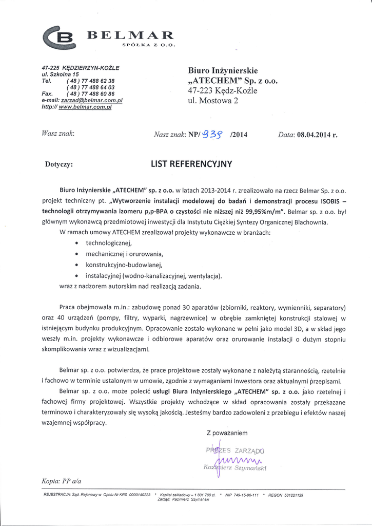 (g Brc,LlvrAR. spÓŁxa z Q.o. Y KĘDzl ERzYN-xQŻrc ul. Szkolna 15 47 -225 Tel. ( 48 a iI: Sp. z o.o. ) 77 488 62 38 ''ATECHEM" 47 -223 Kędz-KoźIe (48)774886403 Fax. e-m Biuro Inżynierskie ) 77 488 60 86 rzad@bel m a r. c om.ol ( 48 za http : // www. ul. Mostowa2 b el m ? r. c o m.,p I Wasz znak; Nasz znak;NPl I39 Data:08.04.2014 r. 12014 LIST REFERENCYJNY Dotycry: Biuro lnżynierskie ,,ATECHEM" sp. z o.o. w latach 2013-2014 r. zrealizowało na rzecz Belmar Sp. z o'o. projekt techniczny pt. ,,Wytworzenie instalacji modelowej do badań i demonstracji procesu lsoBls _ technologii otrzymywania izomeru p,p-BPA o czystości nie niższej niż 99,95Yom/m"' Belmar sp. z o.o. był głównym wykonawcą przedmiotowej inwestycjidla lnstytutu Ciężkiej Syntezy organicznej Blachownia' W ramach umowy ATECHEM zreatizował projekty wykonawcze w branżach: o o o o technologicznej, mechanicznej i orurowania, konstrukcyjno-budowlanei, instalacyjnei (wodno-kanalizacyjnej, wentylacja). wrazz nadzorem autorskim nad realizacją zadania. Praca obejmowała m.in': zabudowę ponad 30 aparatów (zbiorniki, reaktory, wymienniki, separatory) oraz 40 urządzeń (pompy, filtry, wyparki, nagrzewnice) w obrębie zamkniętej konstrukcji stalowej w istniejącym budynku produkcyjnym. opracowanie zostało wykonane w pełnijako model 3D, a w skład jego weszły m.in. projekty wykonawcze i odbiorowe aparatów oraz orurowanie instalacji o dużym stopniu skomplikowania wraz z wizualizacjami. Belmar sp. z o'o. potwierdza, że prace projektowe zostały wykonane z należytą starannością,rzetelnie i fachowo w terminie ustalonym w umowie, zgodnie z wymaganiami lnwesto ra oraz aktualnymi przepisami. Belmar sp. z o.o. może polecić usługi Biura lnżynierskiego ,,ATECHEM" sp. z o.o. jako rzetelnej i fachowej firmy projektowej' Wszystkie projekty wchodzące w skład opracowania zostały przekazane terminowo i charakteryzowały się wysoką jakością. Jesteśmybardzo zadowoleni z przebiegu i efektów naszej wzajemnej współpracy. S ZARZĄDU tier'z Szgmański Kopia: PP a/a REJE9TRA9JA: sąd. Rejonowy W opolu Nr KRs 0000140223 - Kapitał zakładowy - 1 8o1 7oo zł' zanąd: Kazimierz szymański NtP 749-15-96-111 . REGON 531221129