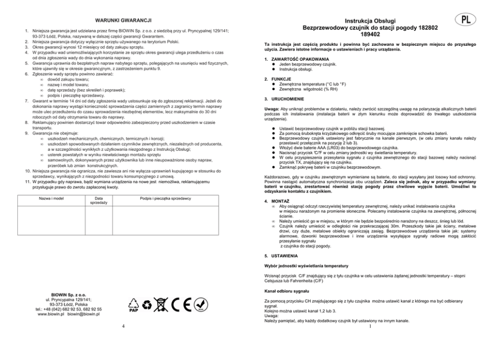 WARUNKI GWARANCJI 1. Niniejsza gwarancja jest udzielana przez firmę BIOWIN Sp. z o.o. z siedzibą przy ul. Pryncypalnej 129/141; 93-373 Łódź, Polska, nazywaną w dalszej części gwarancji Gwarantem. 2. Niniejsza gwarancja dotyczy wyłącznie sprzętu używanego na terytorium Polski. 3. Okres gwarancji wynosi 12 miesięcy od daty zakupu sprzętu. 4. W przypadku wad uniemożliwiających korzystanie ze sprzętu okres gwarancji ulega przedłużeniu o czas od dnia zgłoszenia wady do dnia wykonania naprawy. 5. Gwarancja uprawnia do bezpłatnych napraw nabytego sprzętu, polegających na usunięciu wad fizycznych, które ujawniły się w okresie gwarancyjnym, z zastrzeżeniem punktu 9. 6. Zgłoszenie wady sprzętu powinno zawierać: • dowód zakupu towaru; • nazwę i model towaru; • datę sprzedaży (bez skreśleń i poprawek); • podpis i pieczątkę sprzedawcy. 7. Gwarant w terminie 14 dni od daty zgłoszenia wady ustosunkuje się do zgłoszonej reklamacji. Jeżeli do dokonania naprawy wystąpi konieczność sprowadzenia części zamiennych z zagranicy termin naprawy może ulec przedłużeniu do czasu sprowadzenia niezbędnej elementów, lecz maksymalnie do 30 dni roboczych od daty otrzymania towaru do naprawy. 8. Reklamujący powinien dostarczyć towar odpowiednio zabezpieczony przed uszkodzeniem w czasie transportu. 9. Gwarancja nie obejmuje: • uszkodzeń mechanicznych, chemicznych, termicznych i korozji; • uszkodzeń spowodowanych działaniem czynników zewnętrznych, niezależnych od producenta, a w szczególności wynikłych z użytkowania niezgodnego z Instrukcją Obsługi; • usterek powstałych w wyniku niewłaściwego montażu sprzętu • samowolnych, dokonywanych przez użytkownika lub inne nieupoważnione osoby napraw, przeróbek lub zmian konstrukcyjnych. 10. Niniejsza gwarancja nie ogranicza, nie zawiesza ani nie wyłącza uprawnień kupującego w stosunku do sprzedawcy, wynikających z niezgodności towaru konsumpcyjnego z umową. 11. W przypadku gdy naprawa, bądź wymiana urządzenia na nowe jest niemożliwa, reklamującemu przysługuje prawo do zwrotu zapłaconej kwoty. Nazwa i model Data sprzedaży Podpis i pieczątka sprzedawcy Instrukcja Obsługi Bezprzewodowy czujnik do stacji pogody 182802 189402 Ta instrukcja jest częścią produktu i powinna być zachowana w bezpiecznym miejscu do przyszłego użycia. Zawiera istotne informacje o ustawieniach i pracy urządzenia. 1. ZAWARTOŚĆ OPAKOWANIA Jeden bezprzewodowy czujnik. Instrukcja obsługi. 2. FUNKCJE Zewnętrzna temperatura (° C lub ° F) Zewnętrzna wilgotność (% RH) 3. URUCHOMIENIE Uwaga: Aby uniknąć problemów w działaniu, należy zwrócić szczególną uwagę na polaryzację alkalicznych baterii podczas ich instalowania (instalacja baterii w złym kierunku może doprowadzić do trwałego uszkodzenia urządzenia). Ustawić bezprzewodowy czujnik w pobliżu stacji bazowej. Za pomocą śrubokręta krzyżakowego odkręcić śruby mocujące zamknięcie schowka baterii. Bezprzewodowy czujnik ustawiony jest fabrycznie na kanale pierwszym, (w celu zmiany kanału należy przestawić przełącznik na pozycję 2 lub 3). Włożyć dwie baterie AAA (LR03) do bezprzewodowego czujnika. Nacisnąć przycisk °C/°F w celu zmiany jednostki wy świetlania temperatury. W celu przyspieszenia przesyłania sygnału z czujnika zewnętrznego do stacji bazowej należy nacisnąć przycisk TX, znajdujący się na czujniku. Zamknąć pokrywę baterii w czujniku bezprzewodowym. Każdorazowo, gdy w czujniku zewnętrznym wymieniane są baterie, do stacji wysyłany jest losowy kod ochronny. Powinna nastąpić automatyczna synchronizacja obu urządzeń. Zaleca się jednak, aby w przypadku wymiany baterii w czujniku, zrestartować również stację pogody przez chwilowe wyjęcie baterii. Umożliwi to odzyskanie kontaktu z czujnikiem. 4. MONTAŻ • Aby osiągnąć odczyt rzeczywistej temperatury zewnętrznej, należy unikać instalowania czujnika w miejscu narażonym na promienie słoneczne. Polecamy instalowanie czujnika na zewnętrznej, północnej ścianie. • Należy umieścić go w miejscu, w którym nie będzie bezpośrednio narażony na deszcz, śnieg lub lód. • Czujnik należy umieścić w odległości nie przekraczającej 30m. Przeszkody takie jak ściany, metalowe drzwi, czy duże, metalowe obiekty ograniczają zasięg. Bezprzewodowe urządzenia takie jak: systemy alarmowe, dzwonki bezprzewodowe i inne urządzenia wysyłające sygnały radiowe mogą zakłócić przesyłanie sygnału z czujnika do stacji pogody. 5. USTAWIENIA Wybór jednostki wyświetlania temperatury Wcisnąć przycisk C/F znajdujący się z tyłu czujnika w celu ustawienia żądanej jednostki temperatury – stopni Celsjusza lub Fahrenheita (C/F) Kanał odbioru sygnału BIOWIN Sp. z o.o. ul. Pryncypalna 129/141; 93-373 Łódź, Polska tel.: +48 (042) 682 92 53, 682 92 55 www.biowin.pl [email protected] Za pomocą przycisku CH znajdującego się z tyłu czujnika można ustawić kanał z którego ma być odbierany sygnał. Kolejno można ustawić kanał 1,2 lub 3. Uwaga: Należy pamiętać, aby każdy dodatkowy czujnik był ustawiony na innym kanale. 4 1 Środki ostrożności: • • • • • Nie narażać urządzenia na działanie silnych wibracji i obciążeń mechanicznych. Unikać nagłych, znacznych zmian temperatury (bezpośredniego promieniowania słonecznego, wysokich temperatur ujemnych). Do czyszczenia obudowy i wyświetlacza stosować miękką, lekko zwilżoną ściereczkę Nie zanurzać urządzenia w wodzie. Wyczerpane baterie natychmiast usunąć z urządzenia. Stosować wyłącznie wskazany poniżej typ baterii. Symbol ten, umieszczany na urządzeniach elektrycznych i elektronicznych oznacza, że zakupiony produkt nie powinien być usuwany razem ze zwykłymi odpadami z gospodarstw domowych. Należy go przekazać do odpowiedniego punktu, który zajmuje się zbieraniem i recyklingiem urządzeń elektrycznych i elektronicznych. Pozb