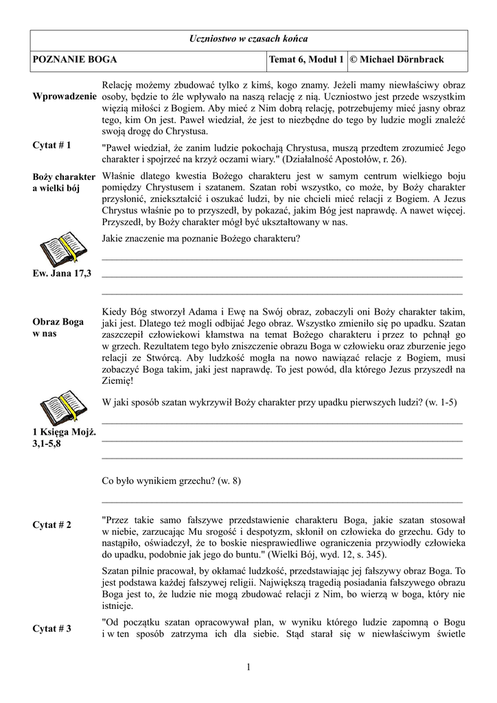 Uczniostwo w czasach końca POZNANIE BOGA Temat 6, Moduł 1 © Michael Dörnbrack Relację możemy zbudować tylko z kimś, kogo znamy. Jeżeli mamy niewłaściwy obraz Wprowadzenie osoby, będzie to źle wpływało na naszą relację z nią. Uczniostwo jest przede wszystkim więzią miłości z Bogiem. Aby mieć z Nim dobrą relację, potrzebujemy mieć jasny obraz tego, kim On jest. Paweł wiedział, że jest to niezbędne do tego by ludzie mogli znaleźć swoją drogę do Chrystusa. Cytat # 1 "Paweł wiedział, że zanim ludzie pokochają Chrystusa, muszą przedtem zrozumieć Jego charakter i spojrzeć na krzyż oczami wiary." (Działalność Apostołów, r. 26). Boży charakter Właśnie dlatego kwestia Bożego charakteru jest w samym centrum wielkiego boju pomiędzy Chrystusem i szatanem. Szatan robi wszystko, co może, by Boży charakter a wielki bój przysłonić, zniekształcić i oszukać ludzi, by nie chcieli mieć relacji z Bogiem. A Jezus Chrystus właśnie po to przyszedł, by pokazać, jakim Bóg jest naprawdę. A nawet więcej. Przyszedł, by Boży charakter mógł być ukształtowany w nas. Jakie znaczenie ma poznanie Bożego charakteru? ________________________________________________________________________ Ew. Jana 17,3 ________________________________________________________________________ ________________________________________________________________________ Obraz Boga w nas Kiedy Bóg stworzył Adama i Ewę na Swój obraz, zobaczyli oni Boży charakter takim, jaki jest. Dlatego też mogli odbijać Jego obraz. Wszystko zmieniło się po upadku. Szatan zaszczepił człowiekowi kłamstwa na temat Bożego charakteru i przez to pchnął go w grzech. Rezultatem tego było zniszczenie obrazu Boga w człowieku oraz zburzenie jego relacji ze Stwórcą. Aby ludzkość mogła na nowo nawiązać relacje z Bogiem, musi zobaczyć Boga takim, jaki jest naprawdę. To jest powód, dla którego Jezus przyszedł na Ziemię! W jaki sposób szatan wykrzywił Boży charakter przy upadku pierwszych ludzi? (w. 1-5) ________________________________________________________________________ 1 Księga Mojż. ________________________________________________________________________ 3,1-5,8 ________________________________________________________________________ Co było wynikiem grzechu? (w. 8) ________________________________________________________________________ Cytat # 2 "Przez takie samo fałszywe przedstawienie charakteru Boga, jakie szatan stosował w niebie, zarzucając Mu srogość i despotyzm, skłonił on człowieka do grzechu. Gdy to nastąpiło, oświadczył, że to boskie niesprawiedliwe ograniczenia przywiodły człowieka do upadku, podobnie jak jego do buntu." (Wielki Bój, wyd. 12, s. 345). Szatan pilnie pracował, by okłamać ludzkość, przedstawiając jej fałszywy obraz Boga. To jest podstawa każdej fałszywej religii. Największą tragedią posiadania fałszywego obrazu Boga jest to, że ludzie nie mogą zbudować relacji z Nim, bo wierzą w boga, który nie istnieje. Cytat # 3 "Od początku szatan opracowywał plan, w wyniku którego ludzie zapomną o Bogu i w ten sposób zatrzyma ich dla siebie. Stąd starał się w niewłaściwym świetle 1 przedstawić charakter Boży i sprawić, by ludzie wysoko cenili tą fałszywą koncepcję. Stwórca został przedstawiony ich umysłom z atrybutami samego księcia zła – jako arbitralny, surowy i bezlitosny - tak by ludzie stronili od Niego, bali się Go, a nawet darzyli nienawiścią. Szatan miał nadzieję tak zmylić umysły tych, których oszukał, by usunęli z nich wszelką wiedzę o Bogu. Wtedy wymazałby z pamięci człowieka święty obraz i odbił w duszy swoje własne podobieństwo; wpoiłby ludziom swojego własnego ducha i zrobiłby z nich jeńców zgodnie ze swoją wolą." (Testimonies for the Church, vol. 5, s. 738, przekład własny). Cytat # 4 "Pomimo tych wszystkich dowodów ludzie spoglądali na Boga z lękiem, ponieważ wróg tego, co dobre przyćmił ich umysły. Myśleli o Bogu jako o istocie surowej i nieprzebaczającej. Szatan spowodował, że ludzie zaczęli postrzegać Boga jako istotę cechującą się srogą sprawiedliwością, która jest surowym sędzią i szorstkim, wymagającym wierzycielem. Malował obraz Stworzyciela, który zawistnym okiem wychwytuje błędy i potknięcia ludzi, tak aby mógł wykonać na nich wyrok. Jezus żył wśród ludzi, aby usunąć ten okropny cień objawiając światu nieskończoną miłość Boga." (Droga do Chrystusa, r. 1). Po upadku Bóg ani jednym słowem nie bronił się przed oskarżeniami szatana. On po prostu pokazał, że jest zupełnie inny niż mówił szatan. Przeczytaj następujący fragment i napisz, jak Bóg odsłania Swój charakter! 1 Księga Mojż. ________________________________________________________________________ 3,8-21 ________________________________________________________________________ ________________________________________________________________________ ________________________________________________________________________ Bóg demonstruje Swój charakter W tekstach, które przeczytaliśmy, Boży charakter jest wyraźnie przedstawiony na kilka sposobów: 1. Zamiast rozmawiać z Adamem i Ewą z niebiańskiej sali sądowej, Bóg opuścił niebo i zszedł na ziemię. Później Chrystus zrobił dokładnie to samo, kiedy zostawił Niebo i stał się człowiekiem. 2. Bóg szukał Adama i Ewy i zadawał im pytania. Nie dlatego, że nie znał na nie odpowiedzi, ale dlatego, że chciał, by okazali skruchę. Bóg, który zadaje pytania, jest Bogiem, który ocala. 3. Boża odraza do grzechu jest jasno ukazana w wyroku jaki został wydany na szatana. I chociaż Bóg nienawidzi grzechu to jednak kocha grzesznika. 4. Bóg jest także sprawiedliwy. Adam z Ewą musieli opuścić raj i ponieść konsekwencje swojego grzechu. Ale Bóg nie odprawił ich z raju bez nadziei. W wypowiedzi skierowanej przez Boga do szatana została dana obietnica o p