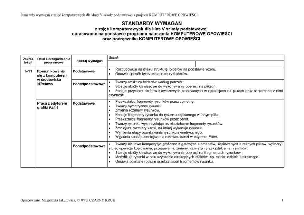 Standardy wymagań z zajęć komputerowych dla klasy V szkoły podstawowej z projektu KOMPUTEROWE OPOWIEŚCI STANDARDY WYMAGAŃ z zajęć komputerowych dla klas V szkoły podstawowej opracowane na podstawie programu nauczania KOMPUTEROWE OPOWIEŚCI oraz podręcznika KOMPUTEROWE OPOWIEŚCI Zakres lekcji 1–11 Dział lub zagadnienie programowe Rodzaj wymagań Komunikowanie się z komputerem w środowisku Windows Podstawowe Praca z edytorem grafiki Paint Podstawowe Ponadpodstawowe Ponadpodstawowe Uczeń: Rozbudowuje na dysku strukturę folderów na podstawie wzoru. Omawia sposób tworzenia struktury folderów. Tworzy strukturę folderów według potrzeb. Stosuje skróty klawiszowe do wykonywania operacji na plikach. Podaje przykłady skrótów klawiszowych stosowanych w operacjach na plikach oraz skojarzone z nimi czynności. Przekształca fragmenty rysunków przez symetrię. Tworzy symetryczne rysunki. Zmienia rozmiary rysunków. Kopiuje fragmenty rysunku do rysunku zapisanego w innym pliku. Przekształca fragmenty rysunków przez obrót. Tworzy rysunki, wykorzystując przekształcone fragmenty rysunków. Zmniejsza rozmiary kartki, na której wykonuje rysunek. Wymienia etapy powstawania rysunku symetrycznego. Wyjaśnia sposób zmniejszania rozmiaru kartki w edytorze Paint. Tworzy ciekawe kompozycje graficzne z gotowych elementów, kopiowanych z różnych plików, wykorzystując operacje kopiowania, przesuwania, zmiany rozmiaru i przekształcania rysunków. Stosuje skróty klawiszowe do wykonywania operacji na fragmentach rysunków. Modyfikuje rysunki w celu uzyskania atrakcyjnych efektów, np. cienia, odbicia lustrzanego. Omawia poznane rodzaje przekształceń fragmentów rysunku. Opracowanie: Małgorzata Jakutowicz, © Wyd. CZARNY KRUK 1 Standardy wymagań z zajęć komputerowych dla klasy V szkoły podstawowej z projektu KOMPUTEROWE OPOWIEŚCI Praca z edytorem tekstu Word Podstawowe Przenosi i kopiuje fragmenty tekstu poprzez Schowek, posługując się skrótami klawiszowymi. Formułuje krótką wypowiedź według podanego planu, wykorzystuje zgromadzone słownictwo. Zapisuje zmodyfikowany dokument pod nową nazwą w folderze przeznaczonym na swoje dokumenty tekstowe. Pisze tekst z podziałem na akapity. Formatuje akapit: ustala wcięcie pierwszego wiersza akapitu i wcięcia całego akapitu oraz wyrównanie tekstu w akapitach według opisu. Uzupełnia treść dokumentu tekstowego na podstawie informacji znalezionych w komputerowym atlasie. Zapisuje swoją pracę w czasie jej tworzenia. Kopiuje za pośrednictwem Schowka elementy graficzne do dokumentu tekstowego z pliku otwartego w edytorze grafiki. Ustala położenie elementu graficznego względem tekstu i rodzaj otaczania rysunku tekstem według opisu. Wstawia do tekstu rysunek z galerii klipartów. Wstawia do testu rysunek zapisany w pliku z wykorzystaniem polecenia Obraz z menu Wstaw. Otacza ramką element graficzny umieszczony w tekście. Zmienia rozmiar elementu graficznego umieszczonego w tekście. Wstawia do tekstu ozdobne napisy z galerii Word-Art. Zmienia styl oraz cechy czcionki obiektu WordArt. Zmienia układ, rozmiar i położenie obiektu Word-Art. Powiększa i pomniejsza widok dokumentu w podglądzie wydruku. Dokonuje zmian w ustawieniach strony według wskazówek. Drukuje dokument tekstowy. Opisuje cztery rodzaje wyrównania tekstu w akapicie. Rozpoznaje na pasku formatowania przyciski służące do wyrównywania tekstu w akapitach. Omawia rodzaje stosowanych w tekście wcięć. Opracowanie: Małgorzata Jakutowicz, © Wyd. CZARNY KRUK 2 Standardy wymagań z zajęć komputerowych dla klasy V szkoły podstawowej z projektu KOMPUTEROWE OPOWIEŚCI Ponadpodstawowe Korzystanie z programów edukacyjnych Podstawowe Ponadpodstawowe Analizuje tekst dokumentu i samodzielnie wprowadza zmiany zmierzające do uporządkowania jego treści. Stosuje skróty klawiszowe do wykonywania różnych operacji, np. otwierania pliku. Projektuje i redaguje dokumenty tekstowe na zadany temat. Ilustruje dokumenty tekstowe elementami graficznymi. Formatuje dokumenty tekstowe, dobiera formę dokumentu stosownie do jego treści. Formatuje umieszczony w tekście element graficzny według własnego pomysłu. Dba o kompozycję tekstu i elementów graficznych, nadając dokumentowi czytelną, estetyczna formę. Analizuje różnice w przygotowaniu dokumentu do druku w programach Paint i Word. Ustala szerokość marginesów i orientację strony. Ustala liczbę kopii i jakość wydruku. Objaśnia sposób ustalania wcięć w tekście za pomocą polecenia Akapit z menu Format. Wyjaśnia potrzebę częstego zapisywania swojej pracy. Omawia sposób umieszczenia fragmentu rysunku w dokumencie tekstowym. Rozróżnia rodzaje otaczania rysunku tekstem (układ). Omawia sposób ustalania otoczenia rysunku tekstem. Wyjaśnia pojęcie klipartu. Opisuje sposób wyszukiwania klipartów w galerii klipartów. Omawia rodzaje obramowania wstawionego elementu graficznego i sposoby ich ustalania. Objaśnia zastosowanie narzędzi do edycji i formatowania napisu WordArt. Omawia etapy przygotowania dokumentu do druku. Obsługuje komputerowy atlas Rośliny łąk i ogrodów z płyty CD-ROM. Wyszukuje w atlasie informacje na określony temat. Korzysta z programu edukacyjnego Bezpieczeństwo i pierwsza pomoc, uruchomionego z płyty CD-ROM, do utrwalenia swojej wiedzy z określonej dziedziny. Sprawdza swoją wiedzę, wykonując komputerowy quiz i analizując jego wyniki. Podaje przykładowe zakresy tematyczne atlasów komputerowych. Opisuje sposoby wyszukiwania haseł w komputerowym atlasie. Korzysta z komputerowego atlasu do poszerzania swoich wiadomości. Wykorzystuje programy edukacyjne do utrwalenia i sprawdzenia swojej wiedzy. Omawia zakres zawartości tematycznych atlasów komputerowych. Opracowanie: Małgorzata Jakutowicz, © Wyd. CZARNY KRUK 3 Standardy wymagań z zajęć komputerowych dla klasy V szkoły podstawowej z projektu KOMPUTEROWE OPOWIEŚCI 12–22 Komunikowanie się z kom