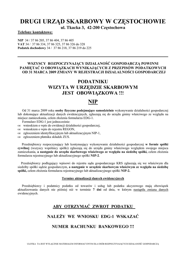 DRUGI URZĄD SKARBOWY W CZĘSTOCHOWIE ul. Tkacka 3, 42-200 Częstochowa Telefony kontaktowe: NIP 34 / 37 86 205, 37 86 404, 37 86 405 VAT 34 / 37 86 334, 37 86 325, 37 86 326 do 328 Podatek dochodowy 34 / 37 86 218, 37 86 219 do 225 ________________________________________________ WSZYSCY ROZPOCZYNAJĄCY DZIAŁANOŚĆ GOSPODARCZĄ POWINNI PAMIĘTAĆ O OBOWIĄZKACH WYNIKAJĄCYCH Z PRZEPISÓW PODATKOWYCH OD 31 MARCA 2009 ZMIANY W REJESTRACJI DZIAŁALNOŚCI GOSPODARCZEJ PODATNIKU WIZYTA W URZĘDZIE SKARBOWYM JEST OBOWIĄZKOWA !!! NIP Od 31 marca 2009 roku osoby fizyczne podejmujące samodzielnie wykonywanie działalności gospodarczej lub dokonujące aktualizacji danych ewidencyjnych, zgłaszają się do urzędu gminy właściwego ze względu na miejsce zamieszkania, celem złoŜenia formularza EDG-1. Formularz EDG-1 jest jednocześnie: wnioskiem o wpis do ewidencji działalności gospodarczej, wnioskiem o wpis do rejestru REGON, zgłoszeniem identyfikacyjnym lub aktualizacyjnym NIP-1, zgłoszeniem płatnika składek ZUS. Przedsiębiorcy rozpoczynający lub kontynuujący wykonywanie działalności gospodarczej w formie spółki cywilnej (wszyscy wspólnicy spółki) zgłaszają się do urzędu gminy właściwego względem swojego miejsca zamieszkania, a następnie do urzędu skarbowego właściwego ze względu na siedzibę spółki, celem złoŜenia formularza rejestracyjnego lub aktualizacyjnego spółki NIP-2. Przedsiębiorcy podlegający wpisowi do rejestru sądu gospodarczego KRS zgłaszają się we właściwym dla siedziby spółki sądzie gospodarczym, a następnie w urzędzie skarbowym właściwym ze względu na siedzibę spółki, celem złoŜenia formularza rejestracyjnego lub aktualizacyjnego spółki NIP-2. Terminy aktualizacji danych ewidencyjnych Przedsiębiorcy i podatnicy podatku od towarów i usług lub podatku akcyzowego mają obowiązek aktualizowania danych nie później niŜ w terminie 7 dni od dnia, w którym nastąpiła zmiana danych ewidencyjnych. ABY OTRZYMAĆ ZWROT PODATKU NALEśY WE WNIOSKU EDG-1 WSKAZAĆ NUMER RACHUNKU BANKOWEGO !!! ULOTKA TA JEST WYŁĄCZNIE MATERIAŁEM INFORMACYJNYM DLA OSÓB ROZPOCZYNAJĄCYCH DZIAŁANOŚĆ GOSPODARCZĄ PODATEK DOCHODOWY OD OSÓB FIZYCZNYCH Podatnicy rozpoczynający prowadzenie działalności gospodarczej mają moŜliwość wyboru jednej z trzech form opodatkowania : 1. Zasady ogólne - PODATEK OD DOCHODU podatek od dochodu według skali podatkowej ( w 2009r. – 18% i 32%) Aby korzystać z tej formy naleŜy : złoŜyć do US właściwego wg. miejsca zamieszkania zawiadomienie o zaprowadzeniu podatkowej księgi przychodów w terminie 20 dni od dnia jej załoŜenia. podatek liniowy od dochodu ( 19%) Aby korzystać z tej formy naleŜy : złoŜyć do US właściwego wg. miejsca zamieszkania oświadczenie o wyborze opodatkowania dochodów stawką 19% w terminie – do dnia poprzedzającego dzień rozpoczęcia działalności, nie później niŜ w dniu uzyskania pierwszego przychodu. 2. Ryczałt od przychodów ewidencjonowanych - PODATEK OD PRZYCHODU Podatek od przychodu według stawek: 3% - głównie: handel 5,5% - głównie: produkcja 8,5% - głównie: usługi 17% i 20 % - inne Aby korzystać z tej formy naleŜy : złoŜyć do US właściwego wg. miejsca zamieszkania oświadczenie o wyborze opodatkowania w formie ryczałtu od przychodów ewidencjonowanych w terminie – do dnia poprzedzającego dzień rozpoczęcia działalności, nie później niŜ w dniu uzyskania pierwszego przychodu. 3. Karta podatkowa - STAŁA STAWKA PODATKU - ustalana przez urząd Aby korzystać z tej formy naleŜy : złoŜyć do US właściwego wg. miejsca zamieszkania wniosek PIT-16 o zastosowanie opodatkowania w formie karty podatkowej w terminie przed rozpoczęciem działalności. Prowadząc działalność w formie spółki cywilnej , jawnej , komandytowej – kaŜdy ze wspólników obowiązany jest złoŜyć stosowne zawiadomienie do US zgodnie z właściwością miejscową według miejsca swojego zamieszkania. Płatnik podatku dochodowego – spółki cywilne osób fizycznych zatrudniające pracowników Zgłoszenie właściwemu organowi podatkowemu imion, nazwisk i adresów wyznaczonych osób, do obowiązków których naleŜy obliczanie, pobieranie i terminowe wpłacanie do organu podatkowego podatku od wynagrodzeń zatrudnionych osób w terminie do dnia 20 miesiąca następującego po miesiącu, w którym pobrano pierwsze zaliczki . ULOTKA TA JEST WYŁĄCZNIE MATERIAŁEM INFORMACYJNYM DLA OSÓB ROZPOCZYNAJĄCYCH DZIAŁANOŚĆ GOSPODARCZĄ VAT Podatnik rozpoczynający działalność gospodarczą, jeśli chce lub ma obowiązek być podatnikiem podatku VAT, przed dniem wykonania pierwszej czynności podlegającej opodatkowaniu tym podatkiem jest obowiązany dodatkowo złoŜyć naczelnikowi urzędu skarbowego zgłoszenie rejestracyjne na formularzu VAT-R. Właściwym dla podatnika organem podatkowym jest naczelnik urzędu skarbowego właściwy ze względu na miejsce wykonywania czynności podlegających opodatkowaniu podatkiem od towarów i usług. JeŜeli czynności podlegające opodatkowaniu podatkiem od towaru i usług są wykonywane na terenie działania dwóch lub więcej urzędów skarbowych, właściwość miejscową dla osób fizycznych ustala się ze względu na miejsce zamieszkania. Podatnik rozpoczynający w trakcie roku podatkowego wykonywanie czynności podlegających opodatkowaniu podatkiem VAT jest zwolniony z tego podatku, jeśli wartość sprzedaŜy nie przekroczy w proporcji do okresu prowadzonej działalności gospodarczej w roku podatkowym kwoty 50.000 zł JednakŜe od tej reguły są wyjątki, tj. nie stosuje się zwolnień od podatku VAT wobec podatników dokonujących m. in.: - dostaw wyrobów z metali szlachetnych lub z udziałem tych metali, towarów opodatkowanych podatkiem akcyzowym z wyłączeniem energii elektrycznej i wyrobów tytoniowych, terenów budowlanych oraz przeznaczonych pod zabudowę, - świadczących usługi prawnicze