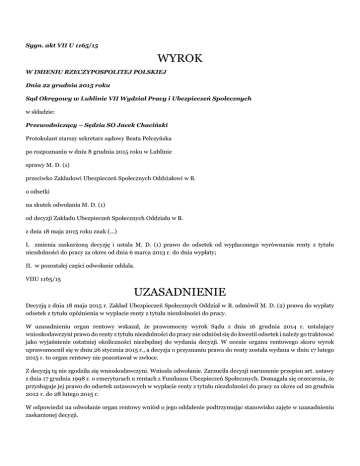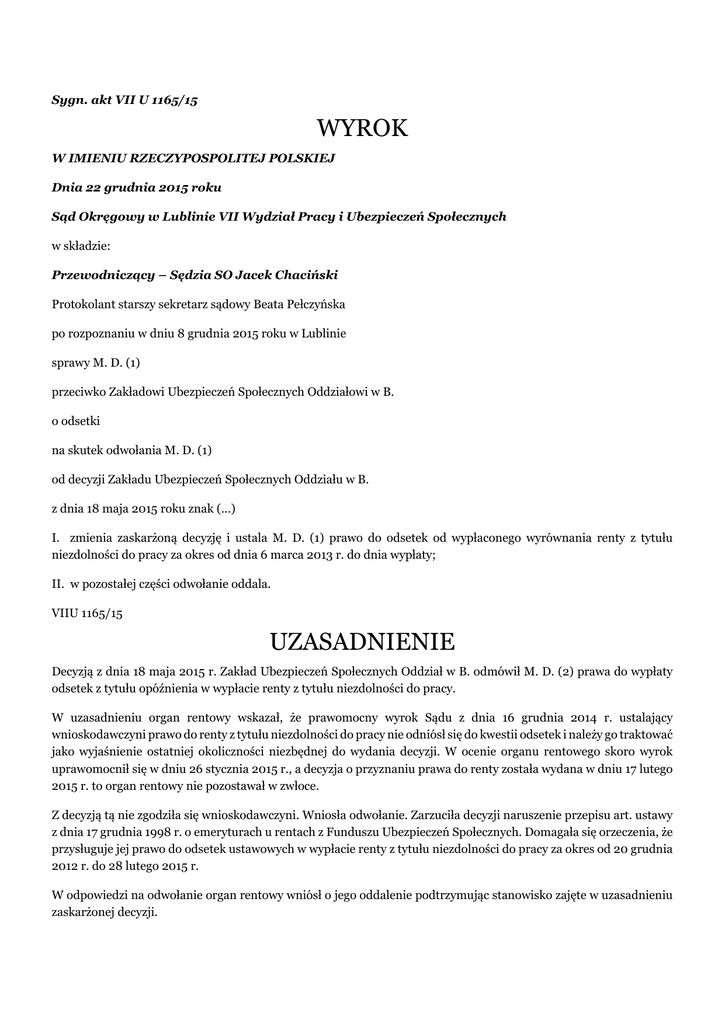 Sygn. akt VII U 1165/15 WYROK W IMIENIU RZECZYPOSPOLITEJ POLSKIEJ Dnia 22 grudnia 2015 roku Sąd Okręgowy w Lublinie VII Wydział Pracy i Ubezpieczeń Społecznych w składzie: Przewodniczący – Sędzia SO Jacek Chaciński Protokolant starszy sekretarz sądowy Beata Pełczyńska po rozpoznaniu w dniu 8 grudnia 2015 roku w Lublinie sprawy M. D. (1) przeciwko Zakładowi Ubezpieczeń Społecznych Oddziałowi w B. o odsetki na skutek odwołania M. D. (1) od decyzji Zakładu Ubezpieczeń Społecznych Oddziału w B. z dnia 18 maja 2015 roku znak (...) I. zmienia zaskarżoną decyzję i ustala M. D. (1) prawo do odsetek od wypłaconego wyrównania renty z tytułu niezdolności do pracy za okres od dnia 6 marca 2013 r. do dnia wypłaty; II. w pozostałej części odwołanie oddala. VIIU 1165/15 UZASADNIENIE Decyzją z dnia 18 maja 2015 r. Zakład Ubezpieczeń Społecznych Oddział w B. odmówił M. D. (2) prawa do wypłaty odsetek z tytułu opóźnienia w wypłacie renty z tytułu niezdolności do pracy. W uzasadnieniu organ rentowy wskazał, że prawomocny wyrok Sądu z dnia 16 grudnia 2014 r. ustalający wnioskodawczyni prawo do renty z tytułu niezdolności do pracy nie odniósł się do kwestii odsetek i należy go traktować jako wyjaśnienie ostatniej okoliczności niezbędnej do wydania decyzji. W ocenie organu rentowego skoro wyrok uprawomocnił się w dniu 26 stycznia 2015 r., a decyzja o przyznaniu prawa do renty została wydana w dniu 17 lutego 2015 r. to organ rentowy nie pozostawał w zwłoce. Z decyzją tą nie zgodziła się wnioskodawczyni. Wniosła odwołanie. Zarzuciła decyzji naruszenie przepisu art. ustawy z dnia 17 grudnia 1998 r. o emeryturach u rentach z Funduszu Ubezpieczeń Społecznych. Domagała się orzeczenia, że przysługuje jej prawo do odsetek ustawowych w wypłacie renty z tytułu niezdolności do pracy za okres od 20 grudnia 2012 r. do 28 lutego 2015 r. W odpowiedzi na odwołanie organ rentowy wniósł o jego oddalenie podtrzymując stanowisko zajęte w uzasadnieniu zaskarżonej decyzji. Sąd Okręgowy ustalił i zważył co następuje M. D. (1) w dniu 20 grudnia 2012 r złożyła wniosek o rentę z tytułu niezdolności do pracy. Wcześniej była uprawniona do renty z tytułu częściowej niezdolności do pracy do 30 czerwca 2011 r. W orzeczeniu z dnia 28 stycznia 2013 r. Lekarz orzecznik uznał, że wnioskodawczyni jest częściowo niezdolna do pracy od 20 grudnia 2012 r. do 31 stycznia 2014 r. ( k.279 a.r). Do powyższego orzeczenia Główny Lekarz Orzecznik zgłosił zarzut wadliwości orzeczenia (k.281 a.r.). Komisja Lekarska ZUS w dniu 22 lutego 2013 r. uznała M. D. (1) za zdolną do pracy. Komisja lekarska ZUS dokonała oceny kardiologicznej i pulmonologicznej, w szczególności ustaliła, że wnioskodawczyni cierpi na astmę oskrzelową, znała jednak, że wnioskodawczyni może być leczona w ramach czasowej niezdolności do pracy. W oparciu o to orzeczenie Zakład Ubezpieczeń Społecznych Oddział w B. wydał w dniu 5 marca 2013 r. decyzję odmawiającą wnioskodawczyni prawa do renty z tytułu niezdolności do pracy. Od decyzji tej wnioskodawczyni wniosła odwołanie rozpoznane w sprawie VII P 1012/13. W toku postępowania sądowego Sąd dopuścił dowód z opinii biegłych lekarzy sądowych: specjalisty chorób wewnętrznych, kardiologa, pulmonologa i specjalisty chorób przewodu pokarmowego. Biegli w opinii z dnia 10 czerwca 2013 r. rozpoznali u wnioskodawczyni stan po operacji ubytku międzykomorowego i międzyprzedsionkowego, częstoskurcze nadkomorowe z okresowym blokiem AV II stopnia, umiarawiane farmakologicznie i kardiowersją, układ krążenia bez objawów niewydolności, chorobę wrzodową dwunastnicy w wywiadzie, podejrzenie choroby refleksowej przełyku i uznali wnioskodawczynie za zdolną do pracy pozostawiając wydanie ostatecznej opinii biegłemu z zakresu pulmonologii (k.14 a.s.). Biegła pulmonolog w opinii z dnia 17 grudnia 2013 r. stwierdziła u wnioskodawczyni astmę oskrzelową łagodną i uznała ją za zdolną do pracy. Wnioskodawczyni nie zgodziła się z opinią. Sąd dopuścił dowód z opinii drugiego zespołu biegłych kardiolog i pulmonologa. Biegli w opinii z dnia 3 czerwca 2014 r. rozpoznali u wnioskodawczyni przebyty zabieg kardiochirurgiczny zamknięcia ubytków w przegrodzie między przedsionkowej i międzykomorowej, arytmię pod postacią przedwczesnych skurczów nadkomorowych, komorowych i napadów częstoskurczu nadkomorowego, astmę oskrzelową, przewlekłą ciężką eozynofilową, polipy zatoki szczękowej i uznali wnioskodawczynię za częściowo niezdolną do pracy od 20 grudnia 2012 r. do 30 grudnia 2015 r. Ocena stanu zdrowia wnioskodawczyni została dokonana w oparciu o dokumentację medyczną, która była przedmiotem oceny Komisji Lekarskiej ZUS. Do opinii tej strony nie zgłosiły zastrzeżeń. Wyrokiem z dnia 16 grudnia 2014 r. Sąd Okręgowy w Lublinie zmienił decyzję organ rentowego i przywrócił M. D. (1) prawo do okresowej renty z tytułu niezdolności do pracy od dnia 20 grudnia 2012 r. do dnia 30 grudnia 2015 r. Powyższy wyrok wpłynął do organ rentowego w dniu 12 stycznia 2015 r. Na podstawie tego wyroku organ rentowy w dniu 17 lutego 2015 r. wydal decyzję przeliczającą od dnia 20 grudnia 2012 r. rentę z tytułu częściowej niezdolności do pracy zaznaczając, że renta przysługuje do dnia 30 grudnia 2015 r. Powyższy stan faktyczny Sąd Okręgowy ustalił na podstawie dokumentów znajdujących się w aktach rentowych ZUS oraz aktach sprawy VII U 1012/12.Wiarygodność tych dokumentów nie budzi żadnych wątpliwości. Odwołanie jest częściowo uzasadnione. Przede wszystkim wskazać należy, że z utrwalonego orzecznictwa Sądu Najwyższego i sądów powszechnych, które Sąd Okręgowy podziela wynika, że niezamieszczenie w treści wyroku orzeczenia stwierdzającego odpowiedzialność organu rentowego za nieustalenie ostatniej okoliczności niezbędnej do wydania decyzji nie