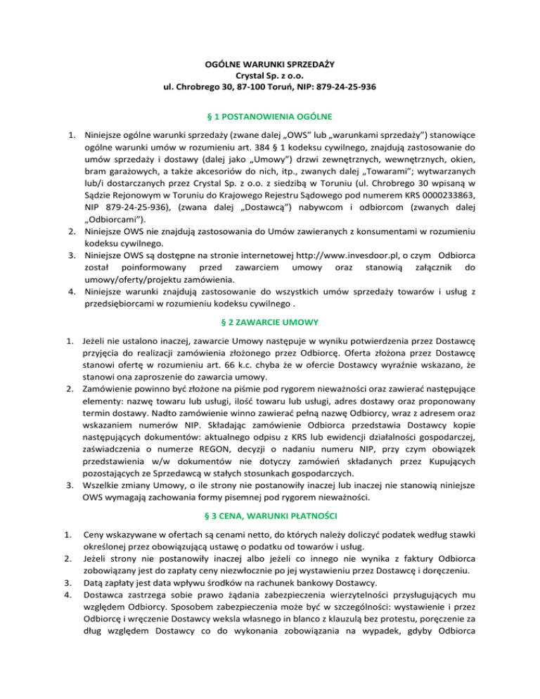 OGÓLNE WARUNKI SPRZEDAŻY Crystal Sp. z o.o. ul. Chrobrego 30, 87-100 Toruń, NIP: 879-24-25-936 § 1 POSTANOWIENIA OGÓLNE 1. Niniejsze ogólne warunki sprzedaży (zwane dalej „OWS” lub „warunkami sprzedaży”) stanowiące ogólne warunki umów w rozumieniu art. 384 § 1 kodeksu cywilnego, znajdują zastosowanie do umów sprzedaży i dostawy (dalej jako „Umowy”) drzwi zewnętrznych, wewnętrznych, okien, bram garażowych, a także akcesoriów do nich, itp., zwanych dalej „Towarami”; wytwarzanych lub/i dostarczanych przez Crystal Sp. z o.o. z siedzibą w Toruniu (ul. Chrobrego 30 wpisaną w Sądzie Rejonowym w Toruniu do Krajowego Rejestru Sądowego pod numerem KRS 0000233863, NIP 879-24-25-936), (zwana dalej „Dostawcą”) nabywcom i odbiorcom (zwanych dalej „Odbiorcami”). 2. Niniejsze OWS nie znajdują zastosowania do Umów zawieranych z konsumentami w rozumieniu kodeksu cywilnego. 3. Niniejsze OWS są dostępne na stronie internetowej http://www.invesdoor.pl, o czym Odbiorca został poinformowany przed zawarciem umowy oraz stanowią załącznik do umowy/oferty/projektu zamówienia. 4. Niniejsze warunki znajdują zastosowanie do wszystkich umów sprzedaży towarów i usług z przedsiębiorcami w rozumieniu kodeksu cywilnego . § 2 ZAWARCIE UMOWY 1. Jeżeli nie ustalono inaczej, zawarcie Umowy następuje w wyniku potwierdzenia przez Dostawcę przyjęcia do realizacji zamówienia złożonego przez Odbiorcę. Oferta złożona przez Dostawcę stanowi ofertę w rozumieniu art. 66 k.c. chyba że w ofercie Dostawcy wyraźnie wskazano, że stanowi ona zaproszenie do zawarcia umowy. 2. Zamówienie powinno być złożone na piśmie pod rygorem nieważności oraz zawierać następujące elementy: nazwę towaru lub usługi, ilość towaru lub usługi, adres dostawy oraz proponowany termin dostawy. Nadto zamówienie winno zawierać pełną nazwę Odbiorcy, wraz z adresem oraz wskazaniem numerów NIP. Składając zamówienie Odbiorca przedstawia Dostawcy kopie następujących dokumentów: aktualnego odpisu z KRS lub ewidencji działalności gospodarczej, zaświadczenia o numerze REGON, decyzji o nadaniu numeru NIP, przy czym obowiązek przedstawienia w/w dokumentów nie dotyczy zamówień składanych przez Kupujących pozostających ze Sprzedawcą w stałych stosunkach gospodarczych. 3. Wszelkie zmiany Umowy, o ile strony nie postanowiły inaczej lub inaczej nie stanowią niniejsze OWS wymagają zachowania formy pisemnej pod rygorem nieważności. § 3 CENA, WARUNKI PŁATNOŚCI 1. 2. 3. 4. Ceny wskazywane w ofertach są cenami netto, do których należy doliczyć podatek według stawki określonej przez obowiązującą ustawę o podatku od towarów i usług. Jeżeli strony nie postanowiły inaczej albo jeżeli co innego nie wynika z faktury Odbiorca zobowiązany jest do zapłaty ceny niezwłocznie po jej wystawieniu przez Dostawcę i doręczeniu. Datą zapłaty jest data wpływu środków na rachunek bankowy Dostawcy. Dostawca zastrzega sobie prawo żądania zabezpieczenia wierzytelności przysługujących mu względem Odbiorcy. Sposobem zabezpieczenia może być w szczególności: wystawienie i przez Odbiorcę i wręczenie Dostawcy weksla własnego in blanco z klauzulą bez protestu, poręczenie za dług względem Dostawcy co do wykonania zobowiązania na wypadek, gdyby Odbiorca zobowiązania nie wykonał, gwarancja bankowa, cesja wierzytelności lub inna wyraźnie zaakceptowana na piśmie (pod rygorem nieważności) forma zabezpieczenia. 5. Dostawca zastrzega możliwość żądania od Odbiorcy zapłaty zaliczki na poczet ceny. 6. Dostawca zastrzega prawo udzielania rabatów, upustów Odbiorcy według własnego uznania. 7. W przypadku wystąpienia zaległości płatniczych na rzecz Dostawcy ma on prawo do egzekwowania należności oraz należności ubocznych (w tym odsetek za zwłokę). 8. Płatności dokonywane przez Odbiorcę Dostawca ma prawo zaliczyć w pierwszej kolejności na poczet wymagalnych zobowiązań Odbiorcy, a jeśli jest kilka wymagalnych zobowiązań Odbiorcy – na poczet najdawniej wymagalnego, zaś w przypadku powstania należności ubocznych (odsetki itp.) – na poczet tych należności. 9. W przypadku przekroczenia przez Odbiorcę terminu płatności jakiejkolwiek faktury, Dostawca ma prawo do wstrzymania dostaw. 10. Jeżeli po sprzedaży Towarów powstaną uzasadnione wątpliwości co do wypłacalności lub zdolności kredytowej Odbiorcy lub gdy ten fakt – mający miejsce w momencie zawarcia umowy – ujawni się dopiero później, Dostawca może powstrzymać się ze spełnieniem następnego świadczenia do czasu uregulowania zaległej należności (wraz z należnościami ubocznymi jak odsetki i koszty) lub żądać odpowiedniego zabezpieczenia zapłaty, wszelkie zaś zobowiązania Odbiorcy stają się natychmiast wymagalne. W razie odmowy lub niespełnienia żądania zapłaty lub udzielenia zabezpieczenia Dostawca może odstąpić od umowy w terminie siedmiu dni roboczych, bez odszkodowania na rzecz Odbiorcy. § 4 KREDYT KUPIECKI 1. Możliwość nabywania przez Odbiorcę Towarów w systemie z odroczonym terminem płatności uzależniona jest od wyłącznej decyzji Dostawcy. 2. Dostawca może ustanowić wysokość limitu tzw. kredytu kupieckiego dla Odbiorcy, zgodnie z obowiązującą wewnętrzną procedurą Dostawcy, lub może uzależnić jego ustalenie od ustanowienia przez Odbiorcę zabezpieczenia zapłaty ceny za Towary, w szczególności w postaci gwarancji bankowej lub ubezpieczeniowej, co najmniej w wysokości zabezpieczającej zapłatę ceny z danej Umowy. 3. Przez kredyt kupiecki, rozumie się odroczenie terminu płatności wierzytelności o okres określony przez Dostawcę, do kwoty limitu tego kredytu, obejmującej wszystkie zobowiązania pieniężne Odbiorcy względem Dostawcy. Dostawca będzie uprawniony do wstrzymania się z wykonaniem swych świadczeń względem Odbiorcy, w szczególności z przyjmowaniem i akceptacją zamówień, z wyt