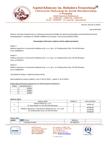 Szpital Kliniczny im. Heliodora Święcickiego Uniwersytetu Medycznego im. Karola Marcinkowskiego w Poznaniu Dział Zamówień Publicznych tel.: +618691651, +618691756, +618691759 tel./fax: +618691847 www.spsk2.pl [email protected] Poznań, dnia 05.12.2016 r. wg rozdzielnika Dotyczy: przetarg nieograniczony na dostawę procesorów dźwięku do aparatu słuchowego na przewodnictwo kostne kompatybilnych z zaczepami ST, BA300 i BA400 firmy Cochlear .Znak sprawy DZP/357/2016 Zamawiający informuje o wyborze oferty najkorzystniejszej Pakiet 1: Medicus Aparatura i Instrumenty Medyczne Sp. z o.o. Sp.k., Ul. Grabiszyńska 251a, 53-234 Wrocław Cena: 44280,00 zł Pakiet 3: Medicus Aparatura i Instrumenty Medyczne Sp. z o.o. Sp.k., Ul. Grabiszyńska 251a, 53-234 Wrocław Cena: 22140,00 zł Pakiet 3: Medicus Aparatura i Instrumenty Medyczne Sp. z o.o. Sp.k., Ul. Grabiszyńska 251a, 53-234 Wrocław Cena: 44280,00 zł Uzasadnienie wyboru: najkorzystniejsza oferta Data podpisania umowy: pakiety 1 oraz 3: 06.12.2016 r., pakiet 2: 16.12.2016 r. Kwota jaką zamierzano przeznaczyć na sfinansowanie zamówienia: Pakiet wartość brutto 1 45360 2 22680 3 45360 Złożone oferty nazwa, adres Oticon Polska Sp. z o.o. Al. Jana Pawła II nr 22, 00-133 Warszawa 1 2 Ocena ofert pakiet Pakiet nr cena zł brutto 2 16501,32 1 2 3 44280,00 22140,00 44280,00 Medicus Aparatura i Instrumenty Medyczne Sp. z o.o. Sp.k. Ul. Grabiszyńska 251a, 53-234 Wrocław 1 Firma: Wartość brutto: 60-355 Poznań ul. Przybyszewskiego 49 NIP:779-20-33-466 REGON: 000288834 KRS: 0000001852 Medicus 44 280,00 zł tel. centrala: +61 869 11 00 tel. sekretariat: +61 869 12 03 fax: +61 867 12 32 email: [email protected] WWW: http://www.spsk2.pl F3 - ADMIN edycja 5 Możliwość komunikacji z dodatkowymi akcesoriami zapewniającymi łączność procesora z telewizorem i telefonem Możliwość komunikacji z dodatkowymi akcesoriami zapewniającymi łączność procesora z telewizorem i telefonem bez konieczności zastosowania dodatkowych elementów na szyi pacjenta takich jak pętla Bezprzewodowa bezpośrednia łączność pomiędzy procesorem a telefonem Możliwość regulacji ustawień procesora (zmiana głośności i programów akustycznych) za pomocą dołączonego pilota (w ramach oferowanej ceny) Pkt. Cena SUMA PUNKTÓW pakiet pakiet 2 3 10,00 10,00 10,00 10,00 60,00 100,00 Firma: Wartość brutto: Możliwość komunikacji z dodatkowymi akcesoriami zapewniającymi łączność procesora z telewizorem i telefonem Możliwość komunikacji z dodatkowymi akcesoriami zapewniającymi łączność procesora z telewizorem i telefonem bez konieczności zastosowania dodatkowych elementów na szyi pacjenta takich jak pętla Bezprzewodowa bezpośrednia łączność pomiędzy procesorem a telefonem Możliwość regulacji ustawień procesora (zmiana głośności i programów akustycznych) za pomocą dołączonego pilota (w ramach oferowanej ceny) Pkt. Cena SUMA PUNKTÓW Oticon 16 501,32 zł Medicus 22 140,00 zł 10,00 10,00 1 10,00 1 10,00 10,00 60,00 82,00 10,00 44,72 84,72 Firma: Wartość brutto: Możliwość komunikacji z dodatkowymi akcesoriami zapewniającymi łączność procesora z telewizorem i telefonem Możliwość komunikacji z dodatkowymi akcesoriami zapewniającymi łączność procesora z telewizorem i telefonem bez konieczności zastosowania dodatkowych elementów na szyi pacjenta takich jak pętla Bezprzewodowa bezpośrednia łączność pomiędzy procesorem a telefonem Możliwość regulacji ustawień procesora (zmiana głośności i programów akustycznych) za pomocą dołączonego pilota (w ramach oferowanej ceny) Pkt. Cena SUMA PUNKTÓW Medicus 44 280,00 zł 10,00 10,00 10,00 10,00 60,00 100,00