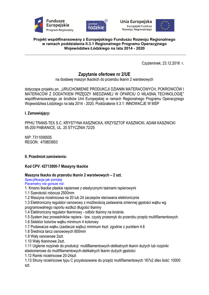 Projekt współfinansowany z Europejskiego Funduszu Rozwoju Regionalnego w ramach poddziałania II.3.1 Regionalnego Programu Operacyjnego Województwa Łódzkiego na lata 2014 - 2020 Czyżeminek; 23.12.2016 r. Zapytanie ofertowe nr 2/UE na dostawę maszyn tkackich do przerobu tkanin 2 warstwowych dotyczące projektu pn. „URUCHOMIENIE PRODUKCJI DZIANIN MATERACOWYCH, POKROWCÓW I MATERACÓW Z DODATKIEM PRZĘDZY MIEDZIANEJ W OPARCIU O WŁASNĄ TECHNOLOGIĘ” współfinansowanego ze środków Unii Europejskiej w ramach Regionalnego Programu Operacyjnego Województwa Łódzkiego na lata 2014 - 2020, Poddziałanie II.3.1: INNOWACJE W MŚP I. Zamawiający: PPHU TRANS-TEX S.C. KRYSTYNA KASZNICKA, KRZYSZTOF KASZNICKI, ADAM KASZNICKI 95-200 PABIANICE, UL. 20 STYCZNIA 72/25 NIP: 7311006505 REGON: 470803953 II. Przedmiot zamówienia: Kod CPV: 42713000-7 Maszyny tkackie Maszyna tkacka do przerobu tkanin 2 warstwowych – 2 szt. Specyfikacja jak poniżej Parametry nie gorsze niż: 1. Krosno tkackie płaskie rapierowe z elastycznymi taśmami rapierowymi 1.1 Szerokość robocza 2500mm 1.2 Maszyna nicielnicowa na 20 lub 24 zaczepów sterowana elektronicznie 1.3 Elektroniczny regulator osnowowy z możliwością zadawania zmiennej gęstości wątku wg programowalnego raportu wzdłuż długości tkaniny 1.4 Elektroniczny regulator tkaninowy - odbiór tkaniny na krośnie. 1.5 System bez prowadników rapiera - tzw. czysty przesmyk do przerobu przędz multifilamentowych. 1.6 Selektor kolorów wątku minimum 4 kolorowy 1.7 Podawacze wątku (zasilacze wątku) minimum 4szt. zgodnie z punktem 4.6 1.8 Średnica tarcz osnowowych 800mm 1.9 Wały osnowowe 2szt. 1.10 Wały tkaninowe 2szt. 1.11 Uiglenie rozpinek do produkcji multifilamentowych-delikatnych tkanin dużych lub rozpinki elastomerowe do multifilamentowych-delikatnych tkanin dużych gęstości 1.12 Ramki nicielnicowe 20-24szt 1.13 Struny nicielnicowe typu C przystosowane do przędz multifilamentowych 167x2 dtex ilość: 10000 szt. 1.14 Czujnik zrywu osnowy - aparat lamelkowy - 6-8 pił lamelowych, ilość lamel: 10000szt. 1.15 Prędkość obrotowa przy przerobie tkanin średnich minimum 400 obr/min Oferent zobowiązany jest do skalkulowania i uwzględnienia w cenie przedmiotu zamówienia wszelkich kosztów dodatkowych, które mogą powstać przy jego realizacji, w tym kosztów transportu do oddziału Zamawiającego (Czyżeminek 43, 95-030 Czyżeminek), instalacji i przeszkolenia personelu w obsłudze maszyn w oddziale Zamawiającego. Zamawiający nie dopuszcza możliwości składania ofert częściowych. Nie jest możliwe składanie ofert wariantowych. III. Warunki udziału w postępowaniu: III.1 O udzielenie zamówienia mogą ubiegać się Oferenci, którzy zaakceptowali bez zastrzeżeń wszystkie postanowienia niniejszego zapytania ofertowego oraz załączony wzór umowy, stanowiący załącznik nr 2 do niniejszego postępowania. III.2 Nie jest dopuszczalne składanie ofert przez podmioty, które powiązane są z Zamawiającym lub osobami upoważnionymi do zaciągania zobowiązań w imieniu Zamawiającego lub osobami wykonującymi w imieniu Zamawiającego czynności związane z przygotowaniem i przeprowadzeniem procedury wyboru Wykonawcy osobowo lub kapitałowo, w szczególności przez: a) uczestnictwo w spółce jako wspólnik spółki cywilnej lub spółki osobowej, b) posiadanie co najmniej 10 % udziałów lub akcji, c) pełnienie funkcji członka organu nadzorczego lub zarządzającego, prokurenta, pełnomocnika, d) pozostawanie w związku małżeńskim, w stosunku pokrewieństwa lub powinowactwa w linii prostej, pokrewieństwa drugiego stopnia lub powinowactwa drugiego stopnia w linii bocznej lub w stosunku przysposobienia, opieki lub kurateli. IV. Opis sposobu dokonywania oceny spełniania warunków udziału w postępowaniu: 1. W celu potwierdzenia spełniania warunków udziału w postępowaniu, do oferty należy dołączyć: Oświadczenie o spełnieniu warunków udziału w postępowaniu, stanowiące załącznik nr 1 do niniejszego zapytania ofertowego oraz zaparafowany wzór umowy, stanowiący załącznik nr 2 do niniejszego postępowania. 2. Ocena spełnienia warunków udziału w postępowaniu zostanie dokonana na podstawie przedstawionego przez Oferenta oświadczenia oraz zaparafowanego wzoru umowy, określonych w punkcie IV.1, zgodnie z formułą SPEŁNIA/ NIE SPEŁNIA. 3. Niespełnienie warunków udziału w postępowaniu wyklucza oferenta z postępowania. V. Kryteria oceny oferty Zamawiający dokona oceny ofert na podstawie następujących kryteriów: V.1 Kryteria formalne, zgodnie z formułą spełnia/nie spełnia - oferta została złożona w terminie określonym w punkcie IX niniejszego zapytania; - oferta została złożona w miejscu określonym w punkcie VIII niniejszego zapytania; - oferta spełnia wszystkie wymogi zawarte w punkcie VII niniejszego zapytania; - przedmiot oferty jest zgodny z punktem II niniejszego zapytania; - termin realizacji zamówienia w ofercie nie przekracza terminu wskazanego w punkcie nr VI niniejszego zapytania. Nie spełnienie któregokolwiek z kryteriów formalnych skutkuje odrzuceniem oferty z przyczyn formalnych. V.2 Kryteria punktowe Oferty, które spełnią kryteria formalne zostaną poddane ocenie według kryteriów punktowych. Cena [waga: 70%] Okres gwarancji [waga: 15%] Czas naprawy maszyny od daty zgłoszenia awarii [waga: 15%] V.3 Opis sposobu przyznawania punktacji za spełnienie danego kryterium oceny oferty Kryterium Cena (w PLN): Maksymalna liczba punktów do uzyskania w tym kryterium wynosi 70 punktów. Cena najniższa / Cena badana x 70% Kryterium Okres gwarancji (w miesiącach): Maksymalna liczba punktów do uzyskania w tym kryterium wynosi 15 punktów. Okres gwarancji badany / Okres gwarancji najdłuższy x 15% Kryterium Czas naprawy maszyny od daty zgłoszenia awarii (w dniach): Maksymalna liczba punktów do uzyskania w tym kryterium wynosi 15 punktów. Czas naprawy najkrótszy / Czas naprawy