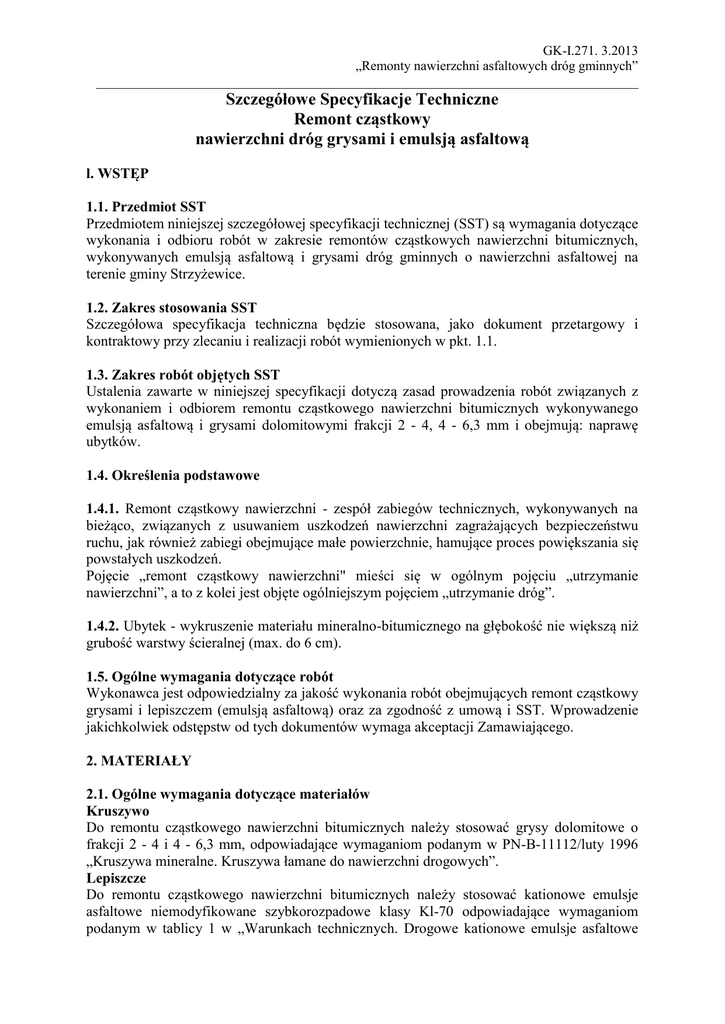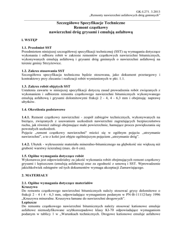 GK-I.271. 3.2013 „Remonty nawierzchni asfaltowych dróg gminnych” _________________________________________________________________________________ Szczegółowe Specyfikacje Techniczne Remont cząstkowy nawierzchni dróg grysami i emulsją asfaltową l. WSTĘP 1.1. Przedmiot SST Przedmiotem niniejszej szczegółowej specyfikacji technicznej (SST) są wymagania dotyczące wykonania i odbioru robót w zakresie remontów cząstkowych nawierzchni bitumicznych, wykonywanych emulsją asfaltową i grysami dróg gminnych o nawierzchni asfaltowej na terenie gminy Strzyżewice. 1.2. Zakres stosowania SST Szczegółowa specyfikacja techniczna będzie stosowana, jako dokument przetargowy i kontraktowy przy zlecaniu i realizacji robót wymienionych w pkt. 1.1. 1.3. Zakres robót objętych SST Ustalenia zawarte w niniejszej specyfikacji dotyczą zasad prowadzenia robót związanych z wykonaniem i odbiorem remontu cząstkowego nawierzchni bitumicznych wykonywanego emulsją asfaltową i grysami dolomitowymi frakcji 2 - 4, 4 - 6,3 mm i obejmują: naprawę ubytków. 1.4. Określenia podstawowe 1.4.1. Remont cząstkowy nawierzchni - zespół zabiegów technicznych, wykonywanych na bieżąco, związanych z usuwaniem uszkodzeń nawierzchni zagrażających bezpieczeństwu ruchu, jak również zabiegi obejmujące małe powierzchnie, hamujące proces powiększania się powstałych uszkodzeń. Pojęcie „remont cząstkowy nawierzchni" mieści się w ogólnym pojęciu „utrzymanie nawierzchni”, a to z kolei jest objęte ogólniejszym pojęciem „utrzymanie dróg”. 1.4.2. Ubytek - wykruszenie materiału mineralno-bitumicznego na głębokość nie większą niż grubość warstwy ścieralnej (max. do 6 cm). 1.5. Ogólne wymagania dotyczące robót Wykonawca jest odpowiedzialny za jakość wykonania robót obejmujących remont cząstkowy grysami i lepiszczem (emulsją asfaltową) oraz za zgodność z umową i SST. Wprowadzenie jakichkolwiek odstępstw od tych dokumentów wymaga akceptacji Zamawiającego. 2. MATERIAŁY 2.1. Ogólne wymagania dotyczące materiałów Kruszywo Do remontu cząstkowego nawierzchni bitumicznych należy stosować grysy dolomitowe o frakcji 2 - 4 i 4 - 6,3 mm, odpowiadające wymaganiom podanym w PN-B-11112/luty 1996 „Kruszywa mineralne. Kruszywa łamane do nawierzchni drogowych”. Lepiszcze Do remontu cząstkowego nawierzchni bitumicznych należy stosować kationowe emulsje asfaltowe niemodyfikowane szybkorozpadowe klasy Kl-70 odpowiadające wymaganiom podanym w tablicy 1 w „Warunkach technicznych. Drogowe kationowe emulsje asfaltowe GK-I.271. 3.2013 „Remonty nawierzchni asfaltowych dróg gminnych” _________________________________________________________________________________ EmA-99. Informacje, instrukcje. Zeszyt 60. IBDiM, Warszawa, 1999”. Można stosować tylko emulsje asfaltowe posiadające aprobatę techniczną, wydaną przez uprawnioną jednostkę. Tablica 1. Właściwości drogowych emulsji kationowych niemodyfikowanych Oznaczenia Badanie właściwości Zawartość lepiszcza, % Lepkość wg Englera, 0E Lepkość BTA Æ 4 mm, Jednorodność, % # 0,63 mm Jednorodność, % # 0,16 mm Sedymentacja, % Przyczepność do kruszywa, % Indeks rozpadu, g/100g* Klasa emulsji Szybko rozpadowe K1- 70 68-72 s>9 < 0,10 < 0,25 < 5,0 > 85 < 90 3. SPRZĘT Wykonawca powinien dysponować następującym sprzętem: - remonter ciśnieniowy - wprowadzający pod ciśnieniem kruszywo jednocześnie z emulsją asfaltową bezpośrednio do uszkodzenia; remonter ten umożliwia oczyszczenie naprawianego miejsca sprężonym powietrzem, - sprzęt podręczny do oczyszczenia miejsca remontowanego z luźnych ziaren uszkodzonej nawierzchni np. ulicówki, łopaty. Zamawiający dopuszcza wykonywanie remontów przy użyciu rozsypywarki kruszywa i skrapiarki. 4. TRANSPORT - Kruszywo można przewozić dowolnymi środkami transportu, w warunkach zabezpieczających je przed zanieczyszczeniem, zmieszaniem z innymi materiałami i nadmiernym zawilgoceniem. - Emulsję należy przewozić cysternami lub autocysternami. Wyjątkowo, lecz za zgodą Zamawiającego, dopuszcza się transport emulsji w beczkach i innych opakowaniach pod warunkiem, że nie będą korodowały pod wpływem emulsji i nie będą powodowały jej rozpadu. 5. WYKONANIE ROBÓT 5.1. Ogólne zasady wykonania robót Wykonawca na czas trwania robót ma obowiązek oznakowania miejsca robót zgodnie z otrzymanym od Zamawiającego projektem tymczasowej organizacji ruchu i zabezpieczenia robót. Koszty związane z oznakowaniem wykonawca uwzględni w cenie oferty. Przygotowanie uszkodzonego miejsca (ubytku) do naprawy należy wykonać bardzo starannie przez: - usunięcie luźnych okruchów nawierzchni, - usunięcie wody, - doprowadzenie uszkodzonego miejsca do stanu powietrzno – suchego, - dokładne oczyszczenie dna i krawędzi uszkodzonego miejsca z luźnych ziaren grysu, żwiru, piasku i pyłu. GK-I.271. 3.2013 „Remonty nawierzchni asfaltowych dróg gminnych” _________________________________________________________________________________ Do naprawy powierzchni uszkodzonych należy zastosować remontery natryskujące pod ciśnieniem jednocześnie kruszywo z kationową emulsją asfaltową. Remontery te umożliwiają oczyszczenie naprawianego miejsca sprężonym powietrzem, a następnie poprzez te same dysze natryskiwana jest warstewka emulsji asfaltowej. Następnie przy użyciu tych samych dysz natryskuje się pod ciśnieniem naprawiane miejsce kruszywem otoczonym (w dyszach) emulsją. W zależności od tekstury naprawianej nawierzchni należy zastosować odpowiednie uziarnienie grysu (od 2 - 4 mm lub od 4 - 6,3 mm). W końcowej fazie stosuje się natrysk naprawianego miejsca kruszywem frakcji 2 - 4 mm. 6. KONTROLA JAKOŚCI ROBÓT 6.1. Badania przed przystąpieniem do robót Wykonawca powinien przedłożyć dokumenty stwierdzające dopuszczenie do stosowania w budownictwie dla emulsji asfaltowej i grysów dolomitowych. 6.2. Badania w czasie rob