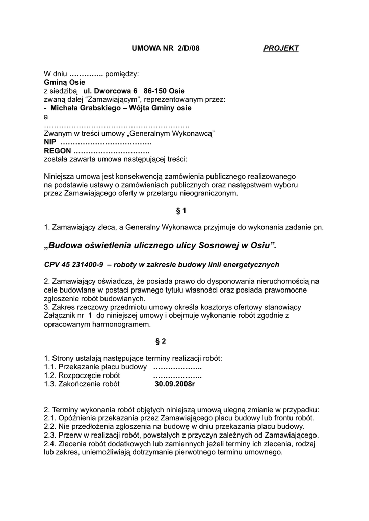 UMOWA NR 2/D/08 PROJEKT W dniu ………….. pomiędzy: Gminą Osie z siedzibą ul. Dworcowa 6 86-150 Osie zwaną dalej “Zamawiającym”, reprezentowanym przez: - Michała Grabskiego – Wójta Gminy osie a ………………………………………………….. Zwanym w treści umowy „Generalnym Wykonawcą” NIP ………………………………. REGON …………………………. została zawarta umowa następującej treści: Niniejsza umowa jest konsekwencją zamówienia publicznego realizowanego na podstawie ustawy o zamówieniach publicznych oraz następstwem wyboru przez Zamawiającego oferty w przetargu nieograniczonym. §1 1. Zamawiający zleca, a Generalny Wykonawca przyjmuje do wykonania zadanie pn. „Budowa oświetlenia ulicznego ulicy Sosnowej w Osiu”. CPV 45 231400-9 – roboty w zakresie budowy linii energetycznych 2. Zamawiający oświadcza, że posiada prawo do dysponowania nieruchomością na cele budowlane w postaci prawnego tytułu własności oraz posiada prawomocne zgłoszenie robót budowlanych. 3. Zakres rzeczowy przedmiotu umowy określa kosztorys ofertowy stanowiący Załącznik nr 1 do niniejszej umowy i obejmuje wykonanie robót zgodnie z opracowanym harmonogramem. §2 1. Strony ustalają następujące terminy realizacji robót: 1.1. Przekazanie placu budowy ……………….. 1.2. Rozpoczęcie robót ……………….. 1.3. Zakończenie robót 30.09.2008r 2. Terminy wykonania robót objętych niniejszą umową ulegną zmianie w przypadku: 2.1. Opóźnienia przekazania przez Zamawiającego placu budowy lub frontu robót. 2.2. Nie przedłożenia zgłoszenia na budowę w dniu przekazania placu budowy. 2.3. Przerw w realizacji robót, powstałych z przyczyn zależnych od Zamawiającego. 2.4. Zlecenia robót dodatkowych lub zamiennych jeżeli terminy ich zlecenia, rodzaj lub zakres, uniemożliwiają dotrzymanie pierwotnego terminu umownego. §3 1. Zamawiający przekaże protokolarnie Generalnemu Wykonawcy teren budowy w terminie do …………………... 2. W dniu przekazania terenu budowy Zamawiający przekaże Generalnemu Wykonawcy plan uzbrojenia podziemnego. Generalny Wykonawca nie będzie ponosił odpowiedzialności za uszkodzenia w sieciach powstałe wskutek realizacji niniejszej umowy, które nie były ujęte na planie istniejących instalacji i sieci. §4 Generalny Wykonawca zobowiązuje się wykonać przedmiot umowy zgodnie z kosztorysem ofertowym i Specyfikacją Istotnych Warunków Zamówienia.. §5 1. Zamawiający powołuje inspektora nadzoru w osobie: ……………………………………………………… Inspektor nadzoru działa w granicach umocowania określonego przepisami ustawy z dnia 7 lipca 1994 r. Prawo budowlane (Dz. U. Nr 89, poz. 414 wraz z późn. zm.). 3. Generalny Wykonawca ustanawia kierownika budowy w osobie: ………………………………………………………… §6 1. Zamawiający wskaże Generalnemu Wykonawcy granice terenu budowy. 2. Zamawiający zapewnia odpłatnie: 2.1. źródło poboru energii elektrycznej i wody. 2.2. obsługę geodezyjną w zakresie wytyczenia głównych osi oraz podania repera §7 1. W czasie realizacji robót Generalny Wykonawca będzie utrzymywał teren budowy w stanie wolnym od przeszkód komunikacyjnych oraz będzie usuwał i składował wszelkie urządzenia pomocnicze i zbędne materiały, odpady i śmieci oraz niepotrzebne urządzenia prowizoryczne. 2. Generalny Wykonawca zapewni właściwą organizację i koordynację robót poprzez zabezpieczenie nadzoru wykonawczego. 3. Generalny Wykonawca ponosi pełną odpowiedzialność za jakość, terminowość oraz bezpieczeństwo robót wykonywanych przez podwykonawców. 4. Generalny Wykonawca będzie prawidłowo prowadził dokumentację budowy. 5. Generalny Wykonawca zobowiązuje się do umożliwienia wstępu na teren budowy pracownikom organów państwowego nadzoru budowlanego, do których należy wykonywanie zadań określonych ustawą - Prawo budowlane oraz do udostępnienia im danych i informacji wymaganych tą ustawą. 6, Wykonawca zapewni na własny koszt pełną obsługę geodezyjną w zakresie wytyczenia pomiarów i wykonania geodezyjnej dokumentacji powykonawczej. 7. Po zakończeniu robót Generalny Wykonawca zobowiązany jest uporządkować teren budowy i przekazać go Zamawiającemu w terminie 7 dni po podpisaniu protokołu odbioru końcowego. 8. Generalny Wykonawca zapewnia ogólny dozór terenu budowy. §8 Generalny Wykonawca zobowiązuje się do ubezpieczenia budowy i robót z tytułu szkód, które mogą zaistnieć w okresie od rozpoczęcia robót do przekazania przedmiotu umowy Zamawiającemu, w związku z określonymi zdarzeniami losowymi – od ryzyk budowlanych oraz od odpowiedzialności cywilnej. Generalny Wykonawca obowiązany jest okazać Zamawiającemu na jego żądanie właściwe polisy. W przypadku niedopełnienia przez Wykonawcę obowiązku ubezpieczenia, Zamawiający dokona ubezpieczenia budowy na koszt Generalnego Wykonawcy. §9 1. Generalny Wykonawca zobowiązuje się wykonać przedmiot umowy z materiałów własnych. Generalny Wykonawca będzie uzgadniać z Zamawiającym wybór materiałów dla robót wykończeniowych. Odstępstwa od przyjętego w ofercie standardu na materiały wykończeniowe lub wyposażenie nie powodują zmiany wynagrodzenia, jeżeli ustalone na życzenie Zamawiającego odmienne rozwiązania w stosunku do przyjętego w ofercie, nie przekraczają cen jednostkowych ustalonych w ofercie. 2. Materiały, o których mowa w ust. 1 powinny odpowiadać co do jakości wymogom wyrobów dopuszczonych do obrotu i stosowania w budownictwie określonym w art. 10 ustawy - Prawo budowlane wymaganiom specyfikacji istotnych warunków zamówienia oraz projektu. 3. Na materiały Generalny Wykonawca obowiązany jest posiadać certyfikat na znak bezpieczeństwa, deklarację zgodności lub certyfikat zgodności z Polską Normą lub aprobatą techniczną. 4. Generalny Wykonawca obowiązany