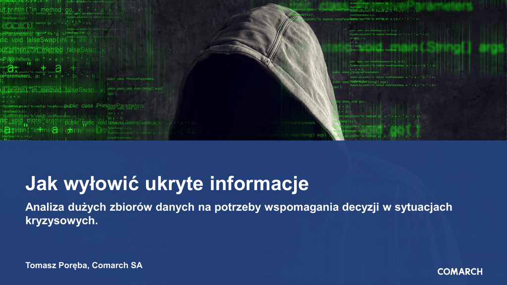 Jak wyłowić ukryte informacje Analiza dużych zbiorów danych na potrzeby wspomagania decyzji w sytuacjach kryzysowych. Tomasz Poręba, Comarch SA PODEJMOWANE DZIAŁANIA NA ŚWIECIE DOTYCHCZASOWE DOŚWIADCZENIA Media społecznościowe Brak reakcji Wpisy dotyczące wyjścia na „wieczorny spacer” Brak informacji o zagrożeniu Ataki na kobiety w Niemczech Ukryta informacja Brak istotnych słów kluczowych ANALIZA DANYCH Z CYBERPRZESTRZENI Cyberprzestrzeń źródłem informacji o zagrożeniach fizycznych Prewencja zagrożeń fizycznych Większa wiedza o zagrożeniach Wczesne ostrzeganie ANALIZA DANYCH - WYZWANIA Ogromna ilość informacji Wiele formatów danych Internet Dane tekstowe Wewnętrzne zbiory danych Audio Dane telekomunikacyjne Wideo Dane operacyjne DANE NIEUSTRUKTURYZOWANE ŹRÓDŁA INFORMACJI 1 Media społecznościowe Twitter, Facebook, inne 2 Portale internetowe Treść, komentarze 3 Fora internetowe Wpisy 4 Wewnętrzne zbiory danych Bazy danych, repozytoria, dane telekomunikacyjne KLUCZ DO SUKCESU Analiza koncepcyjna Geolokalizacja • Koncepty tworzone na podstawie treści • Na podstawie treści oraz metadanych • Wyszukiwanie niezależne od słów kluczowych • Znane miejsca • Potoczne nazwy • Wyznaczanie trendów zachowań • Wyszukiwanie informacji ukrytych Korelacja informacji Obsługa wielu języków • Wiele źródeł danych • Gromadzenie oraz analiza • Powiązanie koncepcyjne • Mechanizmy VoiceToText • Dane historyczne KLUCZ DO SUKCESU Indeksowanie danych • Praca na danych zaindeksowanych • Możliwość obsługi bardzo dużych ilości danych Gotowe konektory do źródeł danych • Konfigurowalne konektory • Szybkie podłączanie nowych źródeł danych • Obsługa źródeł zamkniętych Analiza danych nieustrukturyzowanych Obsługa wielu formatów danych • Brak konieczności opisywania i formatowania danych wejściowych • Tekst • Audio • Wideo WSPÓLNA PLATFORMA ZARZĄDZANIA BEZPIECZEŃSTWEM 1 Centralna platforma zarządzania bezpieczeństwem fizycznym Główny ośrodek decyzyjny 2 Zarządzanie sytuacją kryzysową Moduł mapowy, wizualizacja zagrożeń 3 Wykorzystanie danych z cyberprzestrzeni Media społecznościowe, fora, portale 4 Dwukierunkowa wymiana danych Weryfikacja potencjalnych zagrożeń, informacja zwrotna o zdarzeniach COMARCH SECURITY PLATFORM Wirtualne strefy / linie • Wykrywanie ruchu w zdefiniowanych obszarach • Filtrowanie oznaczonych osób (kamizelki) Zgromadzenia Cechy charakterystyczne • Kolor • Prędkość i kierunek poruszania • Zliczanie osób • Zdefiniowany limit osób Pozostawiony obiekt Mapy ciepła ANALIZA POST FACTUM 1 Szybka analiza nagrań z monitoringu Skrót na podstawie zdefiniowanych zdarzeń 2 Dodatkowe filtry Kolor, wielkość obiektu 3 Analiza z wielu strumieni Jeden materiał do analizy z wielu kamer PRZYPADEK UŻYCIA Wykorzystanie synergii w centrum zarządzania Informacja o organizacji nielegalnej manifestacji Wyznaczenie geolokalizacji Przekazanie informacji do centrum zarządzania Zwiększona obserwacja terenu, dodatkowe służby ochrony DZIĘKUJĘ ZA UWAGĘ [email protected] facebook.com/comarchpl twitter.com/comarchgroup youtube.com/comarchTV