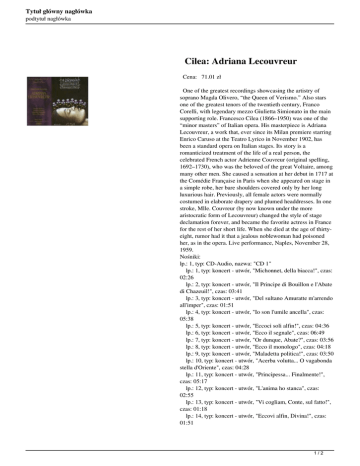 Tytuł główny nagłówka podtytuł nagłówka Cilea: Adriana Lecouvreur Cena: 71.01 zł One of the greatest recordings showcasing the artistry of soprano Magda Olivero, “the Queen of Verismo.” Also stars one of the greatest tenors of the twentieth century, Franco Corelli, with legendary mezzo Giulietta Simionato in the main supporting role. Francesco Cilea (1866–1950) was one of the “minor masters” of Italian opera. His masterpiece is Adriana Lecouvreur, a work that, ever since its Milan premiere starring Enrico Caruso at the Teatro Lyrico in November 1902, has been a standard opera on Italian stages. Its story is a romanticized treatment of the life of a real person, the celebrated French actor Adrienne Couvreur (original spelling, 1692–1730), who was the beloved of the great Voltaire, among many other men. She caused a sensation at her debut in 1717 at the Comédie Française in Paris when she appeared on stage in a simple robe, her bare shoulders covered only by her long luxurious hair. Previously, all female actors were normally costumed in elaborate drapery and plumed headdresses. In one stroke, Mlle. Couvreur (by now known under the more aristocratic form of Lecouvreur) changed the style of stage declamation forever, and became the favorite actress in France for the rest of her short life. When she died at the age of thirtyeight, rumor had it that a jealous noblewoman had poisoned her, as in the opera. Live performance, Naples, November 28, 1959. Nośniki: lp.: 1, typ: CD-Audio, nazwa: "CD 1" lp.: 1, typ: koncert - utwór, "Michonnet, della biacca!", czas: 02:26 lp.: 2, typ: koncert - utwór, "Il Principe di Bouillon e l'Abate di Chazeuil!", czas: 03:41 lp.: 3, typ: koncert - utwór, "Del sultano Amuratte m'arrendo all'imper", czas: 01:51 lp.: 4, typ: koncert - utwór, "Io son l'umile ancella", czas: 05:38 lp.: 5, typ: koncert - utwór, "Eccoci soli alfin!", czas: 04:36 lp.: 6, typ: koncert - utwór, "Ecco il segnale", czas: 06:49 lp.: 7, typ: koncert - utwór, "Or dunque, Abate?", czas: 03:56 lp.: 8, typ: koncert - utwór, "Ecco il monologo", czas: 04:18 lp.: 9, typ: koncert - utwór, "Maladetta politica!", czas: 03:50 lp.: 10, typ: koncert - utwór, "Acerba volutta... O vagabonda stella d'Oriente", czas: 04:28 lp.: 11, typ: koncert - utwór, "Principessa... Finalmente!", czas: 05:17 lp.: 12, typ: koncert - utwór, "L'anima ho stanca", czas: 02:55 lp.: 13, typ: koncert - utwór, "Vi cogliam, Conte, sul fatto!", czas: 01:18 lp.: 14, typ: koncert - utwór, "Eccovi alfin, Divina!", czas: 01:51 1/2 Tytuł główny nagłówka podtytuł nagłówka lp.: 15, typ: koncert - utwór, "Ma dunque, e vero?", czas: 07:01 lp.: 16, typ: koncert - utwór, "Ebbene?... Che granchio!", czas: 05:09 lp.: 17, typ: koncert - utwór, "E sia! Non risponde", czas: 06:13 lp.: 2, typ: CD-Audio, nazwa: "CD 2" lp.: 1, typ: koncert - utwór, "Eh, via! Cosi non va", czas: 06:24 lp.: 2, typ: koncert - utwór, "Io son confusa", czas: 04:06 lp.: 3, typ: koncert - utwór, "Non fatevi pregar", czas: 02:09 lp.: 4, typ: koncert - utwór, "Dopo Marte, Tersicore", czas: 07:42 lp.: 5, typ: koncert - utwór, "E quella donna al certo!", czas: 02:37 lp.: 6, typ: koncert - utwór, ""Giusto Cielo! Che feci in tal giorno?"", czas: 03:57 lp.: 7, typ: koncert - utwór, "So ch'ella dorme", czas: 06:04 lp.: 8, typ: koncert - utwór, "Amico mio!... Figliuloa!", czas: 04:57 lp.: 9, typ: koncert - utwór, "Lieta sorpresa!", czas: 03:07 lp.: 10, typ: koncert - utwór, "Un cofanetto? Scusate", czas: 02:29 lp.: 11, typ: koncert - utwór, "E sia!... Poveri fiori", czas: 04:30 lp.: 12, typ: koncert - utwór, "Adriana!... Non odi?", czas: 03:09 lp.: 13, typ: koncert - utwór, "No, la mia fronte", czas: 04:44 lp.: 14, typ: koncert - utwór, "Che? Tu tremi... trascolori", czas: 02:44 lp.: 15, typ: koncert - utwór, "Dio! Venite!", czas: 03:15 lp.: 16, typ: koncert - utwór, "Scostatevi, profani!", czas: 03:12 Szczegóły nośnik główny nośnik ilość wykonawca nagranie rodzaj CD-Audio 2 Magda Olivero, Franco Corelli, Giulietta Simionato, Ettore Bastianini, Teatro San Carlo Orchestra & Chorus koncert 2/2 Powered by TCPDF (www.tcpdf.org)