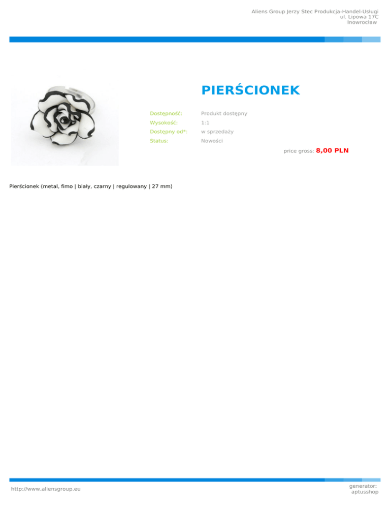Aliens Group Jerzy Stec Produkcja-Handel-Usługi ul. Lipowa 17C Inowrocław PIERŚCIONEK Dostępność: Produkt dostępny Wysokość: 1:1 Dostępny od*: w sprzedaży Status: Nowości price gross: 8,00 PLN Pierścionek (metal, fimo | biały, czarny | regulowany | 27 mm) http://www.aliensgroup.eu generator: aptusshop