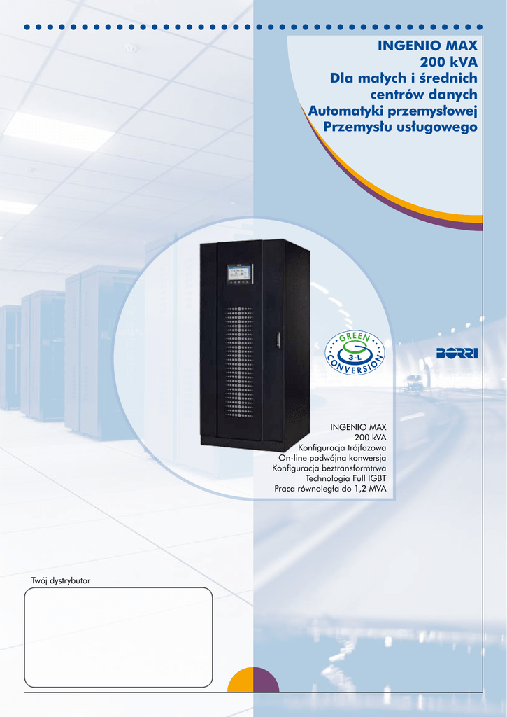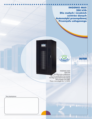 INGENIO MAX 200 kVA Dla małych i średnich centrów danych Automatyki przemysłowej Przemysłu usługowego INGENIO MAX 200 kVA Konfiguracja trójfazowa On-line podwójna konwersja Konfiguracja beztransformtrwa Technologia Full IGBT Praca równoległa do 1,2 MVA Twój dystrybutor INGENIO MAX 200 kVA Właściwości Opcje ● Trójpoziomowa technologia Green ● Transformator/autotransformator Conversion, sprawność energetyczna do dostosowujący napięcie. 97%, niskie zniekształcenia harmoniczne ● Temperaturowa kompensacja napięcia oraz najniższy współczynnik TCO baterii. w swojej kategorii. ● Zewnętrzny bypass serwisowy w szafce ● Tryb Ultra High Efficiency największa innowacja chroniąca aplikacje o wysokiej naściennej. odporności, zapewniająca sprawność energetyczną do 99% i najniższe koszty operacyjne. ● Rozłącznik ● Zestaw pracy równoległej dla współdzielenia obciążenia i wyłączania niewymaganych modułów w zależności od obciążenia. ● Konstrukcja beztransformatorowa dla kompaktowych, lekkich i trwałych systemów. ● Technologia baterii w szafce naściennej. ● Szafki baterii dla dłuższych czasów autonomii. ● Pełna moc znamionowa czynna (PF=1), zapewniająca optymalny dobor UPS i jego wykorzystanie. Full IGBT i elektroniczny układ PFC zapewniający współczynnik mocy wejściowej równy 0,99 oraz zniekształcenia prądu wejściowego THDi<3% dla pełnej kompatybilności ze źródłami zasilającymi. ● Zestaw do synchronizacji jednostek pojedynczych oraz dwóch systemów równoległych. ● Wspólna ● Cewka ● Inne bateria. wyzwalająca rozłącznik bypassu. opcje na żądanie. ● Tryb dynamicznego ładowania (Dynamic Charging Mode) zapewniający uniwersalność w aplikacjach o długich czasach autonomii oraz szybki czas ładowania baterii. ● System Green Conversion Battery Care (GCBC) dla wydłużenia czasu eksploatacji baterii. ● Kompleksowy zestaw opcji komunika cyjnych dla całkowitego, zdalnego monitorowania pracy urządzenia. ● Pełna zgodność z międzynarodowymi standardami dla produktów gwarantująca najwyższą jakość. Wydłużenie czasu eksplotacji baterii przy zastosowaniu Green Conversion Battery Care i konwencjonalnego ładowania konserwacyjnego Pojemność baterii % Dla małych i średnich centrów danych Automatyki przemysłowej Przemysłu usługowego 100% 95% 90% 85% 80% Koniec żywotności baterii* 10% 20% 30% GCBC *zgodnie z IEC/EN 60896-21 40% 50% 60% ładowanie konserwacyjne 70% 80% 90% 100% Żywotność baterii % Dane techniczne INGENIO MAX Jednostka (kVA) 200 Moc nominalna (kW) 200 Wymiary UPS Sz x G x W (mm) Waga UPS (kg) Konfiguracja baterii Wejście 850x900x1975 720 Zewnętrzne, 360÷372 cel, VRLA (inne na żądanie) Podłączenie przewodów Napięcie nominalne Stałe, 4 przewody dla prostownika i bypassu 400 Vac 3 fazy + neutralny (prostownik) 380/400/415 Vac 3 fazy + neutralny (bypass) Tolerancja napięcia -20%, +15% (prostownik) ±10% (bypass) Częstotliwość i zakres 50/60 Hz, 45÷65 Hz Współczynnik mocy >0,99 Zniekształcenia THDi <3% Wyjście Podłączenie przewodów Stałe, 4 przewody Napięcie nominalne 380/400/415 Vac 3 fazy + neutralny Częstotliwość 50/60 Hz Regulacja napięcia statyczna: 1%; dynamiczna: klasa 1 zgodnie z IEC 62040-3 Współczynnik mocy Przeciążenie Sprawność (AC/AC)* do 1, bez zmniejszania parametrów Falownik: 101÷125% przez 10 min, 126÷150% przez 30 s, >150% przez 0.1 s; Bypass: 150% ciągle, 1000% przez 1 cykl do 99% Klasyfikacja wg VFI-SS-111 IEC/EN 62040-3 Komunikacja oraz opcje funkcjonalne Panel sterowania Dotykowy, kolorowy wyświetlacz o przekątnej 10”, 1024x600 pixeli Komunikacja zdalna Standard: Port RS232 i USB, styk monitorujący zabezpieczenie backfeed, terminal komunikacyjny (zdalny wyłącznik awaryjny, stan wyłącznika baterii, stanu zewnętrznego bypassu, praca agregatu, zewnętrzny wyłączik wyjściowy, zdalny transfer na bypass) Opcje: adapter SNMP (Ethernet), serwer web (Ethernet), ModBus-TCP/IP (Ethernet), konwerter ModBus-RTU do Profibus DP, karta syków bezpotencjałowych, zdalny panel monitorowania, oprogramowanie do zarządzania i zamykania systemów Opcjonalne funkcje rozszerzające Transformator izolacyjny, transformator / autotransformator dostosowujący napięcie, zewnętrzny bypass serwisowy; szafy baterii, szafki wyłącznika baterii, sensor temperatury baterii, zestaw pracy równoległej, układ synchronizacji jednostek pojedynczych oraz systemów równoległych; inne opcje na żądanie System Stopień ochrony IP20 Kolor RAL 9005 Instalacja Możliwość rozmieszczenia szaf obok siebie i przy ścianie Dostęp Dostęp z przodu, podejście kablowe od dołu *zgodnie z IEC/EN 62040-3 Inne właściwości Środowisko Zakres temperatury pracy 0°C ÷ +40°C Zakres temperatury składowania -10°C ÷ +70°C Wysokość instalacji (m n.p.m.) < 1000 m bez redukcji mocy wyjściowej, > 1000 m z redukcją mocy wyjściowej o 0,5% na każde 100 m Hałas z odległości 1 m (dBA) <60 Standardy i certyfiaty Zarządzanie jakością, środowiskiem, ISO 9001:2008, ISO 14001:2004, BS OHSAS 18001:2007 zdrowiem i bezpieczeństwem Bezpieczeństwo IEC/EN 62040-1 EMC IEC/EN 62040-2 Aspekty środowiskowe IEC/EN 62040-4 Testy i właściwości IEC/EN 62040-3 Stopień ochrony IEC 60529 OznaczenieCE Opcje INGENIO MAX 200 kVA Opis Kiedy używać Zestaw pracy równoległej Kiedy jednostki pracują równolegle i współdzielą obciążenie Układ synchronizacji pojedynczych jednostek Kiedy wymagana jest synchronizacja wyjść pojedynczych jednostek dla bezprzerwowego przełączania przełączników statycznych Układ synchronizacji dwóch systemów równoległych UPS Kiedy wymagana jest synchronizacja wyjść dwóch systemów składających się z zasilaczy UPS pracujących równolegle dla bezprzerwowego przełączania przełączników statycznych Cewka wyzwalająca rozłącznik bypassu W celu pełnej ochrony przed energią zwrotną w przypadku awarii prz
