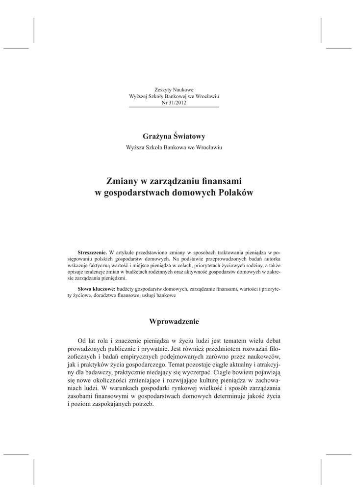 13 Zeszyty Naukowe Wyższej Szkoły Bankowej we Wrocławiu Nr 31/2012 Grażyna Światowy Wyższa Szkoła Bankowa we Wrocławiu Zmiany w zarządzaniu finansami w gospodarstwach domowych Polaków Streszczenie. W artykule przedstawiono zmiany w sposobach traktowania pieniądza w postępowaniu polskich gospodarstw domowych. Na podstawie przeprowadzonych badań autorka wskazuje faktyczną wartość i miejsce pieniądza w celach, priorytetach życiowych rodziny, a także opisuje tendencje zmian w budżetach rodzinnych oraz aktywność gospodarstw domowych w zakresie zarządzania pieniędzmi. Słowa kluczowe: budżety gospodarstw domowych, zarządzanie finansami, wartości i priorytety życiowe, doradztwo finansowe, usługi bankowe Wprowadzenie Od lat rola i znaczenie pieniądza w życiu ludzi jest tematem wielu debat prowadzonych publicznie i prywatnie. Jest również przedmiotem rozważań filozoficznych i badań empirycznych podejmowanych zarówno przez naukowców, jak i praktyków życia gospodarczego. Temat pozostaje ciągle aktualny i atrakcyjny dla badawczy, praktycznie niedający się wyczerpać. Ciągle bowiem pojawiają się nowe okoliczności zmieniające i rozwijające kulturę pieniądza w zachowaniach ludzi. W warunkach gospodarki rynkowej wielkość i sposób zarządzania zasobami finansowymi w gospodarstwach domowych determinuje jakość życia i poziom zaspokajanych potrzeb. 14 Grażyna Światowy 1. Pieniądz jako szczególna wartość w priorytetach życiowych Polaków Obecne nastawienie Polaków do pieniądza kształtowało się w dużej mierze w procesie restrukturalizacji naszej gospodarki. W ciągu ostatniego dwudziestolecia nastąpiły radykalne zmiany. Wcześniej w warunkach planowej gospodarki, powszechnej reglamentacji i niedoborów oraz ograniczonej wymienialności naszej waluty polski złoty raczej nie mieścił się w priorytetach ogólnie uznawanych wartości. Szacunek dla polskiego złotego wzrastał sukcesywnie wraz z poprawą zaopatrzenia rynku i wskutek restrykcyjnej polityki finansowej rządu RP, zwłaszcza wprowadzenia denominacji i wymienialności złotego. Poznanie istoty tych zmian i faktycznych relacji społeczeństwa polskiego do pieniądza wymaga wnikliwych obserwacji i dogłębnych badań wykorzystujących nie tylko dane ilościowe rejestrujące ciągłość zmian w dochodach i wydatkach ludności, ale także dane jakościowe uzyskiwane w badaniach bezpośrednich, które zwykle mają charakter incydentalny i dotyczą pewnych wybranych przez autorów aspektów badanej rzeczywistości. W maju 2006 r. autorka przeprowadziła badania ankietowe wśród 1900 gospodarstw domowych. Celem badań było poznanie, jakie nastawienie mają Polacy do pieniądza i jak gospodarują pieniędzmi1. W treści tego artykułu wykorzystano niektóre, wcześniej niepublikowane a ciągle jeszcze aktualne, wyniki badań ilustrujące dokładniej sposób traktowania pieniądza w postępowaniu polskich gospodarstw domowych. Nastawienie ludzi odzwierciedla się w deklarowanych opiniach, dlatego też w badaniu poproszono respondentów o wyrażenie własnego zdania o słuszności powszechnie wypowiadanych sądów o znaczeniu pieniądza. W odpowiedziach zastosowano pięciostopniową skalę zgodności Likerta, patrz tabela 1. Jak widać zdecydowana większość respondentów zgodziła się ze zdaniami: „Pieniądz rządzi światem” – 76%, „Pieniądz kosztuje często zbyt wiele” – 66%, „Pieniądz jest efektem włożonej pracy” – 66%, „Pieniądz jest źródłem satysfakcji” – 64%, „Nie szata zdobi człowieka” – 65%, jednocześnie też nie zgodziła się ze stwierdzeniem, że „Pieniądz jest dla mnie najważniejszy” i „Człowiek znaczy tyle, ile ma na koncie”. Połowa badanych uznała, że pieniądze szczęścia nie dają, a tylko 37% nie zgodziła się z tym, 23% respondentów uplasowało pieniądz w swoich priorytetach życiowych, zgadzając się ze zdaniem, że „Pieniądz jest dla mnie najważniejszy”, a 14% stwierdziło, że człowiek znaczy tyle, ile ma na koncie. 1 Więcej szczegółowych informacji o metodyce i zakresie merytorycznym ujęto w raporcie – por. Jak Polacy gospodarują pieniędzmi? Raport z badań, red. G. Światowy, Wyższa Szkoła Bankowa we Wrocławiu, Wrocław 2006, maszynopis. 15 Zmiany w zarządzaniu finansami w gospodarstwach domowych Polaków Tabela 1. Deklarowana wiarygodność powszechnych opinii o pieniądzu (%) Wyszczególnienie Zupełnie się Zgadzam się zgadzam Nie mam zdania Nie zgadzam się Zupełnie się nie zgadzam Pieniądze szczęścia nie dają 20 31 12 28 9 Pieniądz rządzi światem 37 39 14 7 3 Pieniądz kosztuje często zbyt wiele 19 47 24 8 3 Pieniądz jest efektem włożonej pracy 18 48 14 16 4 Pieniądz jest źródłem satysfakcji 15 49 21 13 2 Pieniądz jest dla mnie najważniejszy 5 18 17 46 15 Człowiek znaczy tyle, ile ma na koncie 5 9 15 36 35 22 43 14 15 6 Nie szata zdobi człowieka Ź r ó d ł o: badania własne. Kolejne pytanie odnosiło się do priorytetów życiowych – realizowanych celów i wartości. Rozkład procentowy odpowiedzi przedstawia tabela 2. Tabela 2. Deklarowane wartości w priorytetach życiowych polskich gospodarstw (%) Priorytety wartości/cele życiowe Zdrowie moje i mojej rodziny Najważniejsze Ważne 80 18 Nieważne 2 Rodzina – udane życie rodzinne 77 20 3 Praca – źródło utrzymania 50 46 4 Pieniądze 33 61 6 Nauka i pogłębianie kwalifikacji 25 60 15 Kariera – spełnienie zawodowe 29 56 14 Życie towarzyskie – rozrywki 26 57 18 Sport i rekreacja 19 56 26 Życie i praktyki religijne 19 44 37 Ź r ó d ł o: badania własne. 16 Grażyna Światowy Dla badanej grupy respondentów w hierarchii najważniejszych wartości dominujące były przede wszystkim: zdrowie moje i mojej rodziny (80%) oraz rodzina – udane życie rodzinne (78%), a następnie praca jako źródło utrzymania – 50% respondentów umieściło pracę w grupie najważniejszych, a 45% w grupi