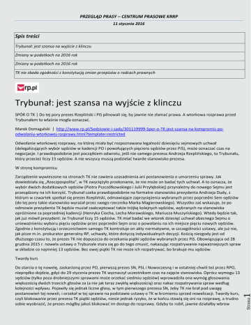 PRZEGLĄD PRASY – CENTRUM PRASOWE KRRP 11 stycznia 2016 Spis treści Trybunał: jest szansa na wyjście z klinczu Zmiany w podatkach na 2016 rok Zmiany w podatkach na 2016 rok TK nie zbada zgodności z konstytucją zmian przepisów o radcach prawnych Trybunał: jest szansa na wyjście z klinczu SPÓR O TK | Do tej pory prezes Rzepliński i PiS pilnowali się, by jawnie nie złamać prawa. A wtorkowa rozprawa przed Trybunałem to właśnie mogła oznaczać. Marek Domagalski | http://www.rp.pl/Sedziowie-i-sady/301119999-Spor-o-TK-jest-szansa-na-kompromis-poodwolaniu-wtorkowej-rozprawy.html?template=restricted Odwołanie wtorkowej rozprawy, na której miała być rozpoznawana legalność dziesięciu sejmowych uchwał (delegalizujących wybór sędziów w kadencji PO i powołujących pięcioro sędziów przez PiS), może oznaczać czas na negocjacje. I prawdopodobnie jest początkiem odwrotu, jeśli nie samego prezesa Andrzeja Rzeplińskiego, to Trybunału, który przecież liczy 15 sędziów. A nie wszyscy muszą podzielać twarde stanowisko prezesa. W stronę kompromisu Zarządzenie wywieszone na stronach TK nie zawiera uzasadnienia ani postanowienia o umorzeniu sprawy. Jak dowiedziała się „Rzeczpospolita”, w TK zwyciężyło przekonanie, że nie może on badać tych uchwał. A to oznacza, że wybór dwóch dodatkowych sędziów (Piotra Pszczółkowskiego i Julii Przyłębskiej) przynależny do nowego Sejmu jest przesądzony na ich korzyść. Trybunał czeka prawdopodobnie na formalne stanowisko prezydenta Andrzeja Dudy, z którym w czwartek spotkał się prezes Rzepliński, odmawiające zaprzysiężenia wybranych przez poprzedni Sem sędziów (do tej pory takie stanowisko wyrażał przez swego rzecznika Marka Magierowskiego). Wszystko zaś wskazuje, że po odmowie prezydenta TK będzie musiał zaakceptować także trójkę kolejnych sędziów, wybranych na stanowiska opróżnione za poprzedniej kadencji (Henryka Ciocha, Lecha Morawskiego, Mariusza Muszyńskiego). Wtedy będzie tak, jak już mówił prezydent: że Trybunał liczy 15 sędziów. TK miał badać we wtorek dziesięć uchwał obecnego Sejmu o unieważnieniu wyboru pięciu sędziów przez poprzedni Sejm oraz o powołaniu na ich miejsce pięciu nowych sędziów. Zgodnie z konstytucją i orzecznictwem samego TK kontroluje on akty normatywne, w szczególności ustawy, ale już nie, jak pisze m.in. prokurator generalny RP, uchwały, które dotyczą indywidualnych decyzji. Kością niezgody jest od dłuższego czasu to, że prezes TK nie dopuszcza do orzekania piątki sędziów wybranych przez PiS. Obowiązująca od 28 grudnia 2015 r. nowela ustawy o Trybunale stara się go do tego zmusić, nakazując rozpatrywanie najważniejszych spraw w składzie co najmniej 13 sędziów. Bez owej piątki TK nie może ich rozpatrywać, bo brakuje mu sędziów. Strona Do starcia o tę nowelę, zaskarżoną przez PO, pierwszą prezes SN, PSL i Nowoczesną i w ostatniej chwili też przez RPO, nieprędko dojdzie, gdyż do 29 stycznia prezes TK wyznaczył uczestnikom czas na zajęcie stanowiska. Oprócz wymogu 13 sędziów (tylko poza drobniejszymi sprawami może orzekać siedmiu sędziów) wprowadziła ona wymóg głosowania większością dwóch trzecich głosów za (a nie jak teraz zwykłą większością) oraz nakaz rozpatrywania spraw według kolejności wpływu. Pojawiły się jednak liczne głosy, w tym pierwszego prezesa SN, żeby TK nie brał pod uwagę postanowień tej noweli, i orzekał w tej sprawie na podstawie ustawy o TK w brzmieniu sprzed nowelizacji. Twardy kurs, czyli blokowanie przez prezesa TK piątki sędziów, niesie jednak ryzyko, że w końcu stawią się oni na rozprawę, a trudno sobie wyobrazić, że prezes mógłby jakoś blokować im dostęp do rozprawy. Gdyby to robił, jawnie działałby wbrew 1 Twardy kurs PRZEGLĄD PRASY – CENTRUM PRASOWE KRRP 11 stycznia 2016 prawu, mając przeciw sobie rząd, parlament i prezydenta. Można sobie wtedy wyobrazić wkroczenie policji i prokuratury w celu przywrócenia porządku. W tej sytuacji ostatnia decyzja TK może oznaczać coś więcej niż odroczenie sporu, może oznaczać początek kompromisu. Dodajmy, że jednym z argumentów w tym sporze, być może zbyt rzadko wskazywanym, jest ten, że zgodnie z art. 4 konstytucji władza zwierzchnia w RP należy do narodu, a naród sprawuje ją „przez swoich przedstawicieli lub bezpośrednio”. Zmiany w podatkach na 2016 rok Artur Podsiadły, Joanna Zawiejska-Rataj http://www.rp.pl/Postepowanie-podatkowe/301109960-Zmiany-w-podatkach-na-2016-rok.html?template=restricted Nowelizacja przepisów w istotny sposób modyfikuje instytucję tzw. czynności sprawdzających. Dotyczy także kontroli i postępowania podatkowego, w szczególności w zakresie właściwości organów oraz skutków jej niedochowania. Ustawa z 10 września 2015 r. o zmianie ustawy – Ordynacja podatkowa oraz niektórych innych ustaw wprowadza ponad 170 nowych regulacji. Większość ze znowelizowanych przepisów weszła w życie już 1 stycznia 2016 r., dlatego w niniejszym artykule przybliżamy wybrane, najważniejsze zmiany, które niesie ze sobą ustawa zmieniająca ordynację podatkową (dalej: o.p.), a które nie zostały omówione we wcześniejszych artykułach naszego cyklu. Jednolity plik kontrolny Ustawą o zmianie ordynacji podatkowej wprowadzono tzw. jednolity plik kontrolny, czyli plik o uzgodnionej strukturze logicznej, w którym podatnik będzie zobowiązany przekazywać na żądanie organu podatkowego księgi podatkowe (w całości lub części) oraz dowody księgowe za pomocą środków komunikacji elektronicznej lub na informatycznych nośnikach danych zarówno w postępowaniu podatkowym, jak i podczas kontroli podatkowej oraz w zakresie czynności sprawdzających, w tym w zakresie czynności sprawdzających u kontrahenta podatnika (tzw. kontrole krzyżowe). Szczegóły w rozporządzeniu Rozwiązaniem ma być wprowadzenie ujednoliconej postaci e