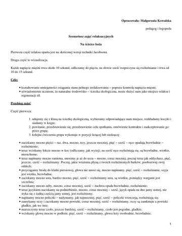 Opracowała: Małgorzata Kowalska pedagog i logopeda Scenariusz zajęć relaksacyjnych Na ścieżce łosia Pierwsza część relaksu oparta jest na skróconej wersji techniki Jacobsona. Druga część to wizualizacja. Każde napięcie mięśni trwa około 10 sekund, odliczamy do pięciu, na słowie sześć rozpoczyna się rozluźnianie i trwa od 10 do 15 sekund. Cele: • kształtowanie umiejętności osiągania stanu pełnego zrelaksowania − poprzez kontrolę napięcia mięsni; • uświadomienie uczniom, że naturalne środowisko − ścieżka ekologiczna, może służyć nam jako miejsce relaksu i regeneracji sił. Przebieg zajęć Część pierwsza: 1. udajemy się z klasą na ścieżkę ekologiczną, wybieramy odpowiadające nam miejsce, rozkładamy kocyki i siadamy w kręgu; 2. powitanie, przedstawienie się, przedstawienie celu spotkania, omówienie kontraktu i zaakceptowanie go przez grupę; 3. kolejne ćwiczenia grupa wykonuje w pozycji leżącej lub siedzącej: • zaciskamy mocno pięści − raz, dwa, mocno, trzy, jeszcze mocniej, pięć − sześć − ręce opadają bezwładnie − rozluźnienie; • teraz wciskamy łokcie mocno w koc (odliczamy, jak wyżej), na sześć ręce rozluźniają się, są bezwładne, wiotkie, nieruchome; • teraz napinamy mocno ramiona, unosimy je aż do uszu − mocno, coraz mocniej, poczuj teraz jak oddychasz, pięć, jeszcze, sześć − rozluźniamy. Poczuj, jakie wrażenia płyną z twoich rozluźnionych barków, poobserwuj swój oddech; • przyciągamy brodę do klatki piersiowej, głowa nie unosi się, mocno napinamy, pięć, sześć − rozluźnianie, szyja jest wiotka, bezwładna; • zaciskamy mocno usta, bardzo mocno, pięć, sześć − rozluźniamy usta, są wiotkie, pomiędzy wargami jest szczelina; • zaciskamy mocno zęby, mocno, coraz mocniej, sześć − żuchwa opada bezwładnie, rozluźnienie; • teraz językiem naciskamy na podniebienie, mocno, coraz mocniej − sześć, język opada na dno jamy ustnej, nie styka się z żadną częścią jamy ustnej, jest rozluźniony; • napinamy mocno policzki − nadymamy, jak najmocniej, pięć, sześć − policzki wiotczeją, rozluźniają się; • zamykamy oczy i zaciskamy mocno powieki, coraz mocniej, sześć − rozluźniamy, oczy są zamknięte a powieki gładkie, jak we śnie; • marszczymy teraz czoło, jeszcze bardziej, sześć − rozluźniamy, czoło jest pogodne, gładkie; • wciskamy głowę mocno w podłoże, pięć, sześć − rozluźniamy, głowa leży swobodnie, bezwładnie; 1 • wciskamy w koc plecy, łopatki. Obserwujemy swój oddech i to jak mięśnie są napięte. Sześć − rozluźnienie, poczujcie teraz swoje mięśnie; • napinamy mięśnie brzucha. Wciągnijcie brzuchy, mocno, coraz mocniej, poczujcie, jak teraz oddychacie, obserwujcie jakie wrażenia odbieracie z mięśni, sześć − rozluźniamy; • mocno wciskamy uda w podłoże, jakie wrażenia odbieracie z mięśni napiętych. Wciskamy jeszcze − sześć, rozluźniamy, mięśnie są bezwładne, odprężone; • wciskamy teraz łydki, mocno, poczujcie napięcie w łydkach, pięć, sześć − mięśnie wiotczeją, rozluźniają się; • wciskamy pięty w koc, mięśnie mocno naprężają się, poczujcie jak to jest, gdy w ciele są napięcia, sześć − rozluźnienie; • teraz napinamy palce stóp, ciągniemy je w stronę twarzy, pięć, sześć − palce odprężają się, wiotczeją, rozluźniają; • teraz napinamy całe ciało, zaciskamy pięści, wciskamy łokcie, unosimy ramiona, zaciskamy mocno usta, zęby, marszczymy powieki, czoło, wciskamy mocno plecy, napinamy brzuch, wciskamy uda, łydki, pięty, wyginamy palce stóp. Obserwujemy oddech, czujemy wszystkie napięte mięśnie. Sześć − rozluźniamy, odbieramy wrażenia jakie płyną z mięśni odprężonych, bezwładnych, rozluźnionych. Zęby, ani usta nie zaciskają się, pomiędzy wargami jest szczelinka. Część druga: 1. Stajemy prosto, unosimy powoli ręce i robimy głęboki wdech, powoli opuszczamy ręce i robimy wydech − powtarzamy trzy razy; 2. Układamy się wygodnie na kocykach, ręce wzdłuż tułowia, wewnętrzna dłoń skierowana ku górze, całe ciało rozluźnione, − jeśli czujesz napięcie w jakiejś części ciała poruszaj przez chwilę tą częścią; 3. Zamykamy oczy, całe ciało przylega do kocyka, wsłuchujemy się w odgłosy dobiegające do nas z otoczenia; 4. Język rozluźniony nie przylega do żadnej części w jamie ustnej, jest jak płatek kwiatu. Żuchwa opuszczona, usta nie zaciskają się, pomiędzy wargami jest szczelinka; 5. Skupiamy się na własnym oddechu − wdeeech i wydeeech, oddychamy równo, miarowo, własnym, naturalnym rytmem; 6. Śledzimy w myślach drogę powietrza przy wdechu i wydechu; 7. Kierujemy wydech do rąk i czujemy jak ręce coraz bardziej wiotczeją, stają się bezwładne, odprężone; 8. Skierujemy teraz oddech do nóg i poczujemy jak nogi stają się bardziej bezwładne i nieruchome; 9. Z każdym oddechem wasze ciała stają się coraz bardziej rozluźnione; 10. Wyobrażamy sobie łąkę, na której jesteśmy, czujemy pod sobą miękką trawę; 11. Świeci słońce a jego ciepłe promienie głaszczą naszą skórę, odczuwamy ciepły, przyjemny powiew wiatru, gdy skoncentrujemy się na swoich nosach poczujemy zapach trawy, kwiatów, ziemi; 12. Teraz zaczynamy nasłuchiwać, słyszymy śpiew ptaków, brzęczenie owadów, szum liści na wietrze; 13. Siadamy na miękkiej trawie, a przed nami płynie mały strumyczek, szum wody nas jeszcze bardziej uspokaja. Woda jest czysta, widać dno. Chcemy zanurzyć się w tym strumieniu, poczujcie jak ta krystaliczna woda przepływa przez wasze ciała, jak wypłukuje i oczyszcza was ze zmęczenia, obmywa z trosk czujemy, że wraz z wodą do naszego ciała wpływa głęboki spokój; 14. Wychodzimy z wody i siadamy na miękkiej trawie. Patrzymy na strumyk, po którym płyną różnokolorowe liście, przepływają obok nas, je