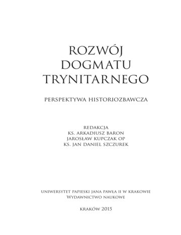 ROZWÓJ DOGMATU TRYNITARNEGO perspektywa historiozbawcza redakcja ks. arkadiusz baron jarosław kupczak op ks. jan daniel szczurek uniwersytet papieski jana pawła ii w krakowie Wydawnictwo naukowe kraków 2015 SPIS TREŚCI Jarosław Kupczak OP, ks. Jan Daniel Szczurek Wstęp . . . . . . . . . . . . . . . . . . . . . . . . . . . . . . . . . . . . . . . . . . . . . . . . . . . 5 Dariusz Kasprzak OFMCap Recepcja credo nicejskiego w nauczaniu synodalnym Kościoła zachodniego IV wieku . . . . . . . . . . . . . . . . . . . . . . . . . . . . 9 Dariusz Kasprzak OFMCap Polityczne i kulturowe konsekwencje sporów ariańskich w IV wieku . . . . . . . . . . . . . . . . 35 ks. Jan Daniel Szczurek Rozwój teologii Boga Ojca w soborowym nauczaniu Kościoła o Trójcy Świętej . . . . . . . . . . . 61 Tadeusz Kałużny SCJ Filioque na nowo odczytane. Katolicka i prawosławna recepcja dokumentu watykańskiego . . 107 Aleksandra Brzemia-Bonarek, ks. Szymon Drzyżdżyk Od chrztu w imię Jezusa do chrztu w imię Trójcy Świętej . . . . . . 139 Aleksandra Brzemia-Bonarek, ks. Szymon Drzyżdżyk Chrzest dziecka wbrew woli rodziców. Analiza teologiczno-prawna . . . . . . . . . . . . . . . . . . . . . . . . . . . . . . . . . 175 Wojciech Życiński SDB Dogmat maryjny w kontekście dogmatu trynitarnego. Perspektywa historiozbawcza . . . . . . . . . . . . . . . . . . . . . . . . . . . . . . . . 201 Paweł Holc CM Trójca Święta przyczyną sprawczą i wzorczą jedności Kościoła. Eklezjologiczne pryncypium na kanwie teologicznego dialogu katolicko-luterańskiego . . . . . . . 235 Jarosław Kupczak OP Trynitarny wymiar teologii imago Dei. Różne możliwości interpretacji . . . . . . . . . . . . . . . . . . . . . . . . . . . . . . 269 ks. Robert J. Woźniak Ontologia trynitarna i polityka. Uwagi na marginesie debaty Erika Petersona i Carla Schmitta o politycznej teologii . . . . . . . . . . 301 Noty o autorach . . . . . . . . . . . . . . . . . . . . . . . . . . . . . . . . . . . . . . . . . . . 319 Indeks osób . . . . . . . . . . . . . . . . . . . . . . . . . . . . . . . . . . . . . . . . . . . . . . 323