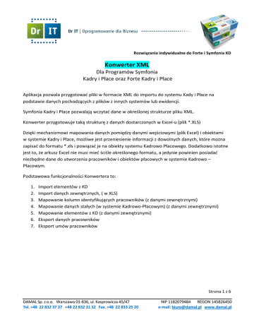 i Symfonia FK Rozwiązania indywidualne do Forte i Symfonia KD Konwerter XML Dla Programów Symfonia Kadry i Płace oraz Forte Kadry i Płace Aplikacja pozwala przygotować pliki w formacie XML do importu do systemu Kady i Płace na podstawie danych pochodzących z plików z innych systemów lub ewidencji. Symfonia Kadry i Płace pozwalają wczytać dane w określonej strukturze pliku XML. Konwerter przygotowuje taką strukturę z danych dostarczonych w Excel-u (plik *.XLS) Dzięki mechanizmowi mapowania danych pomiędzy danymi wejściowymi (plik Excel) i obiektami w systemie Kadry i Płace, możliwe jest przeniesienie informacji z dowolnych danych, które można zapisać do formatu *.xls i powiązać je na obiekty systemu Kadrowo Płacowego. Dodatkowo istotne jest to, że arkusz Excel nie musi mieć ściśle określonego formatu, a jedynie powinien posiadać niezbędne dane do utworzenia pracowników i obiektów płacowych w systemie Kadrowo – Płacowym. Podstawowa funkcjonalności Konwertera to: 1. 2. 3. 4. 5. 6. 7. Import elementów z KD Import danych zewnętrznych, ( w XLS) Mapowanie kolumn identyfikujących pracowników (z danymi zewnętrznymi) Mapowanie danych stałych (w systemie Kadrowo-Płacowym) (z danymi zewnętrznymi) Mapowanie elementów z KD (z danymi zewnętrznymi) Eksport danych pracowników Eksport umów pracowników Strona 1 z 6 DAMAL Sp. z o.o. Warszawa 01-836, ul. Kasprowicza 45/47 Tel. +48 22 832 37 37 +48 22 832 31 32 Fax. +48 22 833 25 20 NIP 1182079484 REGON 145826450 e-mail: [email protected] www.damal.pl i Symfonia FK Rozwiązania indywidualne do Forte i Symfonia KD Okno aplikacji Rysunek 1 - Okno Aplikacji Konwerter wczytuje dwa rodzaje plików: elementy z KDB oraz plik z danymi źródłowymi. Plik określonym w formacie *.xml jest generowany przez system Kadrowo-Płacowy na podstawie elementów zdefiniowanych w tym systemie do obsługi systemu płacowego określonego w przedsiębiorstwie. Dzięki temu plikowi możemy modyfikować strukturę danych wyjściowych, która będzie efektem konwersji aplikacji. Po wczytaniu danych zewnętrznych ( z Excel) informacje wyświetlają się w poszczególnych kolumnach, z nagłówkami pochodzącymi z Excela. Strona 2 z 6 DAMAL Sp. z o.o. Warszawa 01-836, ul. Kasprowicza 45/47 Tel. +48 22 832 37 37 +48 22 832 31 32 Fax. +48 22 833 25 20 NIP 1182079484 REGON 145826450 e-mail: [email protected] www.damal.pl i Symfonia FK Rozwiązania indywidualne do Forte i Symfonia KD Rysunek 2 Lista zaimportowanych danych Pierwszym krokiem po zaimportowaniu danych z Excel-a jest określenie parametrów, po których będziemy identyfikować poszczególnych pracowników w systemie Kadrowo-Płacowym. Służy do tego funkcjonalność umieszczona pod przyciskiem [Kolumny identyfikujące]. Wyboru dokonujemy na formularzu, przypisując poszczególnym danym osobowym identyfikującym dane pracowników w Kadrach, odpowiednie kolumny z wczytanych danych, a następnie wybieramy OK, Prezentuje to rysunek 3. Strona 3 z 6 DAMAL Sp. z o.o. Warszawa 01-836, ul. Kasprowicza 45/47 Tel. +48 22 832 37 37 +48 22 832 31 32 Fax. +48 22 833 25 20 NIP 1182079484 REGON 145826450 e-mail: [email protected] www.damal.pl i Symfonia FK Rozwiązania indywidualne do Forte i Symfonia KD Rysunek 3 Kolumny identyfikujące pracownika Po zidentyfikowaniu pracowników przechodzimy do mapowania danych podstawowych i elementów KD Mapowanie danych stałych – dotyczą one informacji ewidencyjnych pracowników i pozwolą dodać do systemu Kadrowego nowych pracowników z informacji otrzymanych z Excela. Na rysunku 4 w obszarze 1 znajdują się elementy stałe z systemu Kadrowego, w obszarze 2 widzimy kolumny danych wejściowych (w dolnym wierszu) i dane z nimi zmapowanie pochodzące od nazw danych z systemu Kadrowego. W obszarze 3 widzimy funkcjonalność dostępną podczas mapowania danych. Łączenie danych polega na połączeniu danych stały zaprezentowanych w obszarze 1 rys. 4 z danymi z arkusza zewnętrznego z obszaru 2 rys.4. Do jednego obiektu z Kadr można zmapować tylko jedną kolumnę z danych zewnętrznych. Możliwe jest przypisanie lub usunięcie przypisania danych, dzięki czemu można zmienić przypisania lub usunąć istniejące przypisanie. Obiekty z danych stałych, które mają powiązane dane zewnętrzne są wyróżnione znakiem przed nazwą Strona 4 z 6 DAMAL Sp. z o.o. Warszawa 01-836, ul. Kasprowicza 45/47 Tel. +48 22 832 37 37 +48 22 832 31 32 Fax. +48 22 833 25 20 NIP 1182079484 REGON 145826450 e-mail: [email protected] www.damal.pl i Symfonia FK Rozwiązania indywidualne do Forte i Symfonia KD Rysunek 4 - Mapowanie danych stałych Mapowanie danych KDB – dotyczą one informacji o umowach, składnikach, godzinach, i innych elementach Kadrowo-Płacowych związanych z pracownikami. Po zmapowaniu system przeniesie je do pliku xml, i poprzez niego pozwoli je dodać do systemu Kadrowego. Na rysunku 5 w obszarze 1 znajdują się elementy kadrowo-płacowe z systemu Kadrowego, w obszarze 2 widzimy kolumny danych wejściowych (w dolnym wierszu) i dane z nimi zmapowanie pochodzące od nazw danych z systemu Kadrowego. W obszarze 3 widzimy funkcjonalność dostępną podczas mapowania danych. Strona 5 z 6 DAMAL Sp. z o.o. Warszawa 01-836, ul. Kasprowicza 45/47 Tel. +48 22 832 37 37 +48 22 832 31 32 Fax. +48 22 833 25 20 NIP 1182079484 REGON 145826450 e-mail: [email protected] www.damal.pl i Symfonia FK Rozwiązania indywidualne do Forte i Symfonia KD Łączenie danych polega na połączeniu danych stały zaprezentowanych w obszarze 1 rys. 5 z danymi z arkusza zewnętrznego z obszaru 2 rys.5. Do jednego obiektu z Kadr można zmapować tylko jedną kolumnę z danych zewnętrznych. Możliwe jest przypisanie lub usunięcie przypisania danych, dzięki czemu można zmienić przypisania lub usunąć istniejące przypisanie. Obiekty z systemu Kadrowego, które mają powiązane dane zewnętrzne są wyróżnione znakiem przed nazwą W poniższym przykładzie mamy zmapowaną um