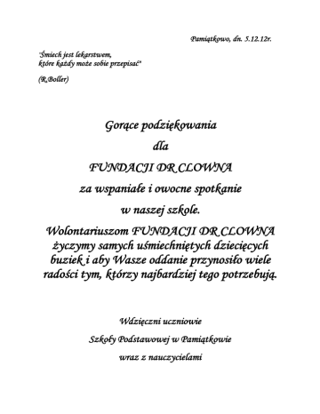 Pamiątkowo, dn. 5.12.12r. "Śmiech jest lekarstwem, które każdy może sobie przepisać" (R.Boller) Gorące podziękowania dla FUNDACJI DR CLOWNA za wspaniałe i owocne spotkanie w naszej szkole. Wolontariuszom FUNDACJI DR CLOWNA życzymy samych uśmiechniętych dziecięcych buziek i aby Wasze oddanie przynosiło wiele radości tym, którzy najbardziej tego potrzebują. Wdzięczni uczniowie Szkoły Podstawowej w Pamiątkowie wraz z nauczycielami