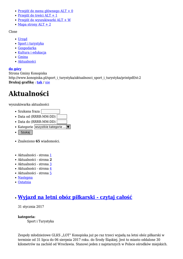 Przejdź do menu głównego ALT + 0 Przejdź do treści ALT + 1 Przejdź do wyszukiwarki ALT + W Mapa strony ALT + 2 Close Urząd Sport i turystyka Gospodarka Kultura i edukacja Gmina Aktualności do góry Strona Gminy Konopiska http://www.konopiska.pl/sport_i_turystyka/aktualnosci_sport_i_turystyka/printpdf/st:2 Drukuj grafikę : tak / nie Aktualności wyszukiwarka aktualności Szukana fraza Data od (RRRR-MM-DD) Data do (RRRR-MM-DD) Kategorie wszystkie kategorie ... ▼ Szukaj Znaleziono 65 wiadomości. Aktualności - strona 1 Aktualności - strona 2 Aktualności - strona 3 Aktualności - strona 4 Aktualności - strona 5 Następna Ostatnia Wyjazd na letni obóz piłkarski - czytaj całość 31 stycznia 2017 kategoria: Sport i Turystyka Zespoły młodzieżowe GLKS „LOT” Konopiska już po raz trzeci wyjadą na letni obóz piłkarski w terminie od 31 lipca do 06 sierpnia 2017 roku. do Środy Śląskiej. Jest to miasto oddalone 30 kilometrów na zachód od Wrocławia. Stanowi jeden z najstarszych w Polsce ośrodków miejskich. Oprócz bogatej historii, miasto dysponuje zarówno dobrą bazą treningową, jak i rekreacyjną. Wyjazd na letni obóz piłkarski Wyjazd na letni obóz piłkarski - czytaj całość Ferie z GCKIR - czytaj całość 16 stycznia 2017 kategoria: Sport i Turystyka Zapraszamy na zajęcia przygotowane przez GCKiR w okresie ferii zimowych Ferie z GCKIR Ferie z GCKIR - czytaj całość V Szachowe Mistrzostwa Gminy Konopiska 2016 – Finał czytaj całość 12 stycznia 2017 kategoria: Sport i Turystyka 8 stycznia 2017r. nastąpiło rozstrzygnięcie i rozdanie nagród w V Szachowych Mistrzostwach Gminy Konopiska. W 2016 roku w Gminnym Centrum Kultury i Rekreacji zawodnicy rozegrali jedenaście turniejów szachowych, których głównym celem było wyłonienie mistrza gminy w kategoriach wiekowych: senior, junior i junior młodszy. Rywalizacja była równie zacięta jak w poprzednich latach. V Szachowe Mistrzostwa Gminy Konopiska 2016 – Fi V Szachowe Mistrzostwa Gminy Konopiska 2016 – Finał - czytaj całość Urodziny zasłużonego dla gminy sportowca i trenera Stanisława Sączka - czytaj całość 05 stycznia 2017 kategoria: Sport i Turystyka 2 stycznia 2017r. Stanisław Sączek obchodził urodziny. Urodził się 02.01.1937 r. w Konopiskach i tutaj też spędził swoje lata młodzieńcze. Jest absolwentem Szkoły Podstawowej w Konopiskach i II Liceum Ogólnokształcącego im. R. Traugutta w Częstochowie. Sport jest zawsze obecny w jego życiu. Urodziny zasłużonego dla gminy sportowca i trene Urodziny zasłużonego dla gminy sportowca i trenera Stanisława Sączka - czytaj całość Nagrody sportowe Wójta rozdane! - czytaj całość 15 grudnia 2016 kategoria: Sport i Turystyka Po raz kolejny, 15 grudnia 2016 r. Jerzy Żurek Wójt Gminy Konopiska przyznał nagrody sportowe dla wyróżniającej się młodzieży. Za sukcesy sportowe 41 zawodników otrzymało nagrody, które osobiście wręczał fundator. Gratulujemy wszystkim, którzy osiągnęli tak dobre wyniki sportowe oraz przyczynili się do promowania naszej gminy. Nagrody sportowe Wójta rozdane! Nagrody sportowe Wójta rozdane! - czytaj całość Młodzik nadal na tarczy… - czytaj całość 14 grudnia 2016 kategoria: Sport i Turystyka W ostatnich meczach trzeciego etapu Wojewódzkiej Ligi Młodzika siatkarski zespól AZS 2020 Konopiska pojechał powalczyć o punkty do Michałkowic. W pierwszym swoim meczu chłopaki rywalizowali z drużyną MKS MTS Winner Czechowice Dziedzice. Niestety mimo ambitnej gry i tym razem rywal okazał się zbyt silny, mecz zakończył się zwycięstwem MKS 2-0 (25-18, 25-17). Młodzik nadal na tarczy… Młodzik nadal na tarczy… - czytaj całość Niezwykłe spotkanie z Marcinem Prusem – czterokrotnym mistrzem Polski w siatkówce! - czytaj całość 12 grudnia 2016 kategoria: Sport i Turystyka W piątek, drugiego grudnia br. do ZS w Konopiskach został zaproszony przez trenera SOS, nauczyciela wychowania fizycznego, p. Tomasza Kupczyka niezwykły gość – czterokrotny mistrz Polski w siatkówce – pan Marcin Prus, który w reprezentacji Polski grał w latach 1997-2001. Rozegrał 97 spotkań. Było to niewątpliwie niepowtarzalne spotkanie. Niezwykłe spotkanie z Marcinem Prusem – czterok Niezwykłe spotkanie z Marcinem Prusem – czterokrotnym mistrzem Polski w siatkówce! - czytaj całość Wręczenie tablicy z okazji jubileuszu 70-lecia klubu - czytaj całość 01 grudnia 2016 kategoria: Sport i Turystyka W dniu 29 listopada 2016r. podczas spotkania członków byłego oraz nowego zarządu klubu LOT KONOPISKA przekazane zostało prezesowi Rafałowi Jezierskiemu pamiątkowe tablo, wykonane z okazji obchodów jubileuszu 70-lecia istnienia klubu. Wręczenie tablicy z okazji jubileuszu 70-lecia kl Wręczenie tablicy z okazji jubileuszu 70-lecia klubu - czytaj całość PASJONAT SPORTOWEJ POLSKI 2016 - czytaj całość 29 listopada 2016 kategoria: Sport i Turystyka W tegorocznej edycji Wyróżnienia "Pasjonat Sportowej Polski" znalazło się 30 laureatów, którzy poprzez swoją pasję do sportu zachęcają dzieci, młodzież i dorosłych do zdrowego stylu życia, a także poprzez aktywne działania przyczyniają się do tworzenia infrastruktury sportowo-rekreacyjnej w Polsce. Wśród laureatów wyróżniony został mieszkaniec Konopisk Pan Stanisław Sączek. PASJONAT SPORTOWEJ POLSKI 2016 PASJONAT SPORTOWEJ POLSKI 2016 - czytaj całość Lot Konopiska. Rocznik 2008 w połowie stawki - czytaj całość 28 listopada 2016 kategoria: Sport i Turystyka W weekand został rozegrany największy turniej dla rocznika 2008 w naszym mieście. Zawodnicy walczyli o Puchar Prezydenta Miasta Częstochowa. Lot zajął przyzwoite 12 miejsce. Nasza drużyna dobrze się zaprezentowała. Młodzi zawodnicy dali z siebie wszystko, włożyli w grę o zwycięstwo dużo serca. Rozgrywki z drużynami z całej Polski będą miały pozytywny wpływ na umiejętności zawodników. Lot Konopiska. Rocznik 2