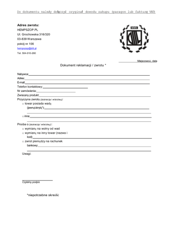 Do dokumentu należy dołączyć oryginał dowodu zakupu (paragon lub fakturę VAT) Adres zwrotu: HEMPSZOP.PL Ul. Grochowska 316/320 03-839 W arszawa pokój nr 106 [email protected] Tel. 504-010-260 Miejscowość, data Dokument reklamacji / zwrotu * Nabywca: Adres: E-mail: Telefon kontaktowy: Nr zamówienia: Zwracany produkt: Przyczyna zwrotu (zaznaczyć właściwą): o towar posiada wadę (jawną/ukrytą*): o inna: Prośba o (zaznaczyć właściwą):: o wymianę na wolny od wad o wymianę na inny towar (nazwa i kod): o zwrot pieniędzy na rachunek bankowy: Uwagi: Czytelny podpis *niepotrzebne skreślić