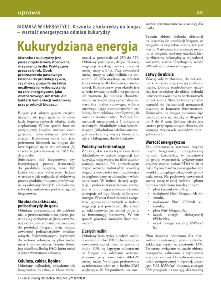 aktualności uprawa 34 BIOMASA W ENERGETYCE. Kiszonka z kukurydzy na biogaz – wartość energetyczna odmian kukurydzy Kukurydziana energia Kiszonka z kukurydzy jest paszą objętościową stosowaną w żywieniu bydła. Praktycznie przez cały rok. Obok przeznaczenia paszowego kiszonki do produkcji żywca, czy mleka, pojawiła się także możliwość jej wykorzystania na cele energetyczne, jako wartościowego substratu dla bakterii fermentacji metanowej przy produkcji biogazu. Biogaz jest silnym gazem cieplarnianym, ale jego spalenie w silnikach kogeneracyjnych obniża efekt cieplarniany. W ten sposób bowiem zastępujemy kopalne surowce energetyczne, odnawialnymi źródłami energii. Kukurydza sama lub jako poferment kiszonek na biogaz dobrze wpisuje się w ten schemat. Jej znaczenie jako biomasy na OZE będzie rosło. Substratem dla biogazowni wykorzystującej proces fermentacji do produkcji biogazu, może być każda odmiana kukurydzy. Jednak w trosce o jak najbardziej efektywny proces produkcji biogazu, preferowane są odmiany, których hodowla została ukierunkowana pod wymagania biogazowni. Skrobia do zakiszania, polisacharydy do gazu Odmiany przeznaczone do zakiszania, z przeznaczeniem na pasze, powinny się cechować większą zawartością skrobi, zaś odmiany przeznaczone do produkcji biogazu, mają wyższą zawartość polisacharydów strukturalnych. Najważniejszymi kryteriami do wyboru odmiany są plon suchej masy i termin zbioru. Termin zbioru jest określony liczbą FAO, która mówi o klasie wczesności odmiany. Celuloza, cukier, lignina Odmiany najbardziej przydatne dla biogazowni to takie, o klasie wcze- sności w przedziale od 250 do 370. Odmiany późniejsze, dzięki dłuższej wegetacji uzyskują wyższy przyrost suchej masy z 1 ha. Przy zawartości suchej masy w całej roślinie na poziomie 28-35% uzyskuje się substrat korzystniejszy dla fermentacji metanowej. Kukurydza w tym okresie jest w fazie tworzenia kolb i wypełniania ich ziarnem. Jej biomasa charakteryzuje się najbardziej optymalną zawartością białka surowego, włókna surowego i jego komponentów – celulozy, hemicelulozy oraz ligniny, jak również skrobi i cukru. Podczas fermentacji metanowej, z 1 kilograma strawnych składników ścian komórkowych (składników włókna surowego) uzyskuje się więcej biometanu, niż z 1 kilograma skrobi i cukrów. Podatny na fermentację Zmiany, jakie zachodzą w zawartości składników w trakcie wegetacji kukurydzy, mają wpływ na ilość uzyskiwanego metanu. Na początkowym etapie rozwoju kukurydzy powstają wegetatywne części roślin, zawierające węglowodany strukturalne ‒ włókno surowe. W trakcie dalszej wegetacji i podczas wykształcania ziarna, jest w nim magazynowana skrobia, postępuje też lignifikacja włókna surowego. Wzrost ilości skrobi i związków lignino-celulozowych w trakcie wegetacji jest powodem, dla którego taki surowiec jest mniej podatny na fermentację metanową. W ten sposób powstaje mniejsza ilość biometanu. Z całych roślin Odmiany kukurydzy z całych roślin, o wyższej liczbie FAO, zbierane przy zawartości suchej masy na poziomie około 30%, są lepszym substratem na biogaz niż odmiany wczesne, zbierane przy zawartości 40-45% suchej masy. Na biogaz preferowane są mieszańce odmian o liczbie FAO większej o 30-50 punktów, niż mie- 11/2016 twój doradca ROLNICZY RYNEK szańce przeznaczone na kiszonkę dla bydła. Termin zbioru zielonki zbieranej na kiszonkę do produkcji biogazu ze względu na dojrzałość ziarna, też jest ważny. Najwyższą koncentrację metanu w biogazie możemy uzyskać, kiedy zbieramy kukurydzę w dojrzałości woskowej ziarna. Uzyskujemy wtedy 54% udział metanu w biogazie. Łatwy do ubicia Ważną rolę w zbieranej do zakiszania kukurydzy odgrywa jej rozdrobnienie. Dobrze rozdrobniony materiał jest łatwiejszy do ubicia zielonki i stworzenia warunków beztlenowych do zakiszania. Stwarza też optymalne warunki do fermentacji metanowej kiszonki w komorze fermentatora. Kukurydza na biogaz powinna być rozdrabniana na sieczkę o długości od 4 do 8 mm. Krótsze cięcie jest istotne przy opóźnionym zbiorze, ale wymaga większych nakładów energetycznych. Wartość energetyczna Do opracowania wartości między innymi biogazowej i energetycznej odmian kukurydzy, w zależności od grupy wczesności, wykorzystano krajowe wyniki badań PDO w 2014 roku. Są one bardziej wiarygodne, niż wyniki z ubiegłego roku, kiedy panowała susza. Na podstawie zawartości suchej masy w całej roślinie i plonu biomasy wyliczono między innymi: R5 plon kiszonki w dt/ha, R5 wydajność Nm3, biogazu /dt kiszonki, R5 wydajność Nm3 CH4/dt kiszonki, R5 plon Nm3 biogazu/ha, R5 uzysk energii elektrycznej kWhel/ha, R5 uzysk energii cieplnej kWhec/ ha. Plon kiszonki obliczono dla pierwotnie uzyskanego plonu zielonki, zakładając straty na poziomie 12%. To straty związane w czasie zbioru, transportu, zakiszania i wybierania kiszonki z silosu. Do wyliczenia wartości energetycznej – łącznej, przyjęto 5,31 kWh/m3 biogazu, z czego 38% przypada na energię elektryczną aktualności uprawa 35 35 Tabela 1. Parametry charakteryzujące wydajność biogazową i energetyczną odmian kukurydzy kiszonkowej ze zbiorów doświadczalnictwa PDO w 2014 roku Odmiana Plon ŚM dt/ha Straty 12% Plon kiszonki dt/ha Sucha Masa % 72,5 531,9 33,9 Nm3dt Plon Nm3/ha biogaz CH4 metan biogaz CH4 metan KWhel/ha KWhec/ha 19,0 9,9 10106 5266 20392 24685 Odmiany wczesne Ricardinio 604,4 LG30240 601,2 72,1 529,1 33,7 18,9 9,8 9999 5185 20176 24424 Ambrosini 596,2 71,5 524,7 34,0 19,1 9,9 10022 5195 20222 24479 Pirro 567,6 68,1 499,5 34,9 19,6 10,3 9790 5145 19754 23913 średnia 604,4 71,1 521,3 34,1 19,1 9,9 9979 5198 20136 24375 Odmiany średniowczesne Prestoso 635,4 76,2 559,2 33,9 19,0 9,9 10625 5536 21439 25953 MAS 27L 625,1 75,0 550,1 34,2 19,2 10,0 10562 5501 21312 25794 Giancarlo 619,6 74,2 544,4 34,4 19,3 10,1 10507 5498 21201 256