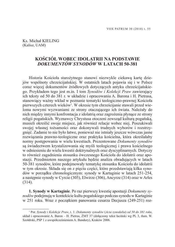 V O X PAT R U M 3 0 ( 2 0 1 0 ) t . 5 5 Ks. Michał KIELING (Kalisz, UAM) KOŚCIÓŁ WOBEC IDOLATRII NA PODSTAWIE DOKUMENTÓW SYNODÓW W LATACH 50-381 Historia Kościoła starożytnego stanowi niezwykle ciekawą kartę dziejów wspólnoty chrześcijańskiej. W ostatnich latach pojawia się i w Polsce coraz więcej dokumentów źródłowych dotyczących antyku chrześcijańskiego. Przykładem tego jest m.in. I tom Synodów i Kolekcji Praw zawierający ich teksty od 50 do 381 r. w układzie i opracowaniu A. Barona i H. Pietrasa, stanowiący ważny wkład w poznanie tematyki teologiczno-prawnej Kościoła pierwszych czterech wieków1. W okresie tym chrześcijanie stawali przed wieloma nowymi wyzwaniami ze strony otaczającego ich świata. Należały do nich między innymi konfrontacja z idolatrią oraz zagrożenia płynące ze strony religii pogańskich. Wyznawcy Chrystusa otoczeni zewsząd kulturą pogańską, musieli określić swoje miejsce, jak również relacje wobec niej. Poszukiwali swojej własnej tożsamości oraz dokonywali trudnych wyborów i rozstrzygnięć. Zadanie to nie było łatwe, ponieważ nie istniały jeszcze wówczas jasne rozwiązania prawno-teologiczne oraz praktyka kościelna, która określałaby normy postępowania w wielu kwestiach. Prezentowane Dokumenty synodów są świadectwem krystalizowania się myśli teologicznej i prawa kościelnego w odniesieniu do wielu kwestii doktrynalnych oraz dyscyplinarnych. Dotyczy to również zagadnienia stosunku ówczesnego Kościoła do idolatrii oraz apostazji. Przedmiotem naszego artykułu będzie analiza obradujących w latach 50-381 synodów, które podejmowały tematykę stosunku Kościoła do idolatrii w tym okresie. Składa się on z pięciu części, które przedstawiają kilka synodów w porządku chronologicznym: synody w Kartaginie w latach 251-254, a następnie synody w Cyrcie (305), Elwirze (306), Ancyrze (314) oraz w Arles (314). 1. Synody w Kartaginie. Po raz pierwszy kwestię apostazji Dokumenty synodów podejmują w kontekście kultu pogańskiego podczas synodu w Kartaginie w 251 roku. Wraz z początkiem panowania cesarza Decjusza (249-251) roz1 Por. Synody i Kolekcje Praw, t. 1: Dokumenty synodów (Acta synodalia) od 50 do 381 roku, układ i opracowanie A. Baron – H. Pietras, ŹMT 37 (dołączony tekst łaciński wg PL 3, tłum. W. Szołdrski, PSP 1 z uwspółcześnieniem A. Bandury), Kraków 2006. 276 KS. MICHAŁ KIELING poczęły się pierwsze w historii chrześcijaństwa powszechne prześladowania chrześcijan. W grudniu 249 r. miały miejsce pierwsze aresztowania; w lutym 250 r. śmierć męczeńską poniósł biskup Rzymu Fabian, jak również inni biskupi: Pioniusz, biskup Smyrny, Aleksander, biskup Jerozolimy, i Babylas, biskup Antiochii. Wydany przez Decjusza w 250 r. edykt o składaniu ofiar przed komisją rządową nakazywał mieszkańcom cesarstwa złożenie ofiary dla bogów i udział w pogańskim supplicatio w określonym miejscu i terminie. W związku z tym powołano komisje, które kontrolowały złożenie ofiar i wydawały odpowiednie zaświadczenie (libellus sacrificationis). Po pewnym czasie egzekwowano te zaświadczenia; każdy kto odmówił złożenia ofiary pogańskiej, podlegał karze więzienia, podczas której próbowano złamać jego opór za pomocą tortur. Prześladowanie to wymierzone było szczególnie w hierarchię kościelną. Według Cypriana z Kartaginy i Dionizego Aleksandryjskiego w Afryce Północnej i Egipcie liczba tych, którzy ulegli edyktowi Decjusza, była duża. Wielu chrześcijan w Afryce uniknęło prześladowań posługując się fałszywymi zaświadczeniami. Byli to tzw. libellatici, których postępek nie był tak mocno napiętnowany, jak tzw. thurificati, czyli tych, którzy złożyli ofiarę kadzielną, lub sacrificati czyli tych, którzy dokonali złożenia pełnej ofiary przed bóstwem pogańskim2. Chrześcijan, którzy ulegli nakazowi edyktu nazywano lapsi (upadli). Ci natomiast, którzy w czasie prześladowań byli aresztowani i więzieni, nazywani byli confessores (wyznawcy). Cieszyli się oni wielkim autorytetem i mogli poręczać za „upadłych” przy pomocy tzw. „listów pokoju” wobec biskupa, który mógł przyjąć ich ponownie do wspólnoty Kościoła3. Po ustaniu prześladowań w 251 r. należało rozwiązać problem lapsi. W tym też roku zwołano w Kartaginie synod, na czele którego stanął biskup Cyprian. Synod zajął się upadłymi i sprawą Felicissimusa oraz Nowacjana. Teksty tego pierwszego synodu w Kartaginie dotyczące upadłych datowane są na 15 maja 251 r. i zawierają trzy listy św. Cypriana4. Synod w Kartaginie postanowił, aby upadłym dać możliwość powrotu do Kościoła przez odpowiedni okres pokuty po zbadaniu każdego poszczególnego wypadku. W Liście 55 Cypriana, czytamy, że po ustaniu prześladowań zaistniała możliwość zwołania synodu i podjęcia postanowień wobec upadłych. Biskupi zdecydowali się obrać drogę pośrednią – „po dłuższym rozważeniu «za» i «przeciw» odnośnych tekstów Pisma Świętego” 5. Motywacją tak wyPor. B. Kumor, Historia Kościoła, t. 1, Lublin 2001, 47-48; H. Jedin, Handbuch der Kirchengeschichte, Bd. 1, Freiburg – Basel – Wien 1999, 255-258; A. Di Berardino, Libellus, NDPAC II 2814-2816; S. Longosz, Libellus – libelli, EK X 939-943. 3 Por. H. Pietras, Początki teologii Kościoła, Kraków 2000, 33-34; H.J. Vogt, Lapsi, NDPAC II 2737-2739; P. Szczur, Lapsi, EK X 495-496. 4 Por. Cyprianus, Epistulae 55-57, CCL 3B, 256-310, w: Acta synodalia, ŹMT 37, 6-8. 5 Cyprianus, Epistula 55, 6, 1, ŹMT 37, 6: „Zgodnie z obietnicą, skoro tylko prześladowanie się skończyło i zaistniała możliwość urządzenia synodu, zebrała się znaczna liczba biskupów, uratowanych siłą wiary i Boską opieką. Po dłuższym rozważaniu «za» i «przeciw» odnośnych tek2 KOŚCIÓŁ WOBEC IDOLOLATRII 277 ważonego stanowiska było przekonanie, aby z jednej strony nie pozb