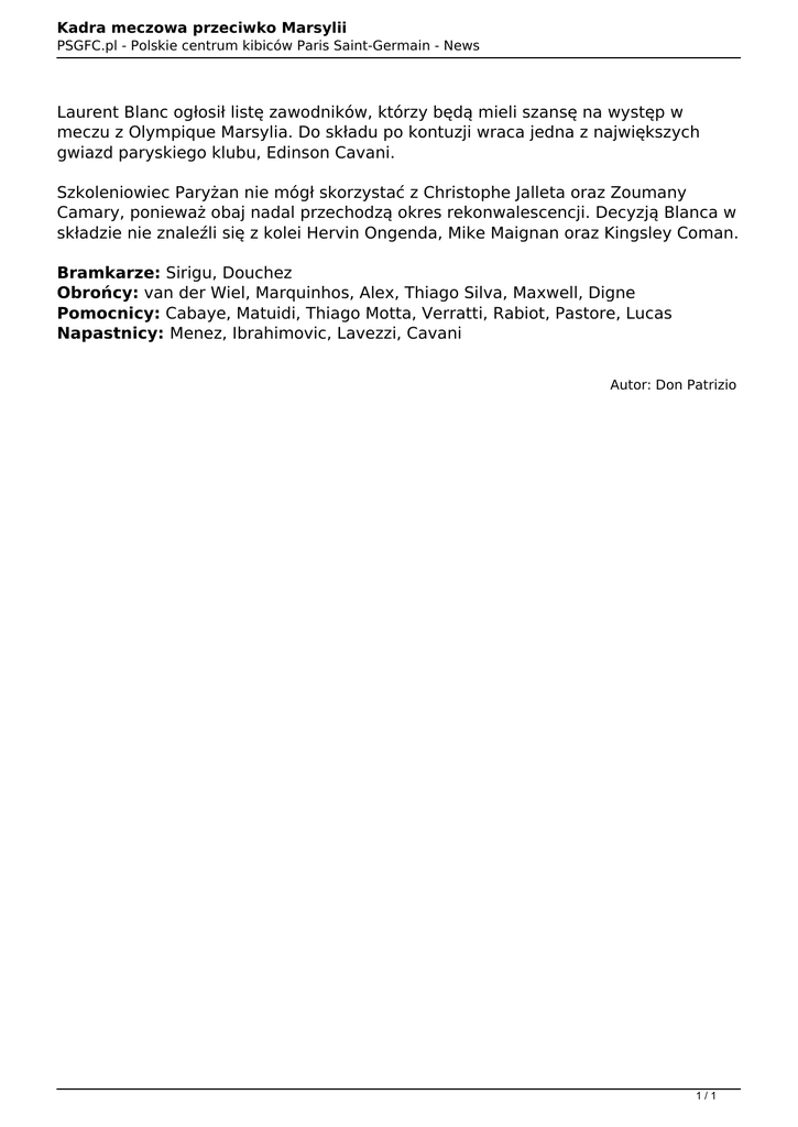 Kadra meczowa przeciwko Marsylii PSGFC.pl - Polskie centrum kibiców Paris Saint-Germain - News Laurent Blanc ogłosił listę zawodników, którzy będą mieli szansę na występ w meczu z Olympique Marsylia. Do składu po kontuzji wraca jedna z największych gwiazd paryskiego klubu, Edinson Cavani. Szkoleniowiec Paryżan nie mógł skorzystać z Christophe Jalleta oraz Zoumany Camary, ponieważ obaj nadal przechodzą okres rekonwalescencji. Decyzją Blanca w składzie nie znaleźli się z kolei Hervin Ongenda, Mike Maignan oraz Kingsley Coman. Bramkarze: Sirigu, Douchez Obrońcy: van der Wiel, Marquinhos, Alex, Thiago Silva, Maxwell, Digne Pomocnicy: Cabaye, Matuidi, Thiago Motta, Verratti, Rabiot, Pastore, Lucas Napastnicy: Menez, Ibrahimovic, Lavezzi, Cavani Autor: Don Patrizio 1/1 Powered by TCPDF (www.tcpdf.org)