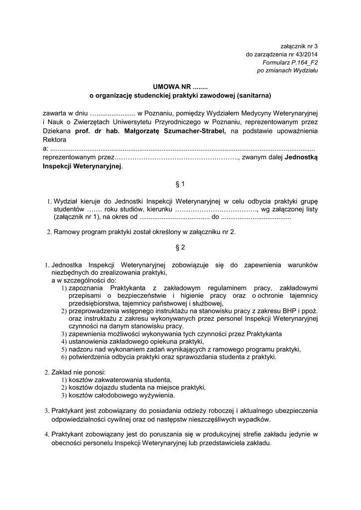 załącznik nr 3 do zarządzenia nr 43/2014 Formularz P.164_F2 po zmianach Wydziału UMOWA NR ........ o organizację studenckiej praktyki zawodowej (sanitarna) zawarta w dniu …..................... w Poznaniu, pomiędzy Wydziałem Medycyny Weterynaryjnej i Nauk o Zwierzętach Uniwersytetu Przyrodniczego w Poznaniu, reprezentowanym przez Dziekana prof. dr hab. Małgorzatę Szumacher-Strabel, na podstawie upoważnienia Rektora a: ............................................................................................................................................... reprezentowanym przez……………………………………………….., zwanym dalej Jednostką Inspekcji Weterynaryjnej. §1 1. Wydział kieruje do Jednostki Inspekcji Weterynaryjnej w celu odbycia praktyki grupę studentów ……. roku studiów, kierunku ………………………………., wg załączonej listy (załącznik nr 1), na okres od ...................................... do ...................................... 2. Ramowy program praktyki został określony w załączniku nr 2. §2 1. Jednostka Inspekcji Weterynaryjnej zobowiązuje się do zapewnienia warunków niezbędnych do zrealizowania praktyki, a w szczególności do: 1) zapoznania Praktykanta z zakładowym regulaminem pracy, zakładowymi przepisami o bezpieczeństwie i higienie pracy oraz o ochronie tajemnicy przedsiębiorstwa, tajemnicy państwowej i służbowej, 2) przeprowadzenia wstępnego instruktażu na stanowisku pracy z zakresu BHP i ppoż. oraz instruktażu z zakresu wykonywanych przez personel Inspekcji Weterynaryjnej czynności na danym stanowisku pracy. 3) zapewnienia możliwości wykonywania tych czynności przez Praktykanta 4) ustanowienia zakładowego opiekuna praktyki, 5) nadzoru nad wykonaniem zadań wynikających z ramowego programu praktyki, 6) potwierdzenia odbycia praktyki oraz sprawozdania studenta z praktyki. 2. Zakład nie ponosi: 1) kosztów zakwaterowania studenta, 2) kosztów dojazdu studenta na miejsce praktyki, 3) kosztów całodobowego wyżywienia. 3. Praktykant jest zobowiązany do posiadania odzieży roboczej i aktualnego ubezpieczenia odpowiedzialności cywilnej oraz od następstw nieszczęśliwych wypadków. 4. Praktykant zobowiązany jest do poruszania się w produkcyjnej strefie zakładu jedynie w obecności personelu Inspekcji Weterynaryjnej lub przedstawiciela zakładu. 5. Uczelnia oświadcza, iż Praktykant posiada aktualne orzeczenie lekarskie o braku przeciwwskazań do pracy w zakresie produkującym żywność pochodzenia zwierzęcego. 6. Jednostka Inspekcji Weterynaryjnej może żądać od Wydziału odwołania z praktyki studenta, który w rażący sposób naruszył dyscyplinę pracy lub spowodował zagrożenie zdrowia lub życia. §3 1. Wydział zobowiązuje się do sprawowania nadzoru dydaktycznego nad przebiegiem praktyki zawodowej studentów. 2. Przełożonym studentów odbywających praktykę zawodową jest koordynator praktyk, powołany przez dziekana. 3. Koordynator praktyk odpowiada za ich realizację zgodnie z ramowym programem oraz jest upoważniony, wspólnie z kierownictwem Jednostki Inspekcji Weterynaryjnej, do rozstrzygania spraw związanych z przebiegiem praktyki. 4. Koordynator praktyk ma prawo do kontroli obecności Praktykanta w czasie trwającego szkolenia. Koordynator informuje dyrektora Jednostki Inspekcji Weterynaryjnej o zamiarze przeprowadzenia nieplanowanej kontroli. §4 Wszelkie zmiany umowy wymagają formy pisemnej pod rygorem nieważności. §5 Niniejsza umowa została sporządzona w dwóch jednobrzmiących egzemplarzach, po jednym dla każdej ze Stron. osoba reprezentująca Jednostkę Inspekcji Weterynaryjnej pieczęć i podpis Dziekana Załącznik nr 1 do umowy nr …….…………. z dnia …..………………….. o organizację studenckiej praktyki sanitarnej Lista studentów skierowanych na praktykę do ………………………………………………………...... nazwa i adres instytucji L.p. Uwagi: Imię i nazwisko studenta Termin Załącznik nr 2 do umowy nr ….…………. z dnia …..………………….. o organizację studenckiej praktyki sanitarnej Ramowy program 2.- tygodniowej praktyki sanitarnej na kierunku studiów Weterynaria, jednolite studia magisterskie Wydział Medycyny Weterynaryjnej i Nauk o Zwierzętach Miejsce praktyk: Jednostki Inspekcji Weterynaryjnej Celem podstawowym jest: nabycie umiejętności praktycznych, uzupełniających i pogłębiających kompetencje uzyskane przez studenta w trakcie zajęć dydaktycznych szczególnie: Strukturę organizacyjną ubojni Zadania nadzoru sanitarno-weterynaryjnego nad skupem i transportem zwierząt rzeźnych Zadania nadzoru sanitarno-weterynaryjnego w ubojni zwierząt rzeźnych Postępowanie formalno-prawne związane z przyjęciem zwierząt rzeźnych do ubojni. Technikę badania przedubojowego Metody oszołamiania i uboju zwierząt rzeźnych Poubojową obróbkę technologiczną tusz zwierzęcych Organizację i technikę poubojowego badania mięsa Zasady pobierania próbek mięsa do badań laboratoryjnych Metody badania trychinoskopowego Ocenę mięsa zwierząt rzeźnych Postępowanie z mięsem niezdatnym do spożycia Postępowanie z materiałami szczególnego ryzyka Zasady mycia i dezynfekcji pomieszczeń, maszyn i urządzeń oraz środków transportu zwierząt i mięsa Zasady oczyszczania ścieków w ubojniach Wymagania sanitarne dotyczące lokalizacji i budowy ubojni oraz pomieszczeń i linii technologicznych Zasady prowadzenia dokumentacji sanitarno-weterynaryjnej w ubojni Aktualne przepisy sanitarno-weterynaryjne. Praktyka powinna obejmować: szkolenie BHP na stanowisku pracy, poznanie zakładu pracy – lokalizacja, organizacja, kierunki działania, stosowane metody i technologie, zadania mieszczące się w tematyce sanitarnej, opisanie wykonywanych zadań i wyciąganie wniosków (dzienniczek praktyk). Osoby odpowiedzialne za realizację praktyki: Kierunkowy Koordynator praktyk: dr n.